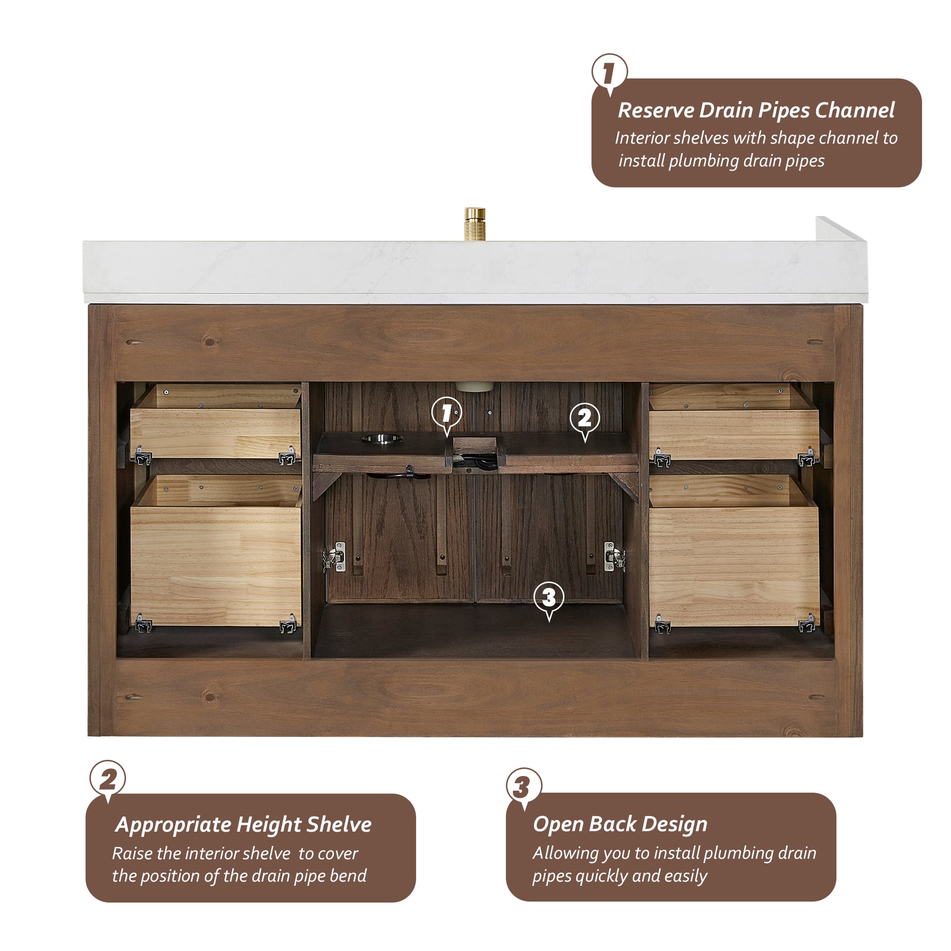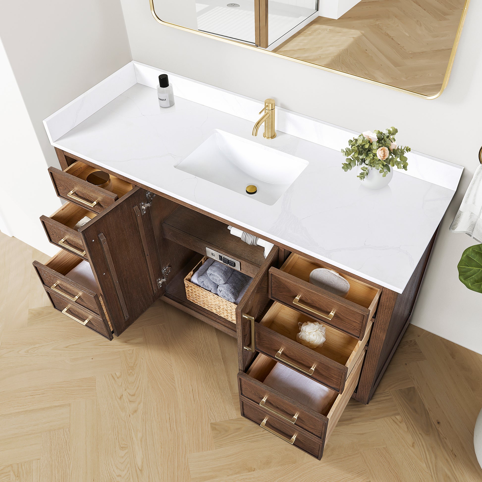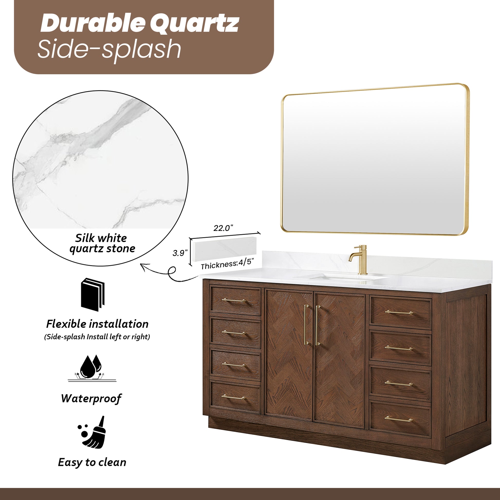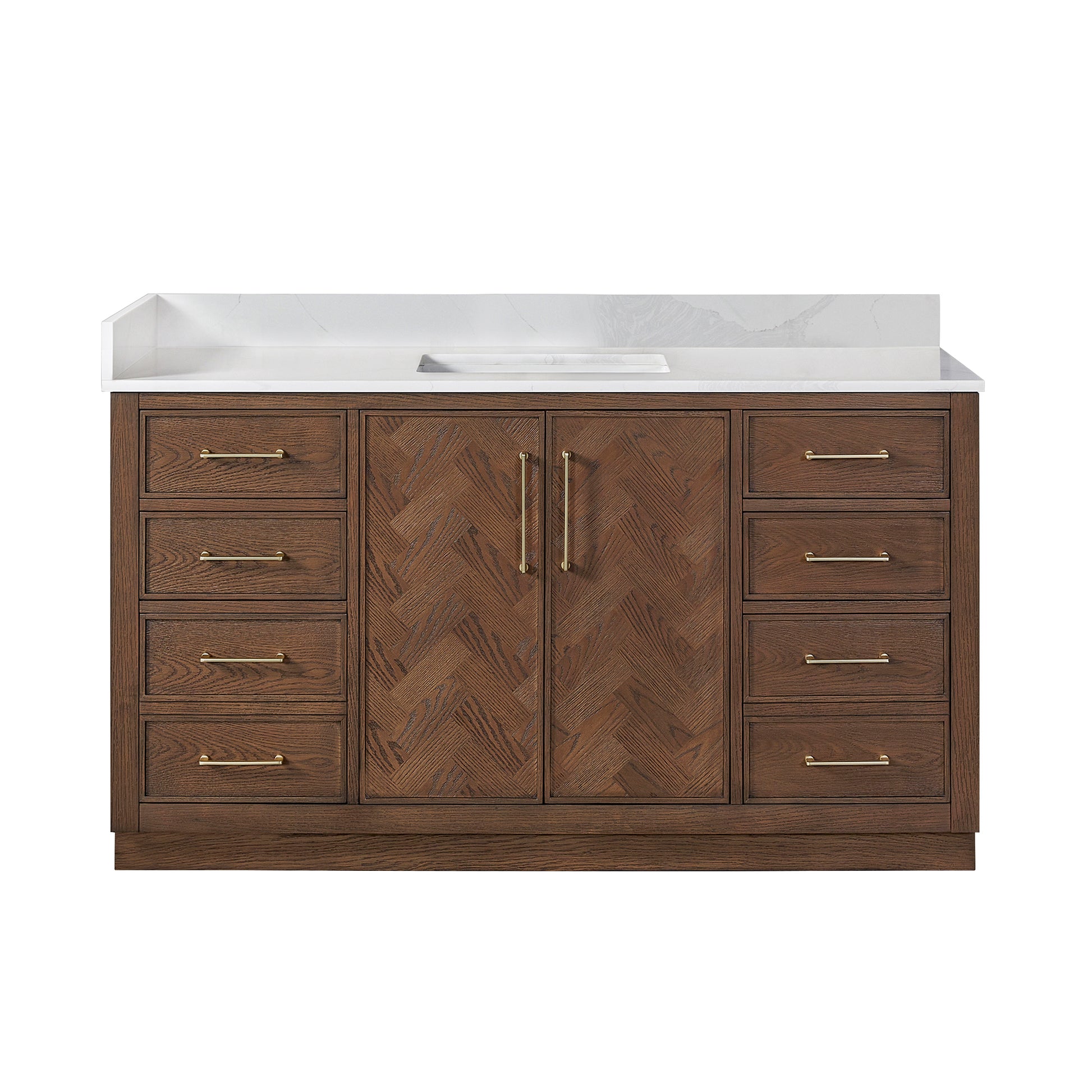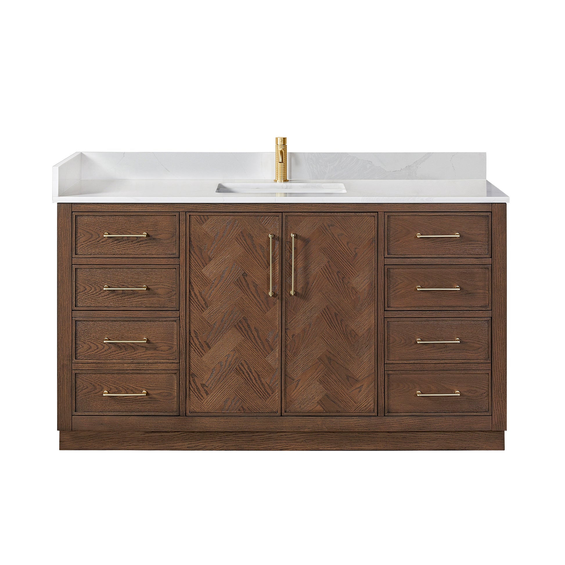 Vinnova, Jakarta 60" Freestanding Single Bath Vanity in Aged Dark Brown Oak with Silk White Quartz Stone Top