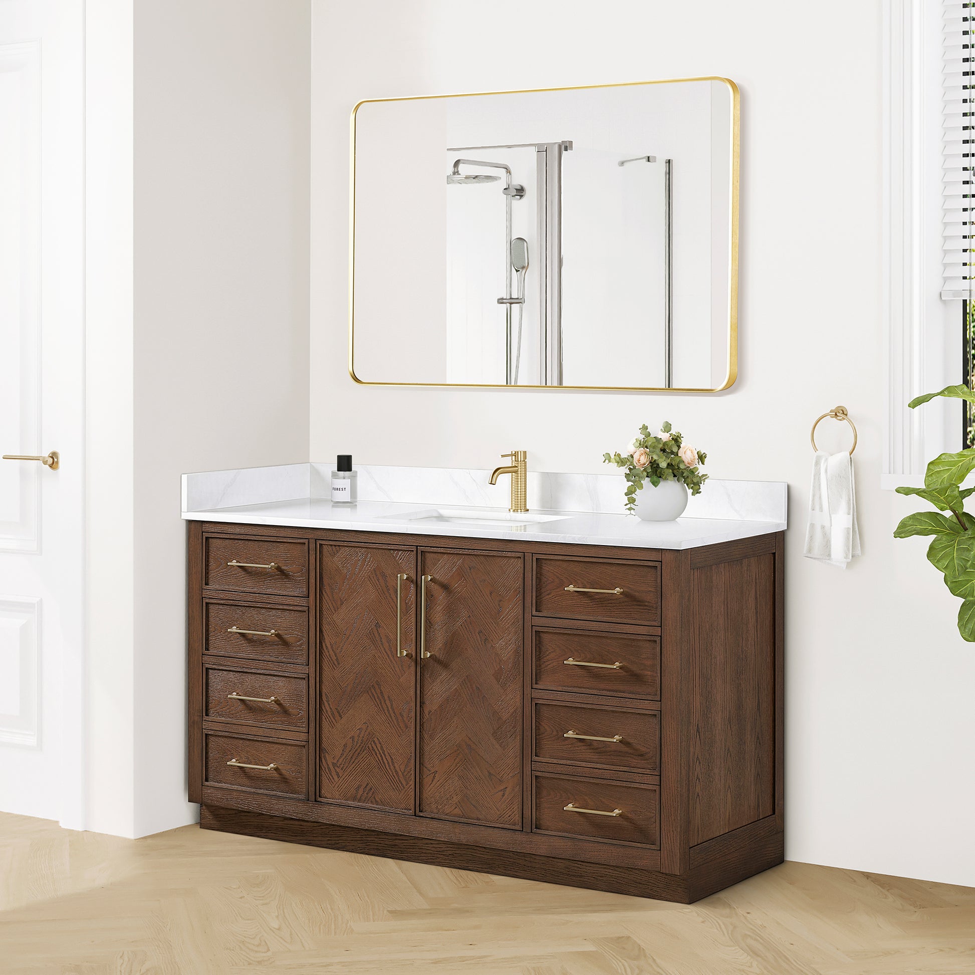 Transform your bathroom with the "Jakarta 60" Freestanding Single Bath Vanity in Aged Dark Brown Oak with Silk White Quartz Stone Top. This stunning vanity combines modern style with functionality, providing ample storage space and a luxurious design.
