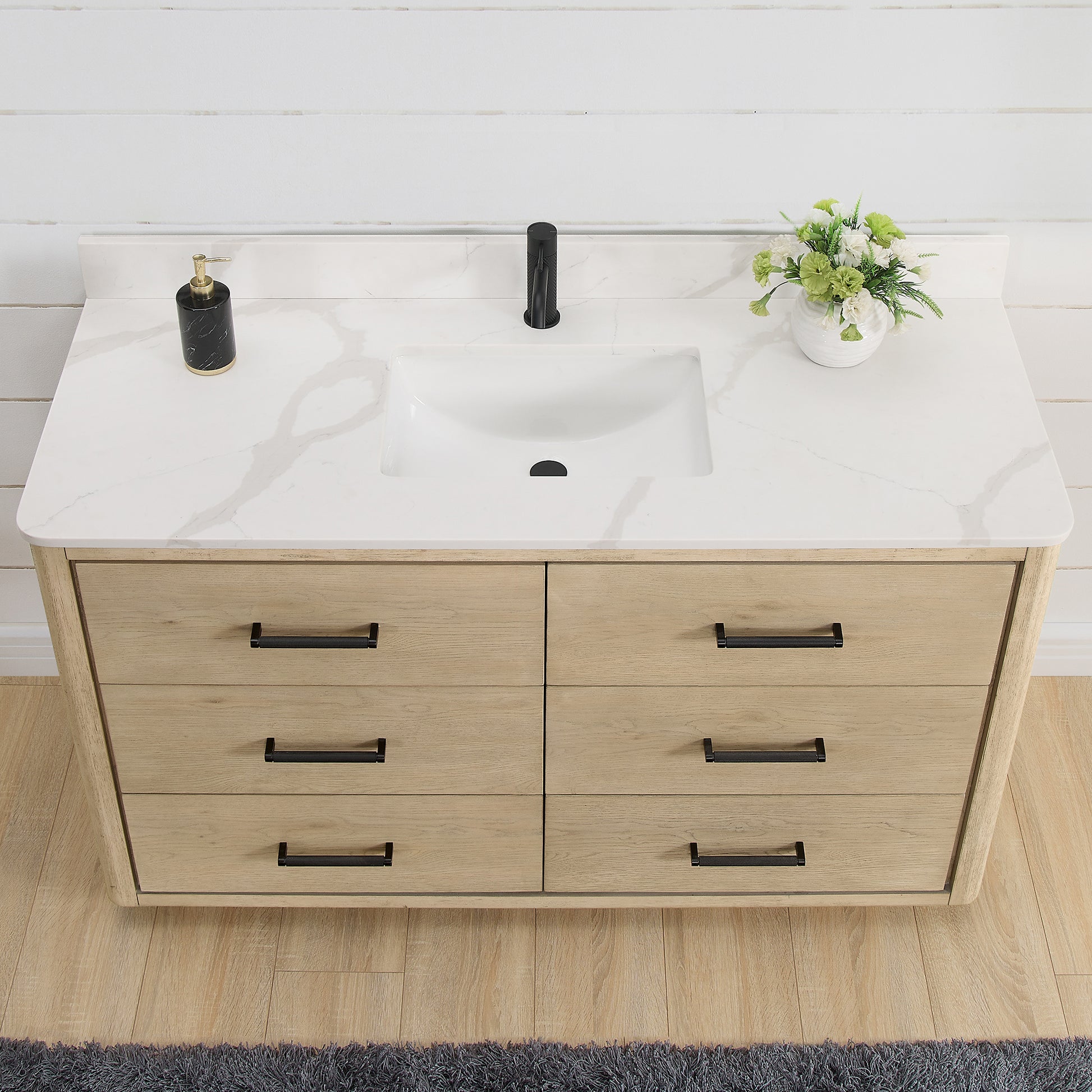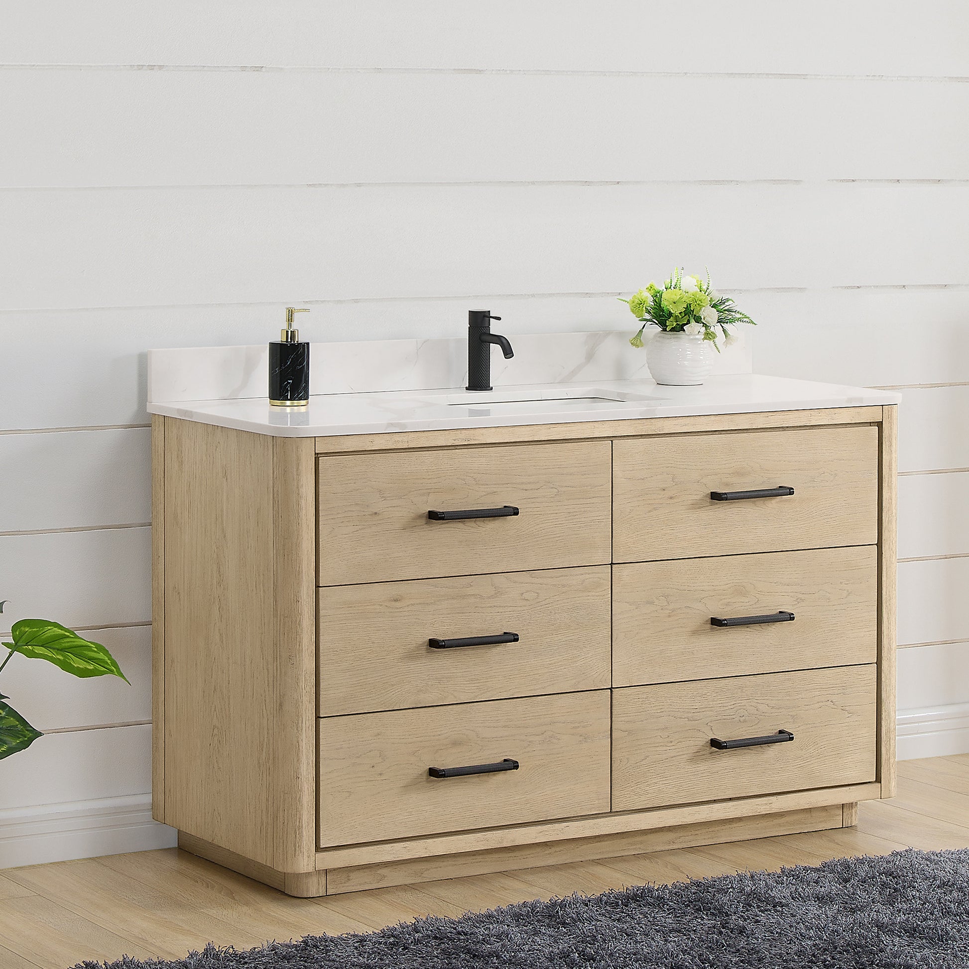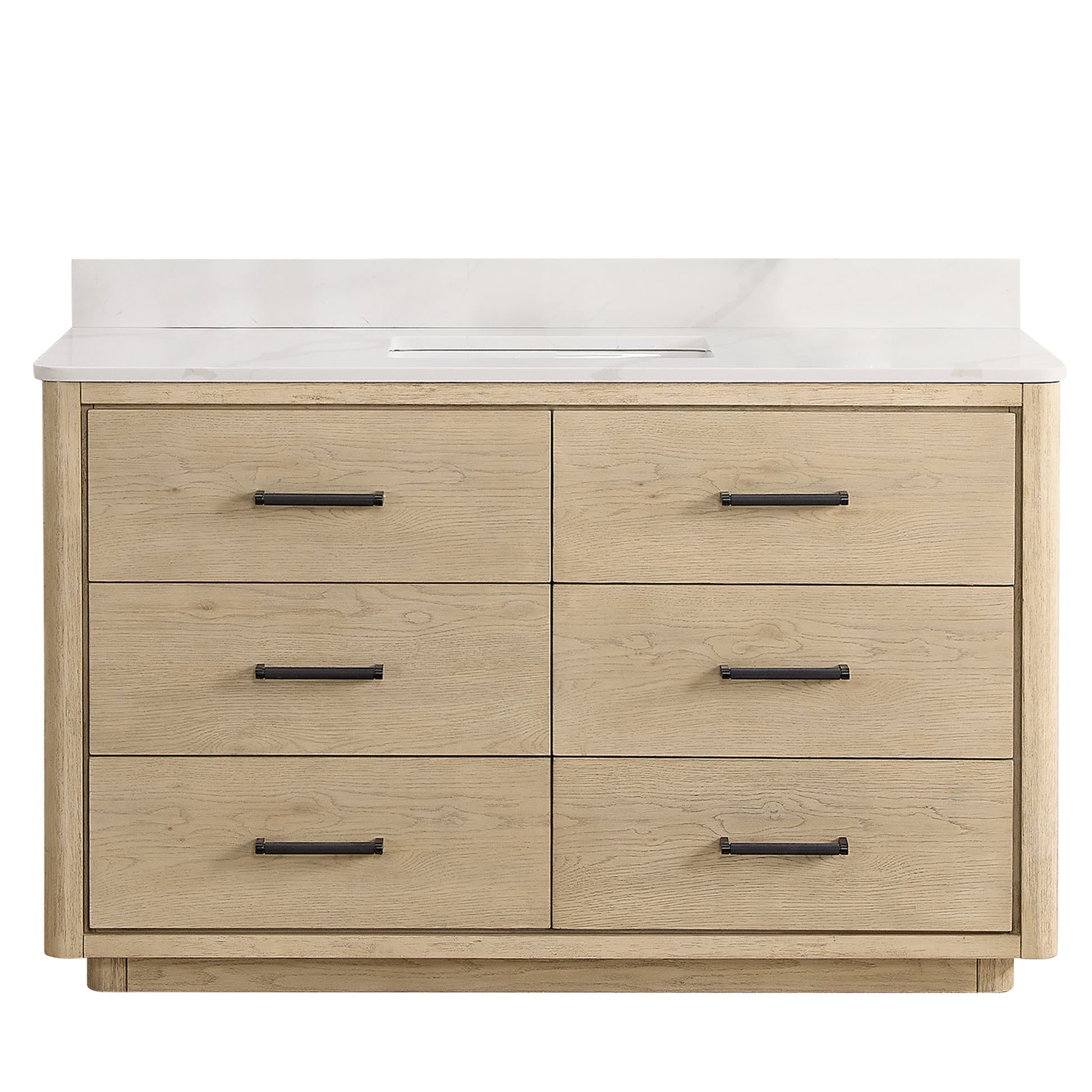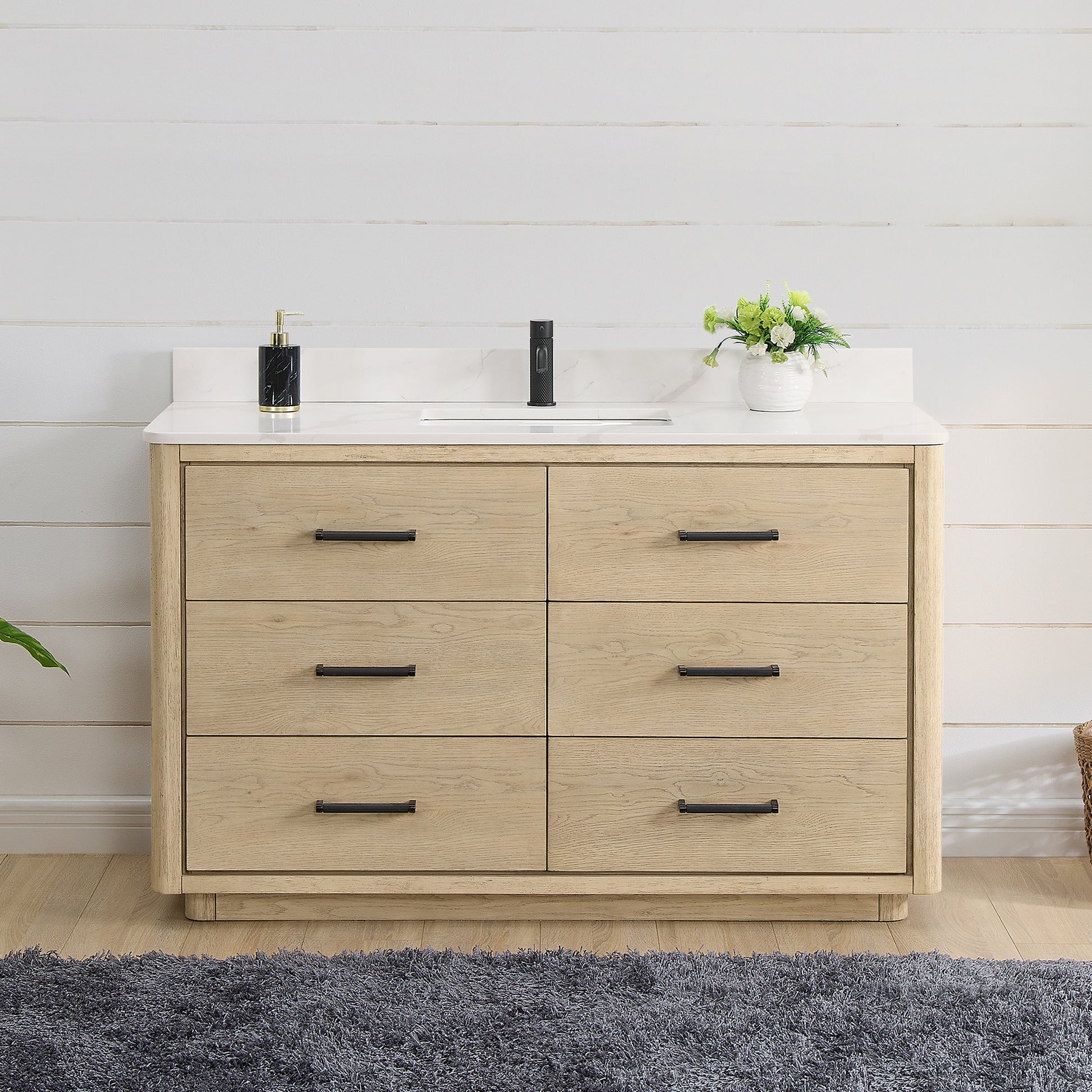 Transform your bathroom with the "Porto 55" Free-standing Single Bath Vanity in Aged Natural Oak with Fish Maw White Quartz Stone Top today!