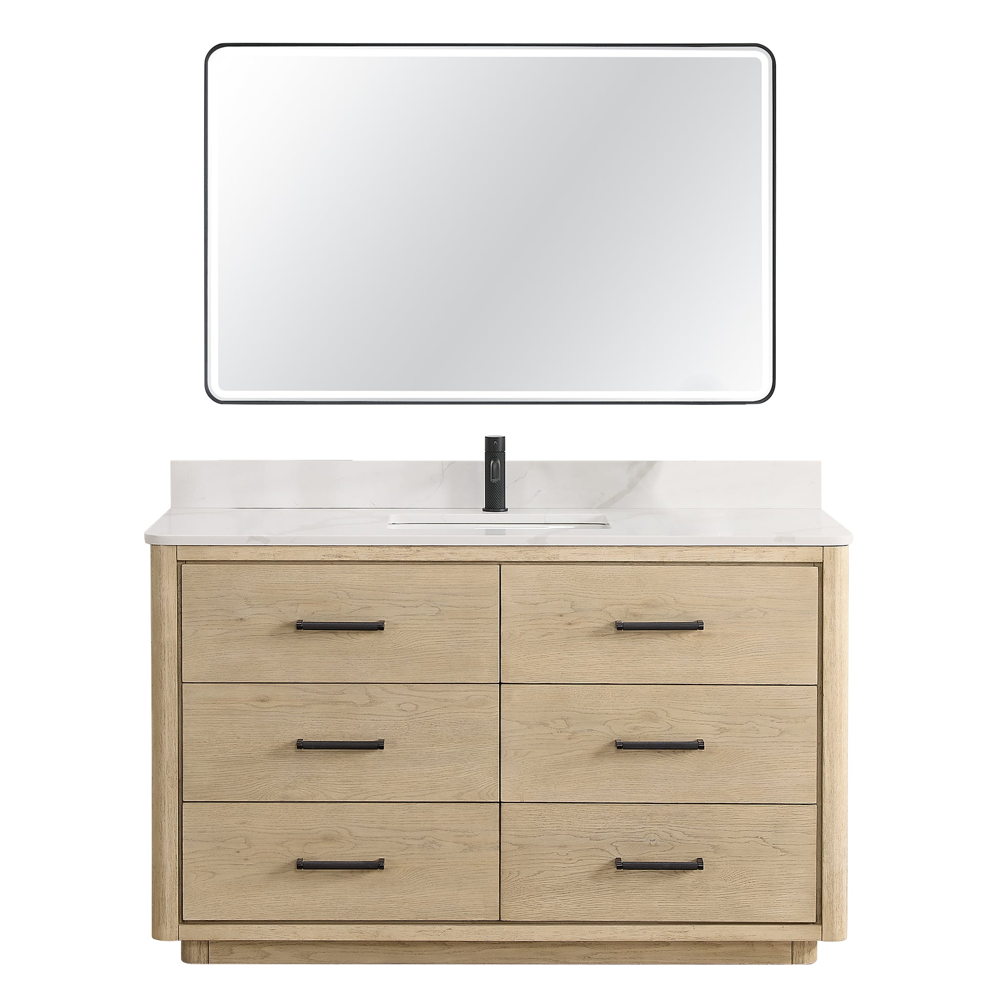 Vinnova, Porto 55" Free-standing Single Bath Vanity in Aged Natural Oak with Fish Maw White Quartz Stone Top and Mirror