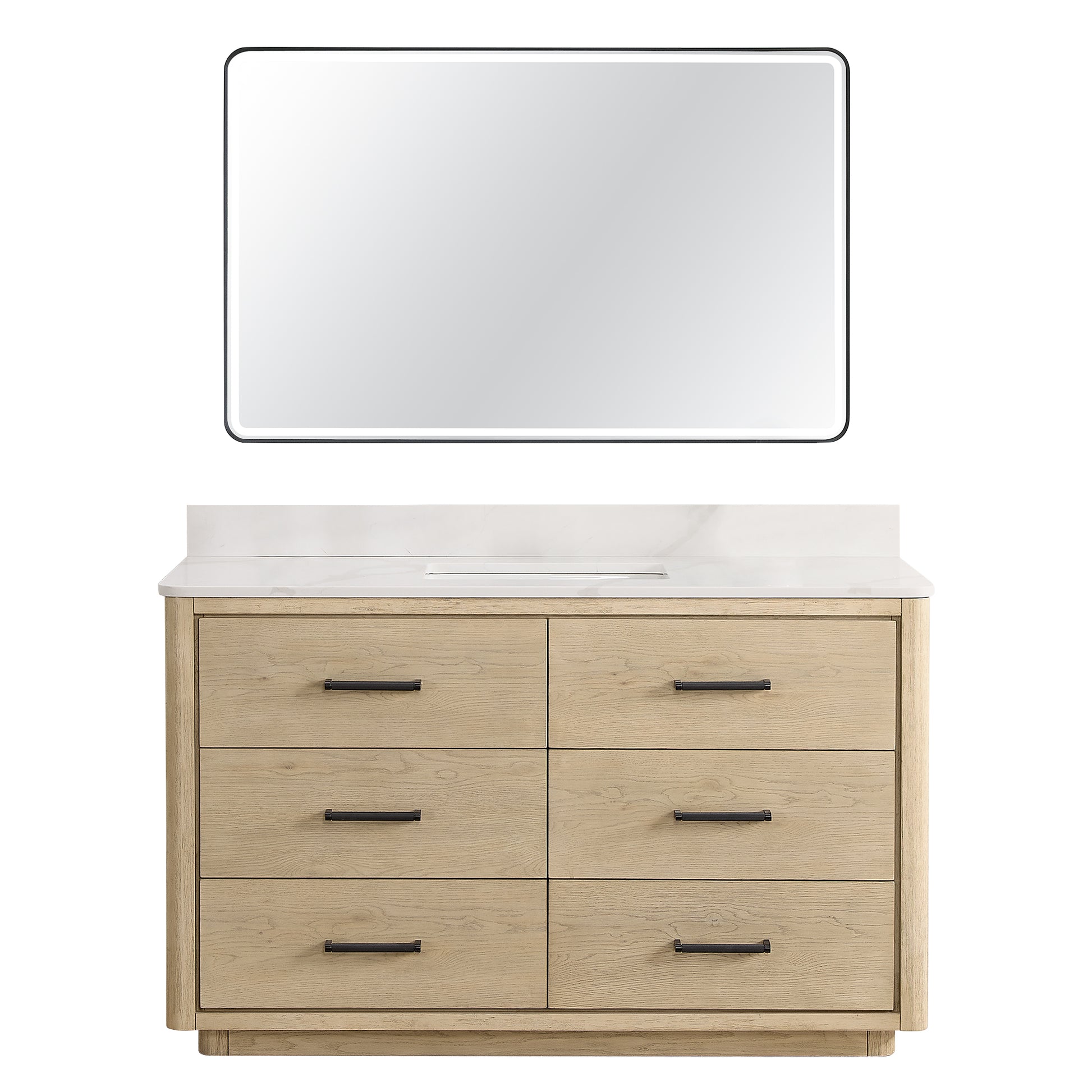 Upgrade your bathroom with the Porto 55 Free-standing Single Bath Vanity in Aged Natural Oak with Fish Maw White Quartz Stone Top and Mirror today!
