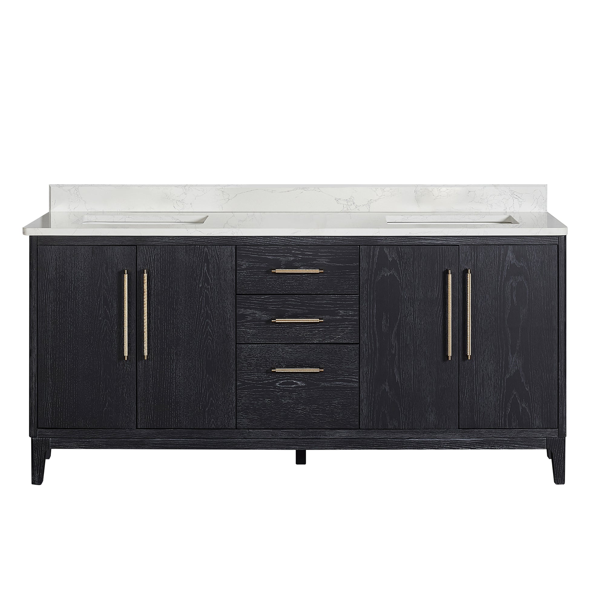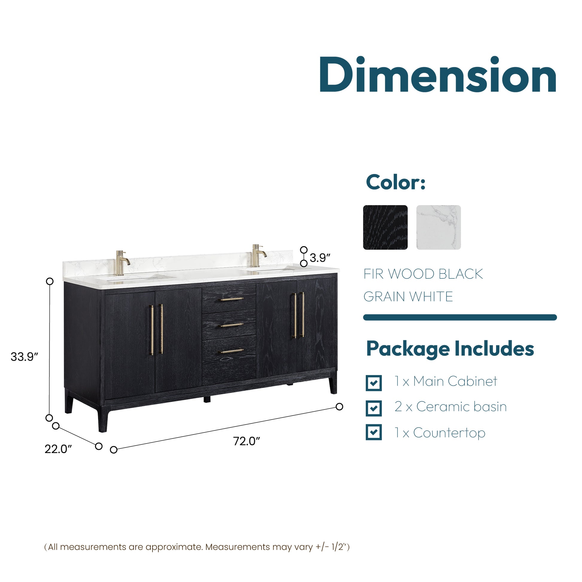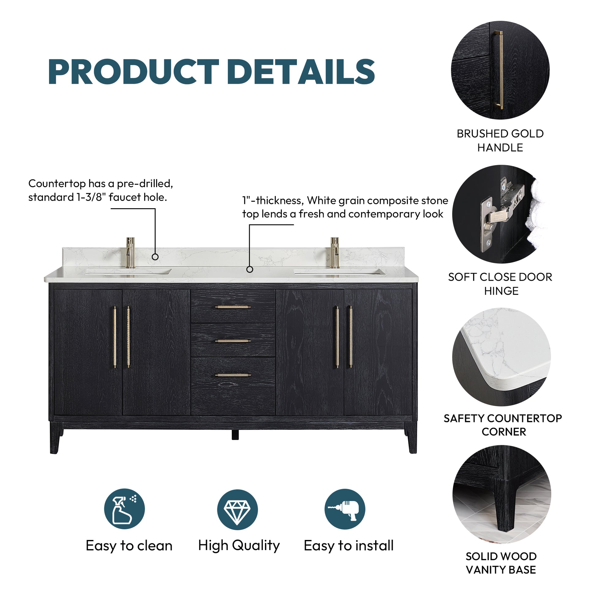 Upgrade your bathroom with the "Gara 72" Free-standing Double Bath Vanity in Fir Wood Black with White Grain Composite Stone Top today!