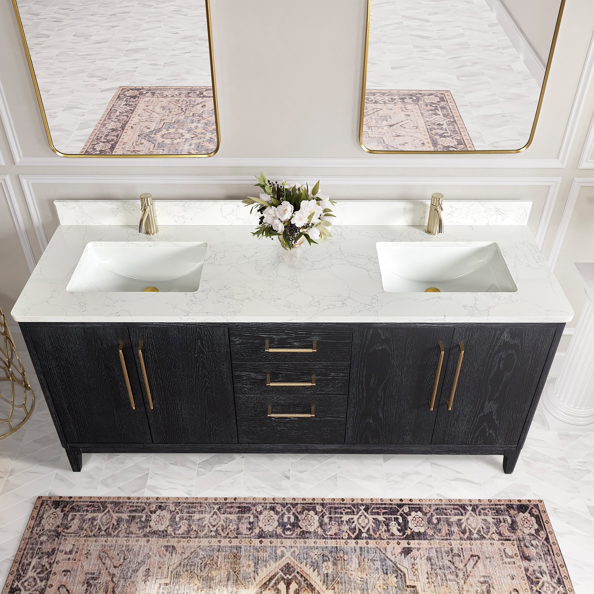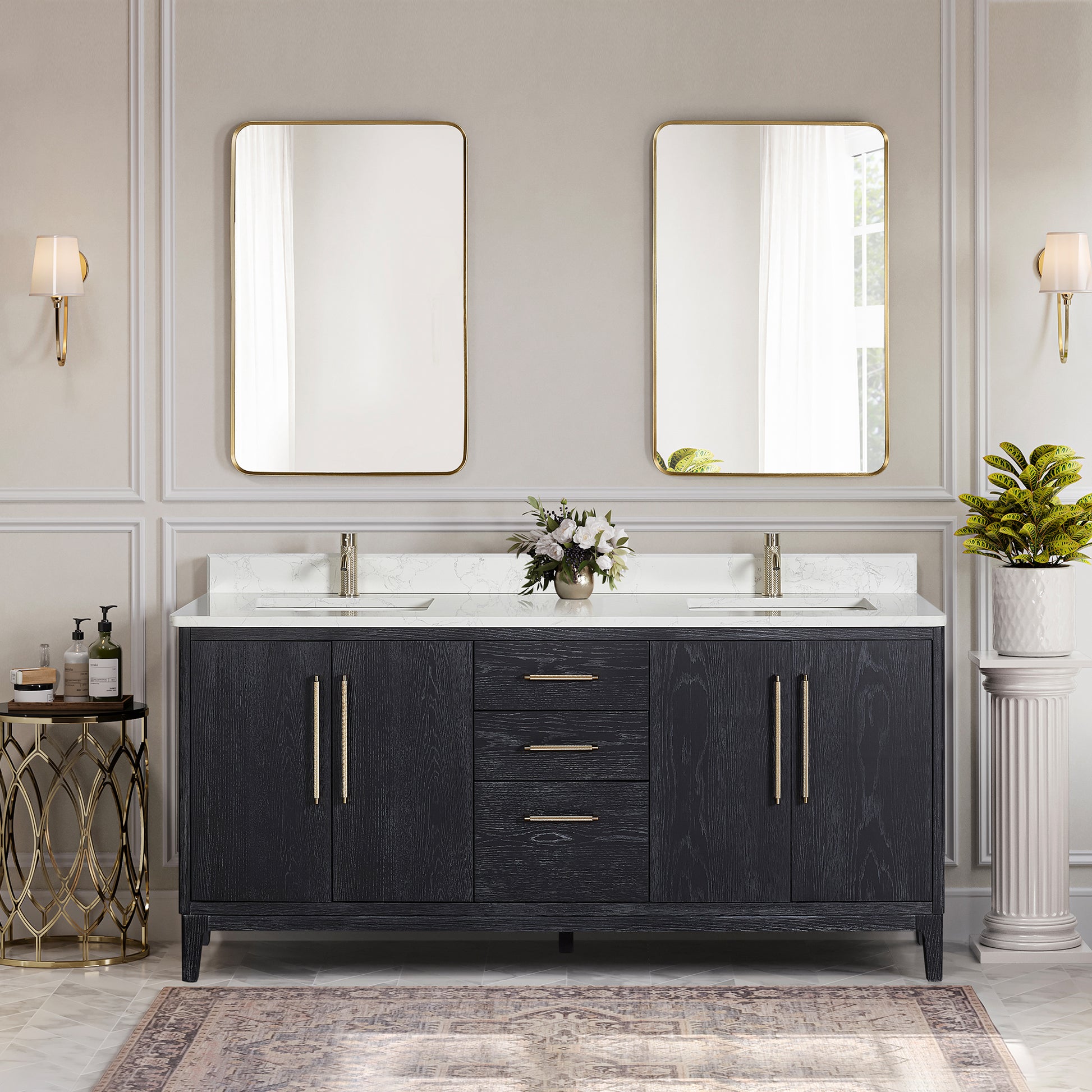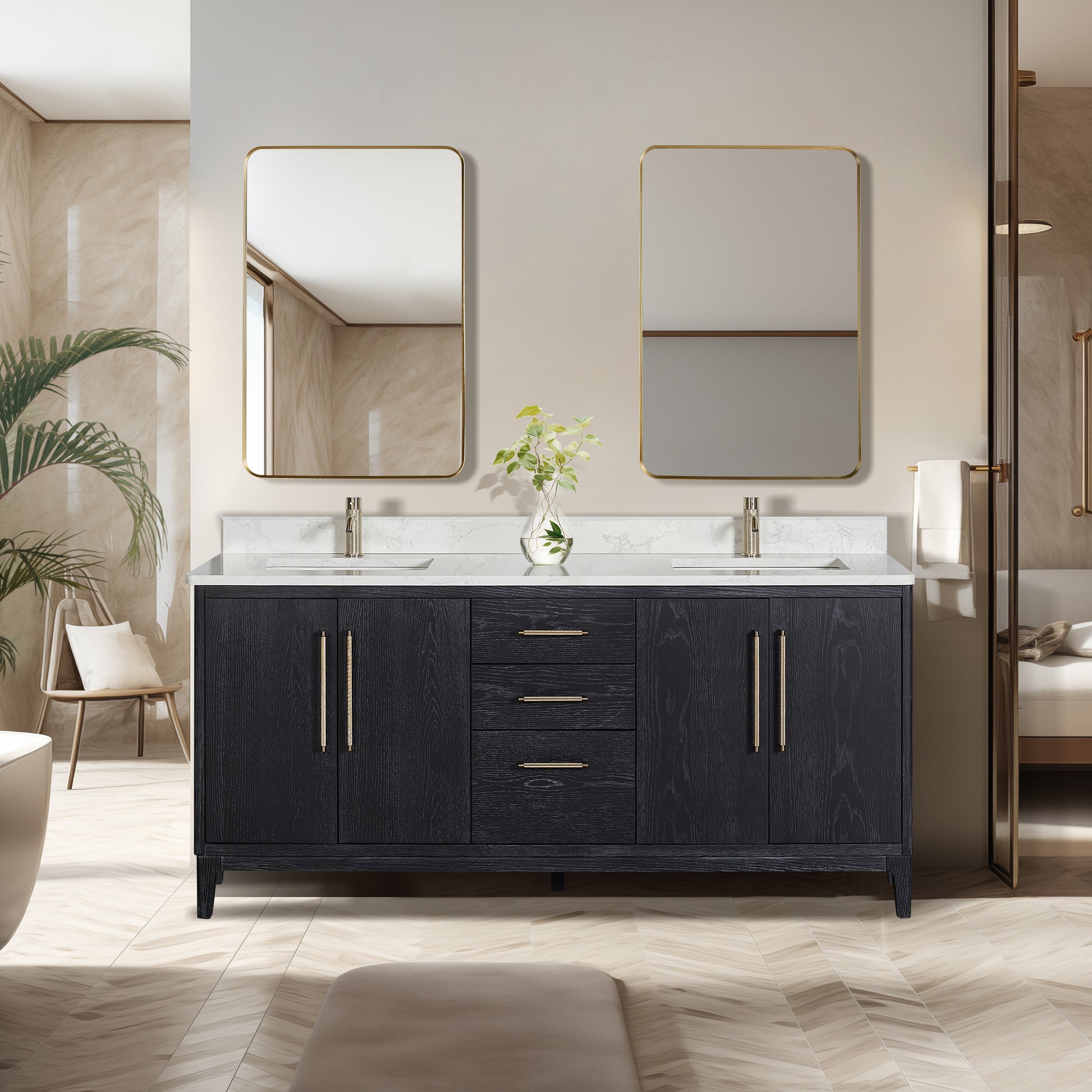 Upgrade your bathroom with the "Gara 72" Free-standing Double Bath Vanity in Fir Wood Black with White Grain Composite Stone Top today!