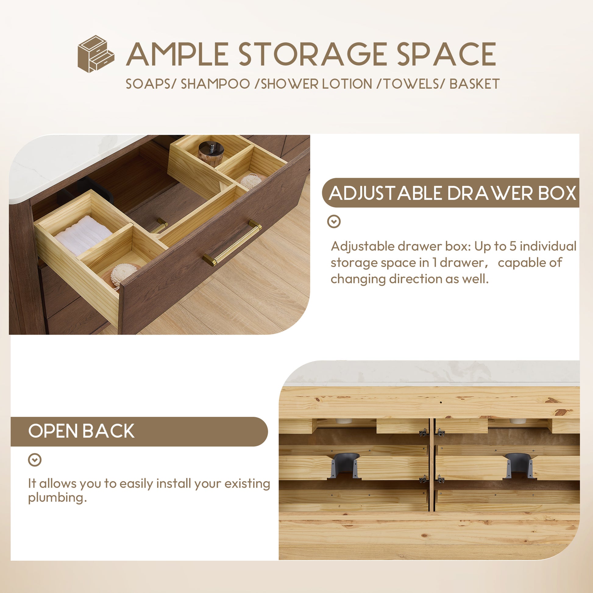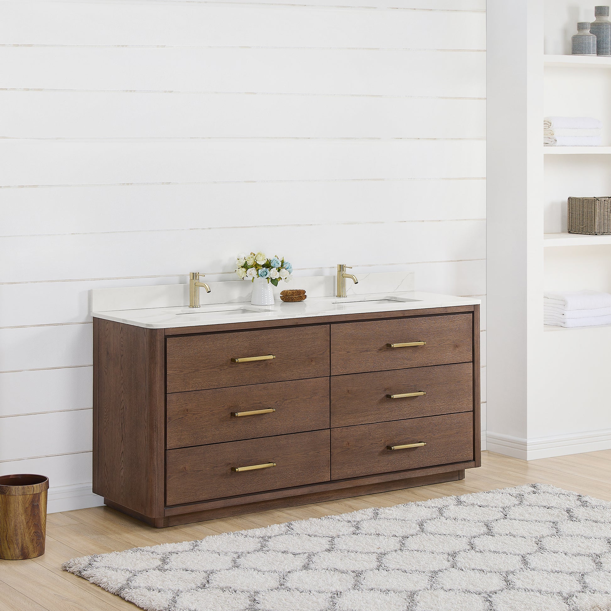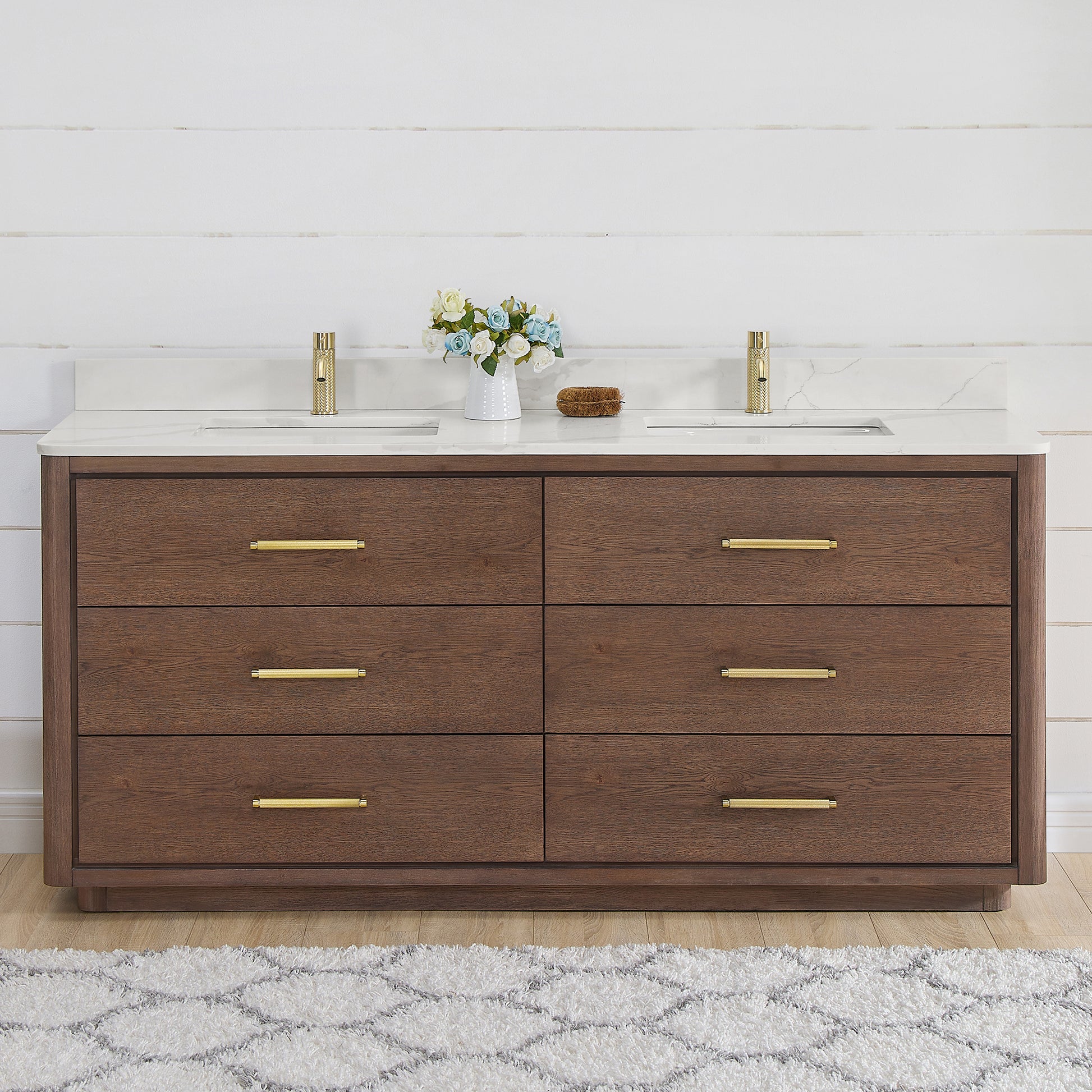 Description: Upgrade your bathroom with the elegant Porto 72 Free-standing Double Bath Vanity in Aged Dark Brown Oak with Fish Maw White Quartz Stone Top. This luxurious vanity combines style and functionality to transform your space into a spa-like retreat.