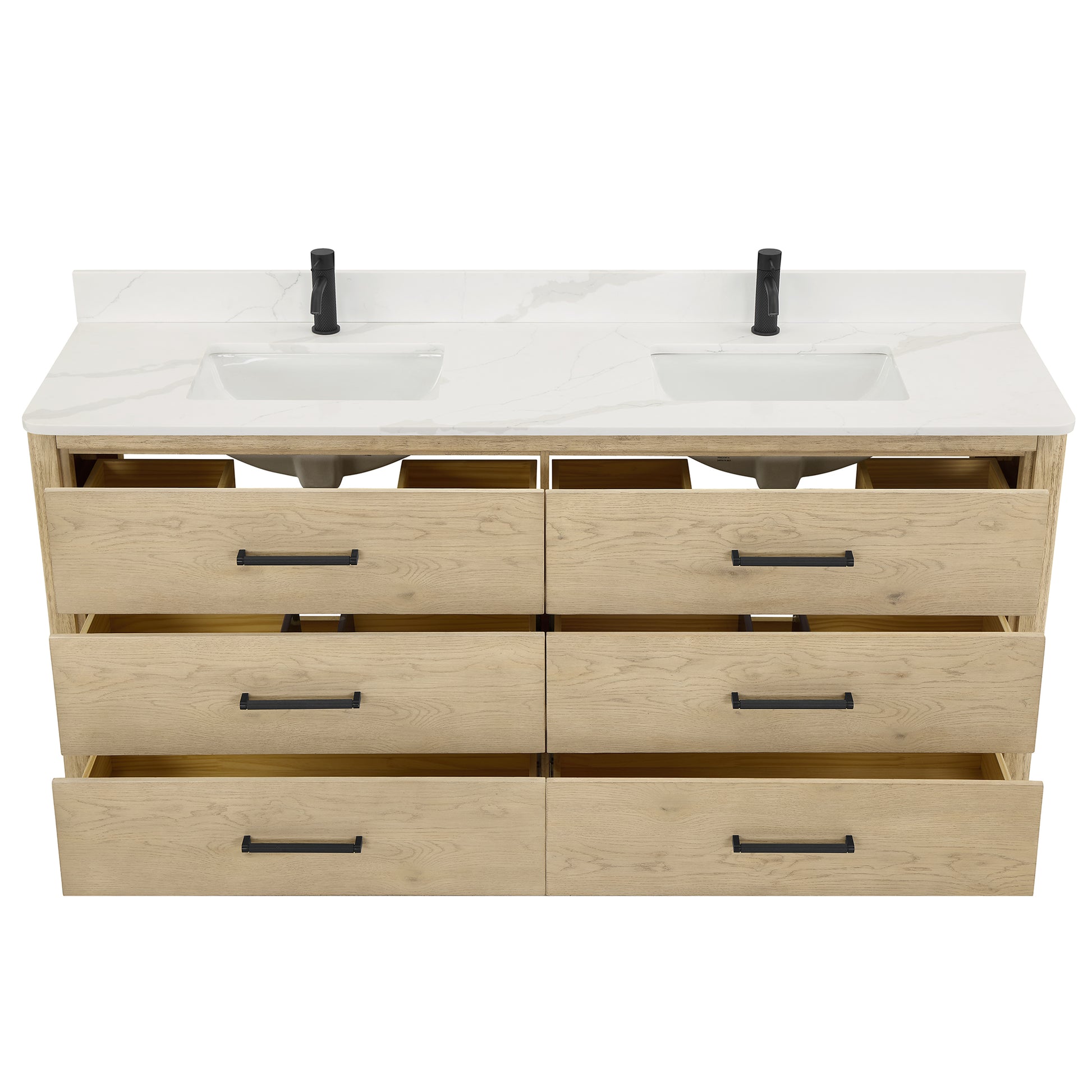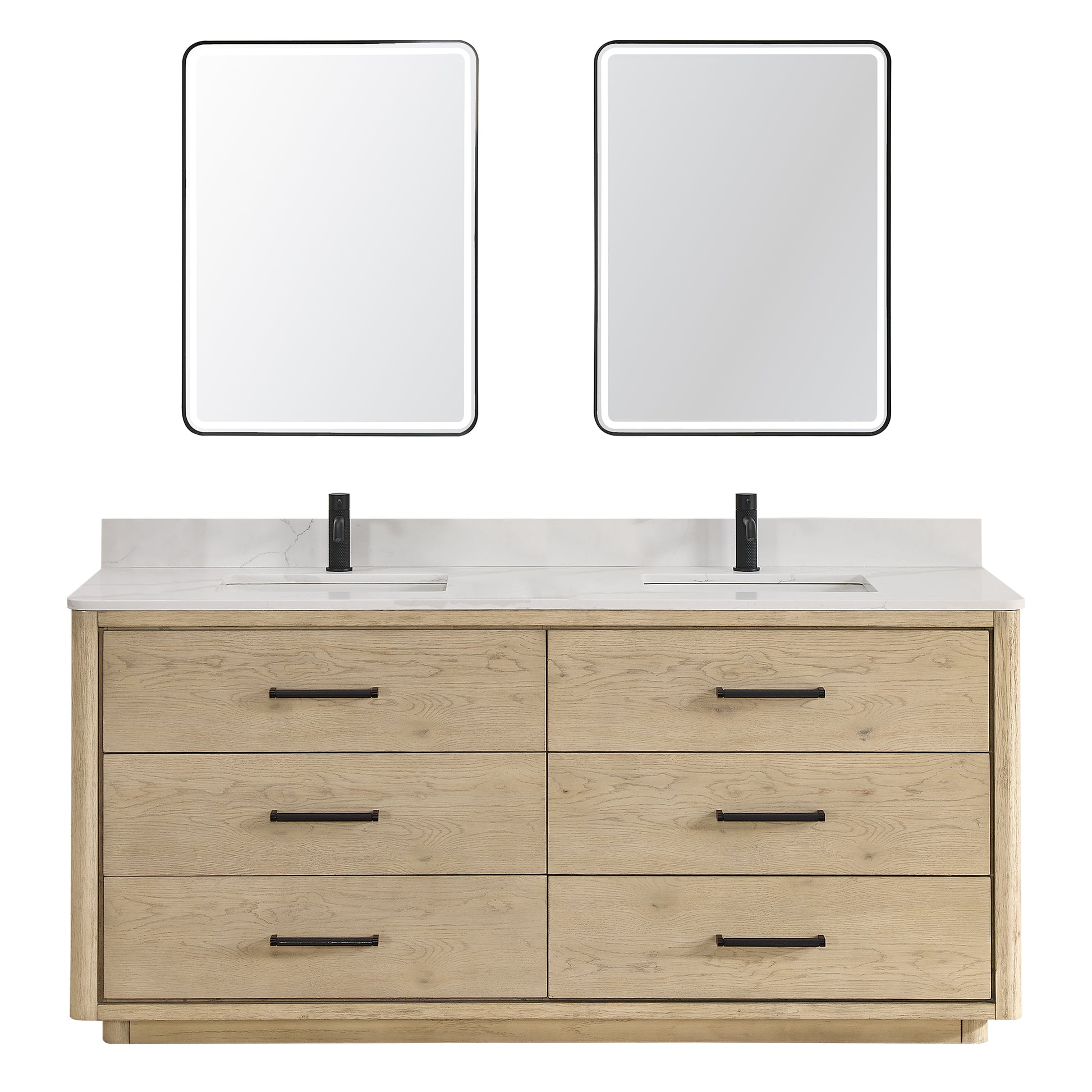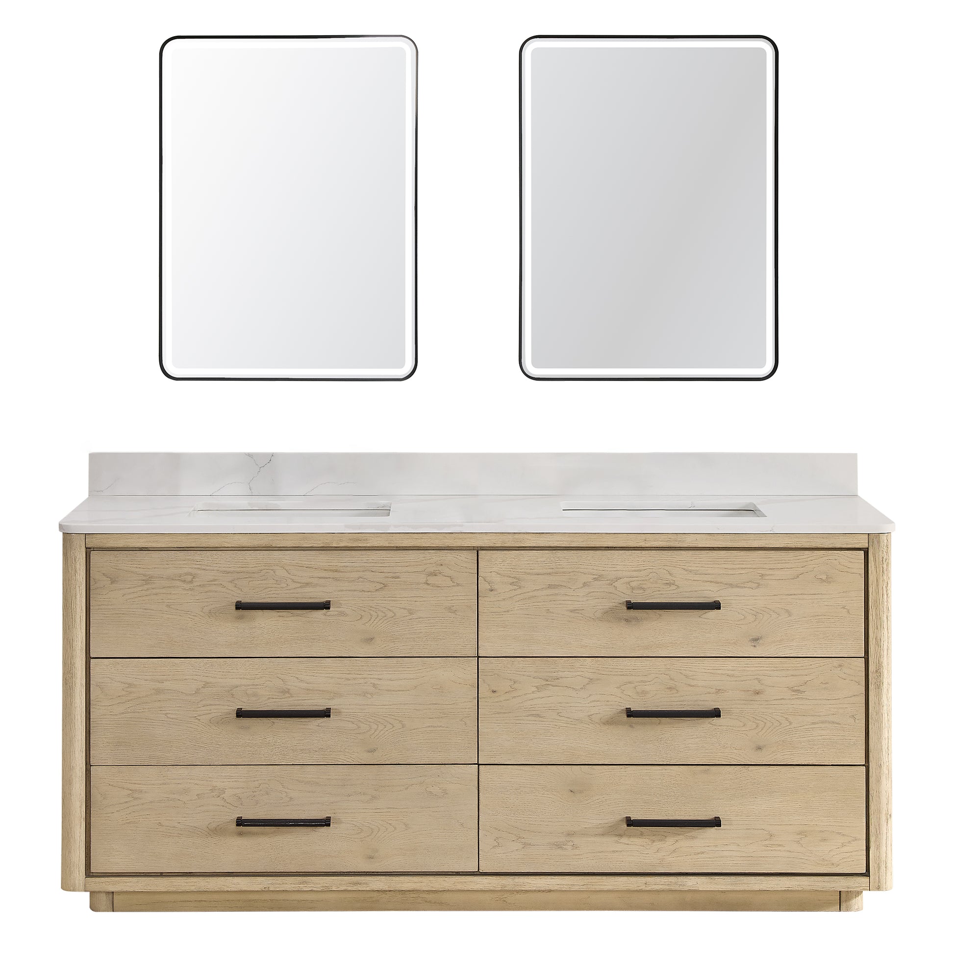 Upgrade your bathroom with the Porto 72 Free-standing Double Bath Vanity in Aged Natural Oak with Fish Maw White Quartz Stone Top and Mirror today.