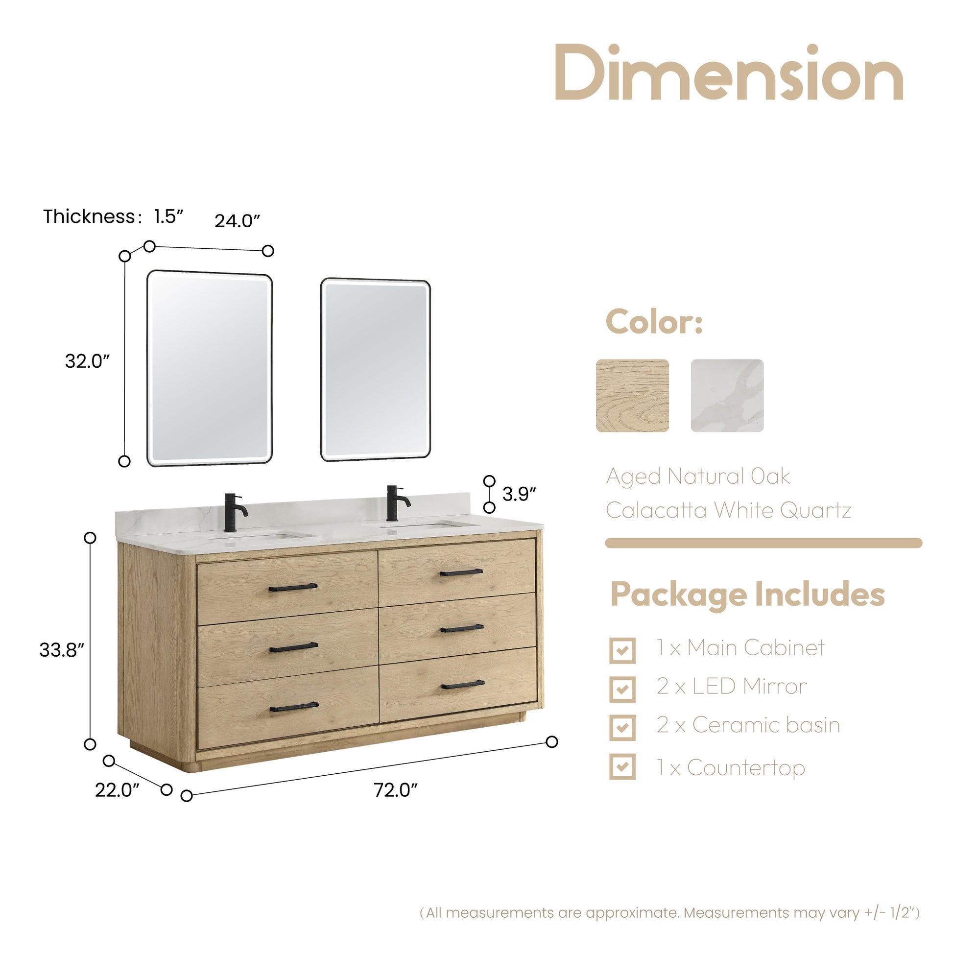 Vinnova, Porto 72" Free-standing Double Bath Vanity in Aged Natural Oak with Fish Maw White Quartz Stone Top and Mirror