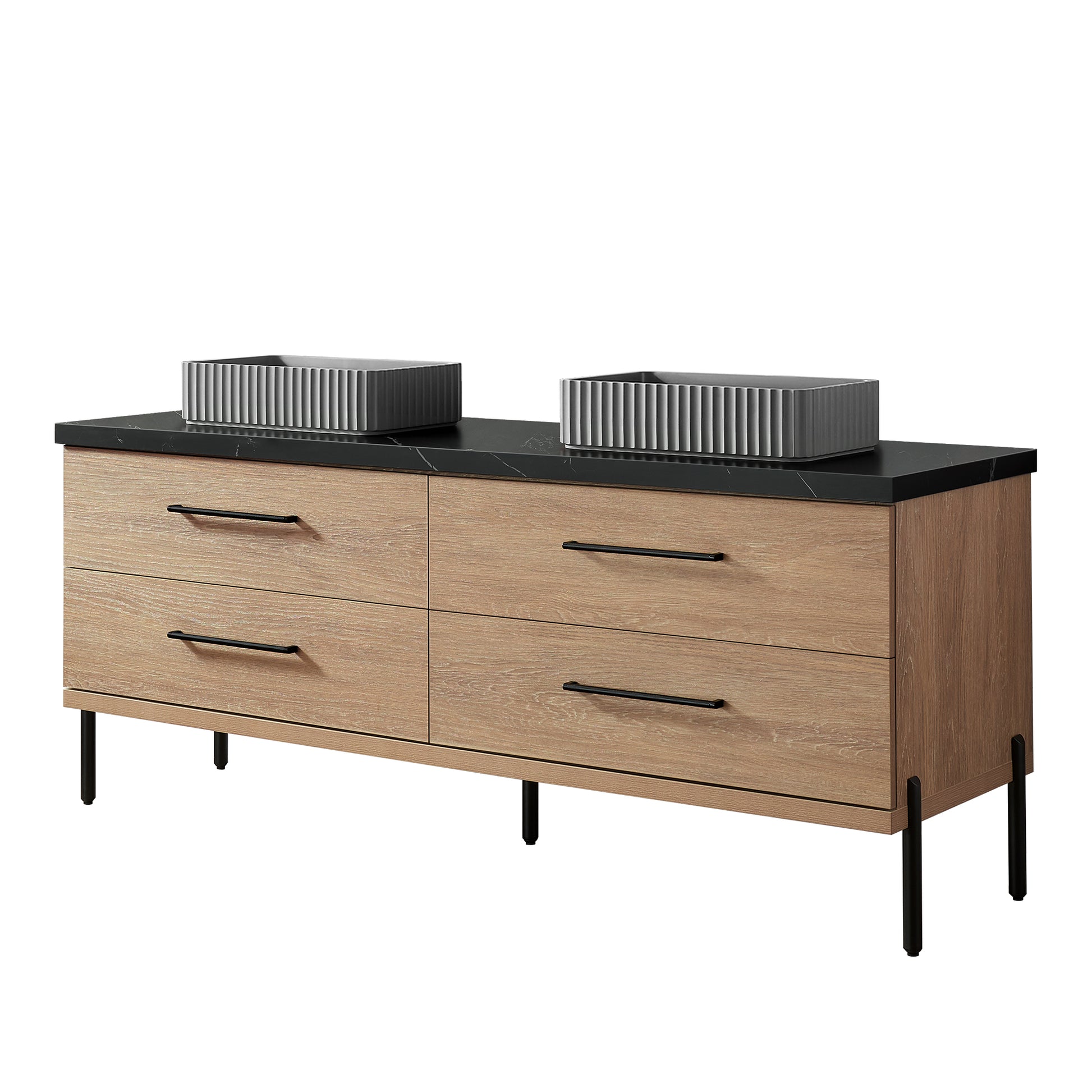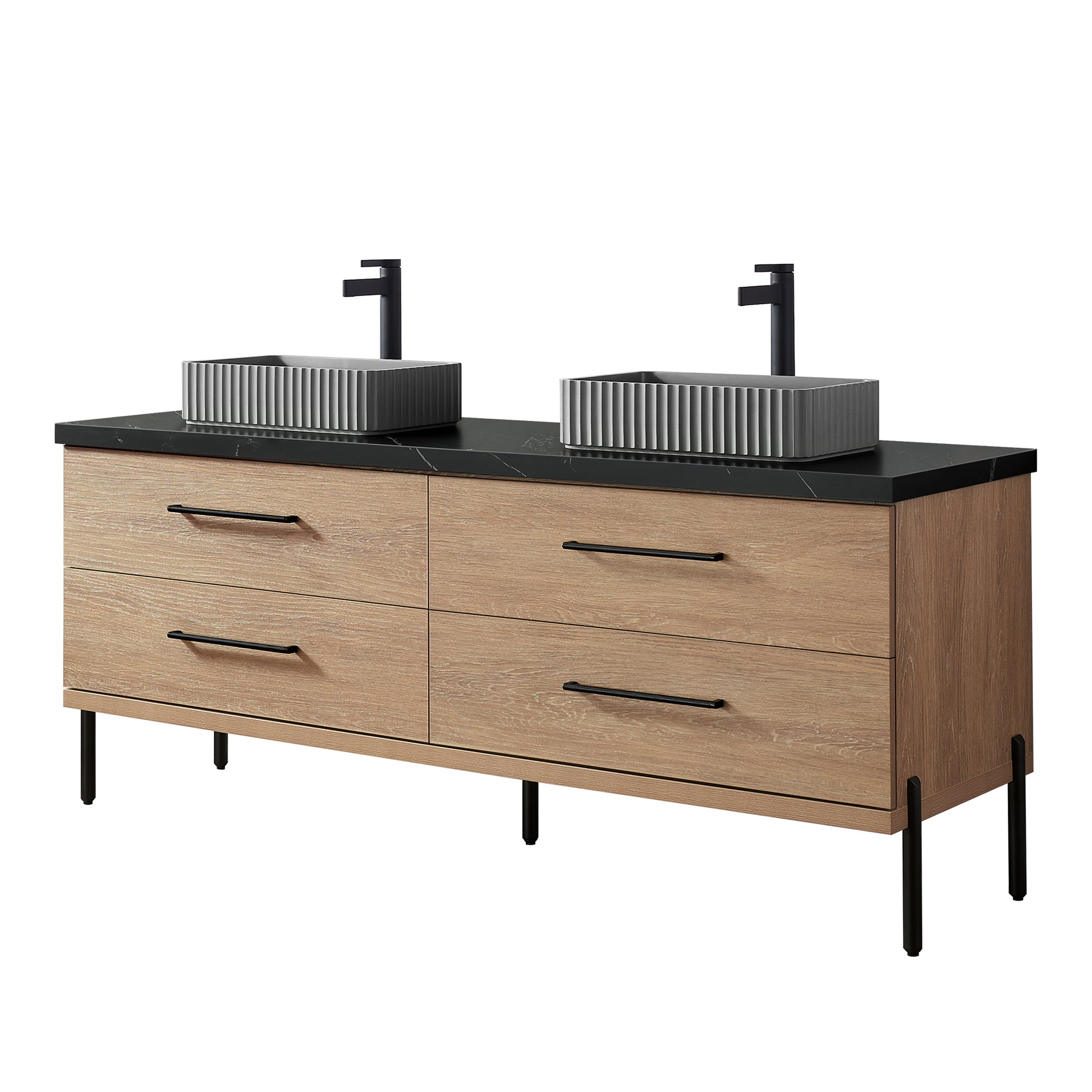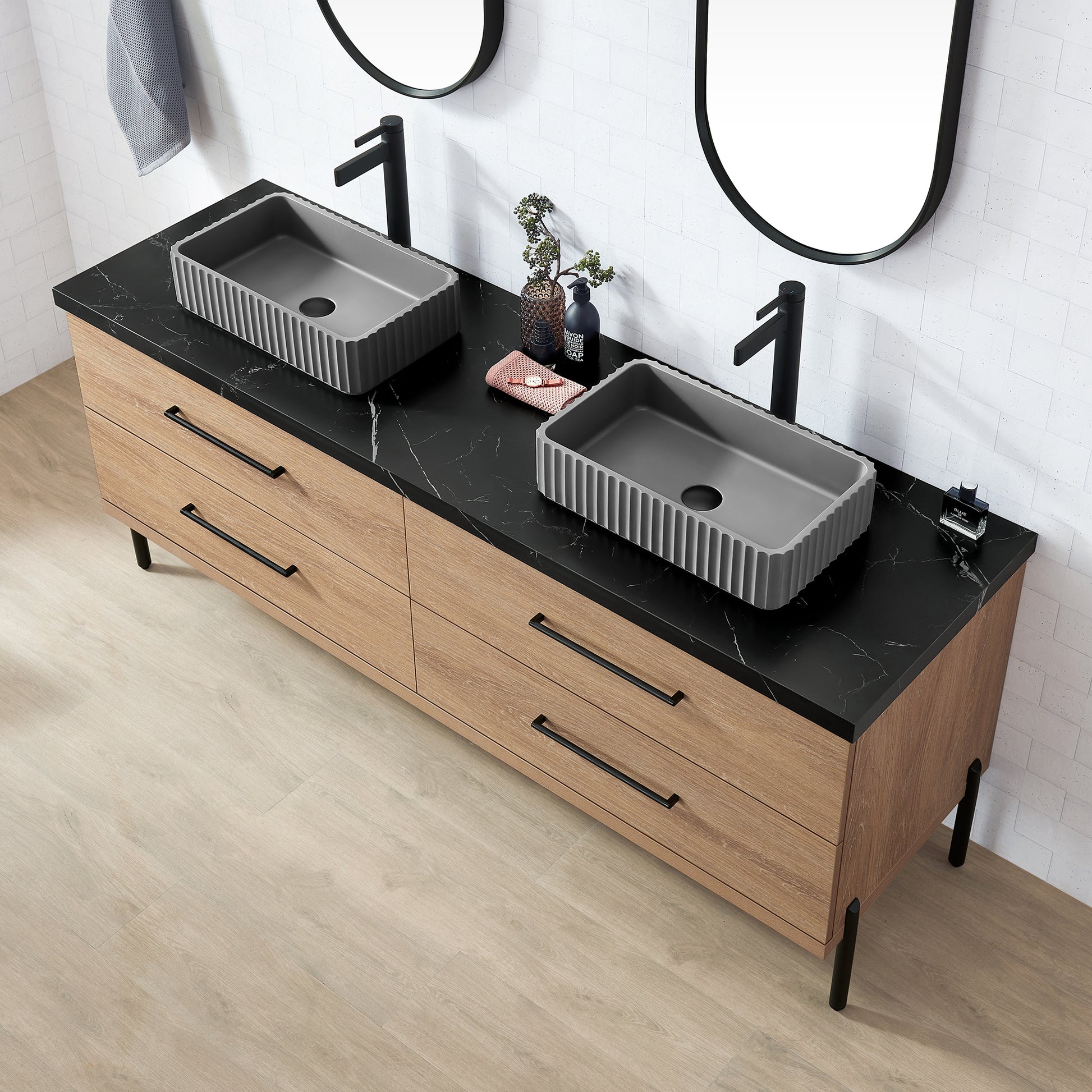 Vinnova, Trento 72A" Double Sink Bath Vanity in North American Oak with Black Sintered Stone Top with Concrete Sink