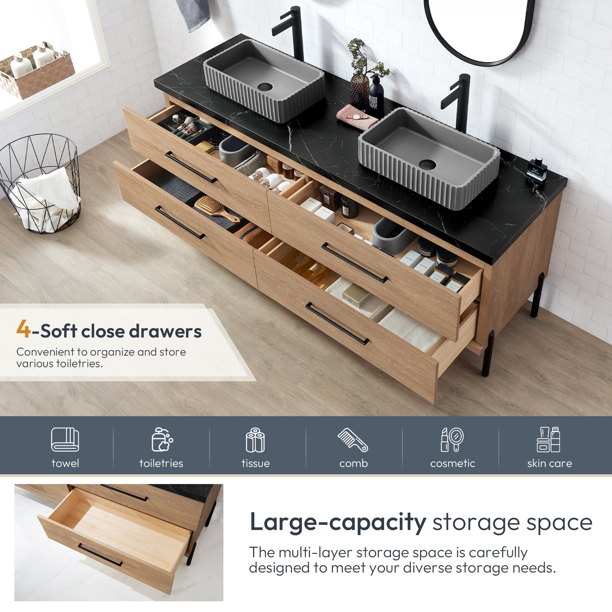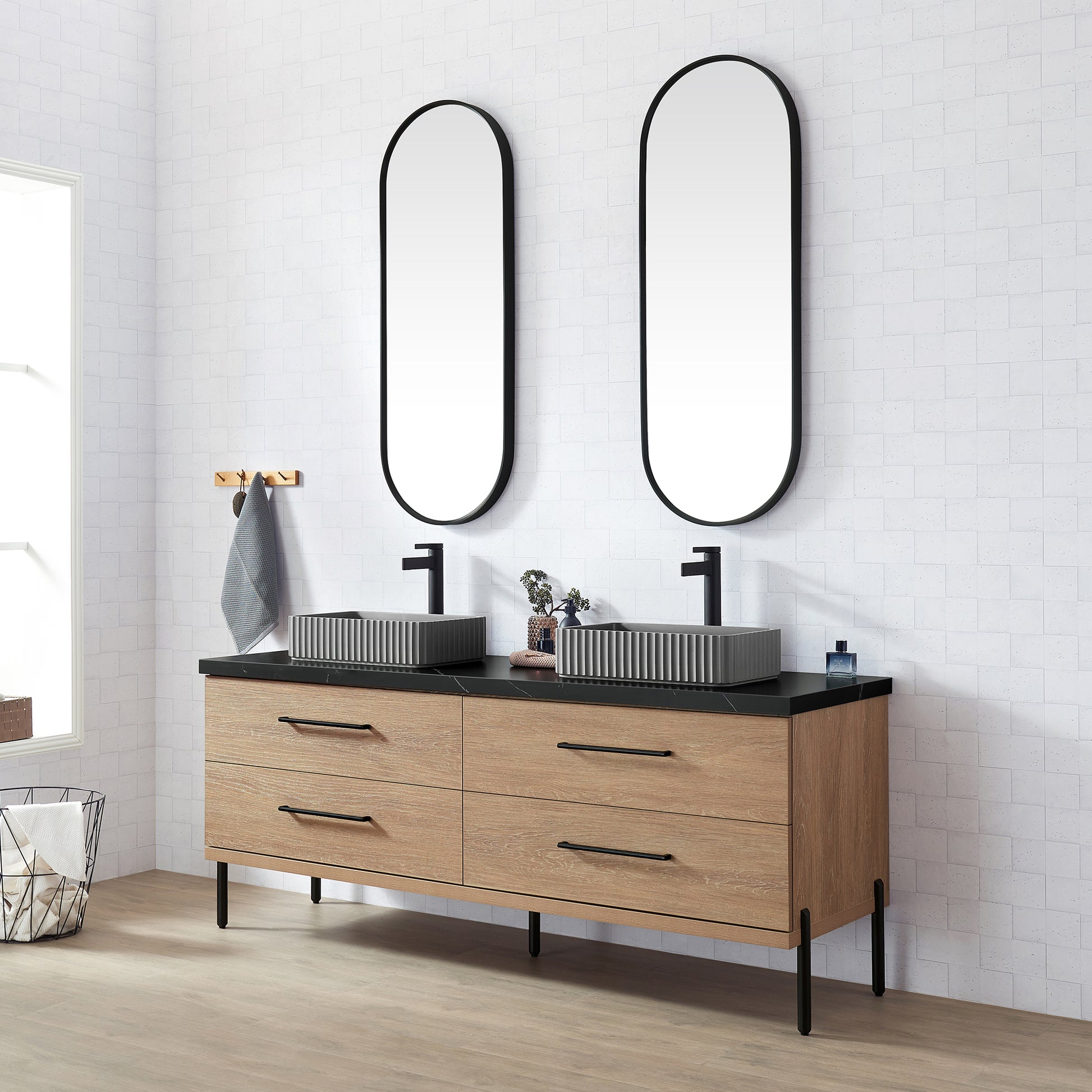 Upgrade your bathroom with the Trento 72A Double Sink Bath Vanity in North American Oak with Black Sintered Stone Top with Concrete Sink today!