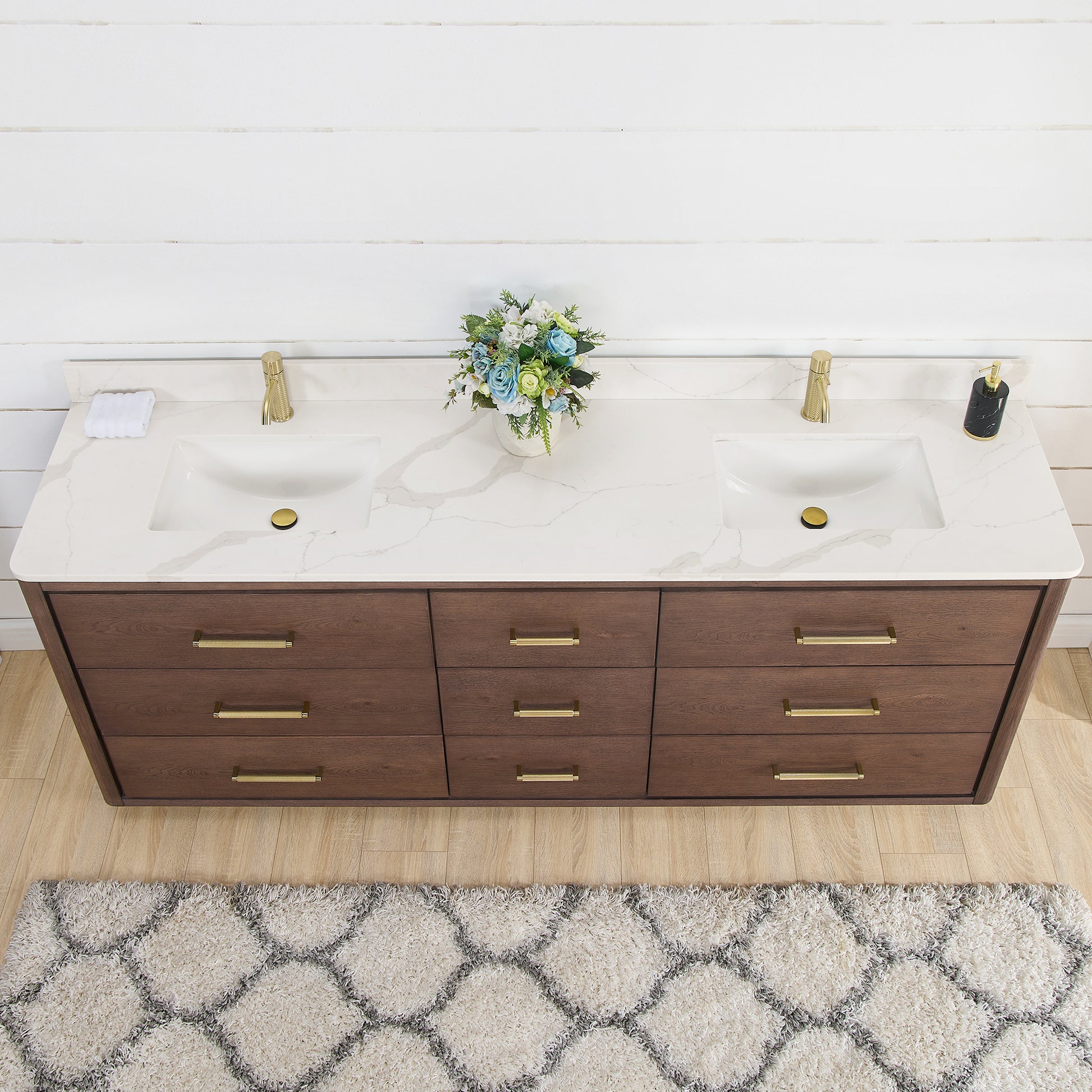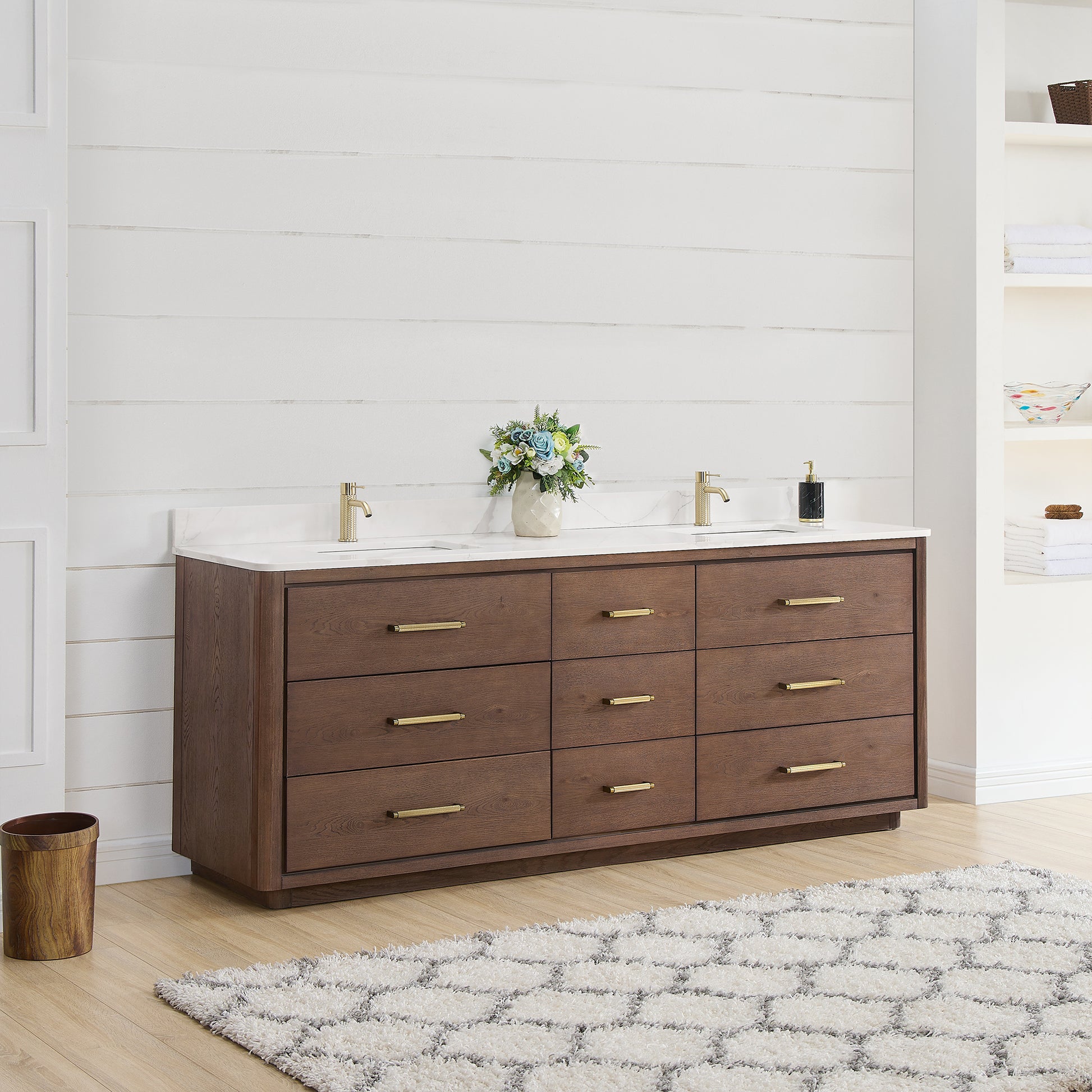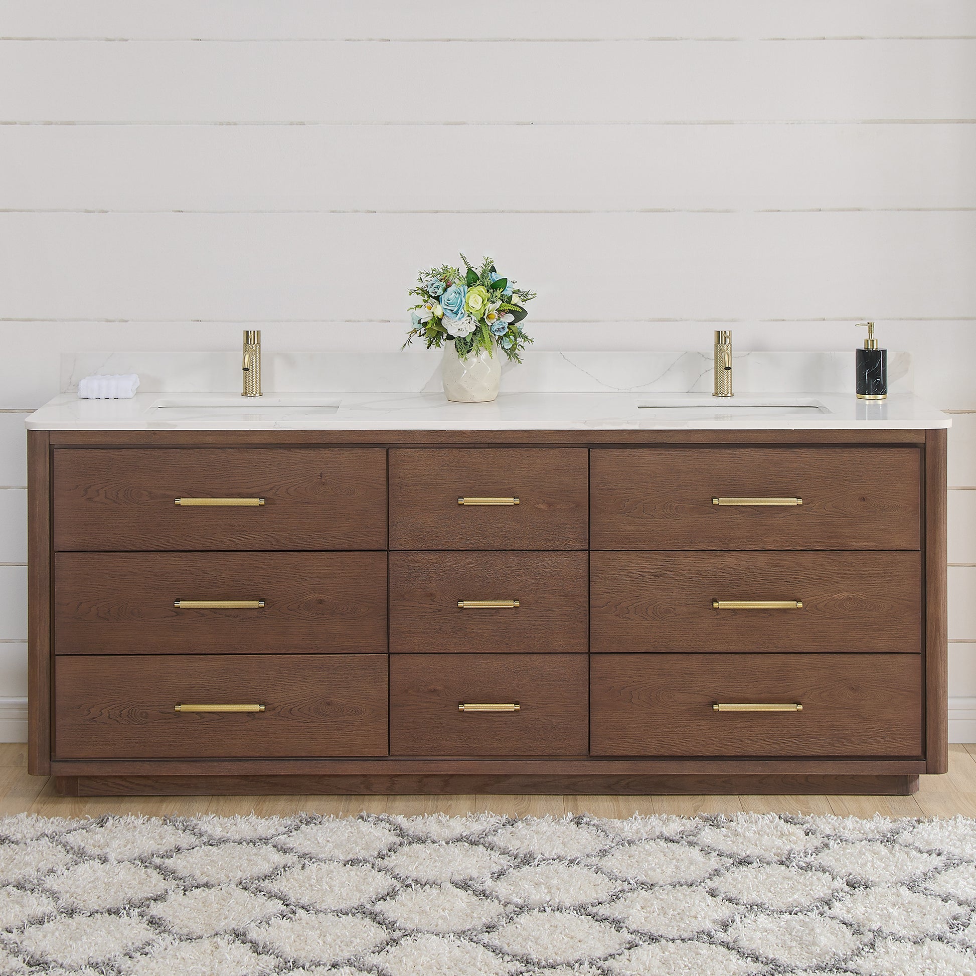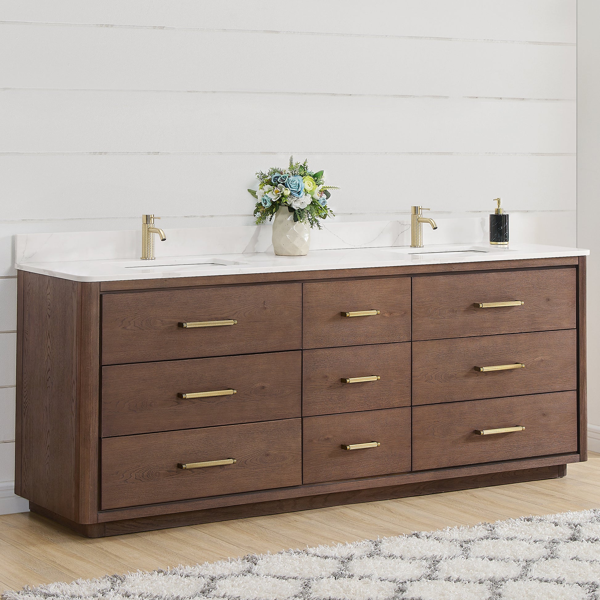 Upgrade your bathroom with the Porto 84 Free-standing Double Bath Vanity in Aged Dark Brown Oak with Fish Maw White Quartz Stone Top today!