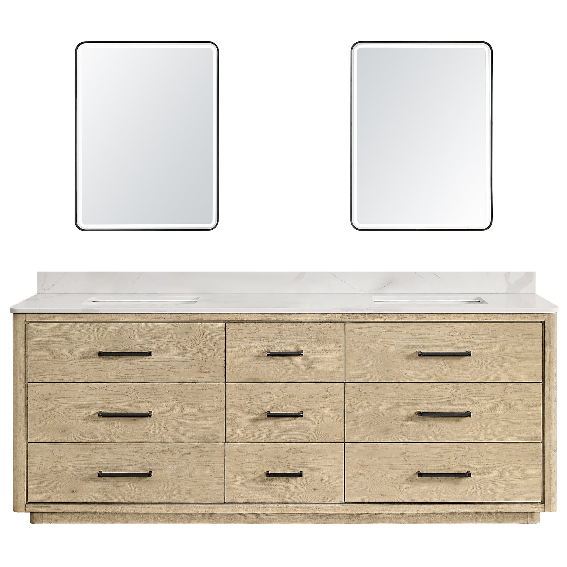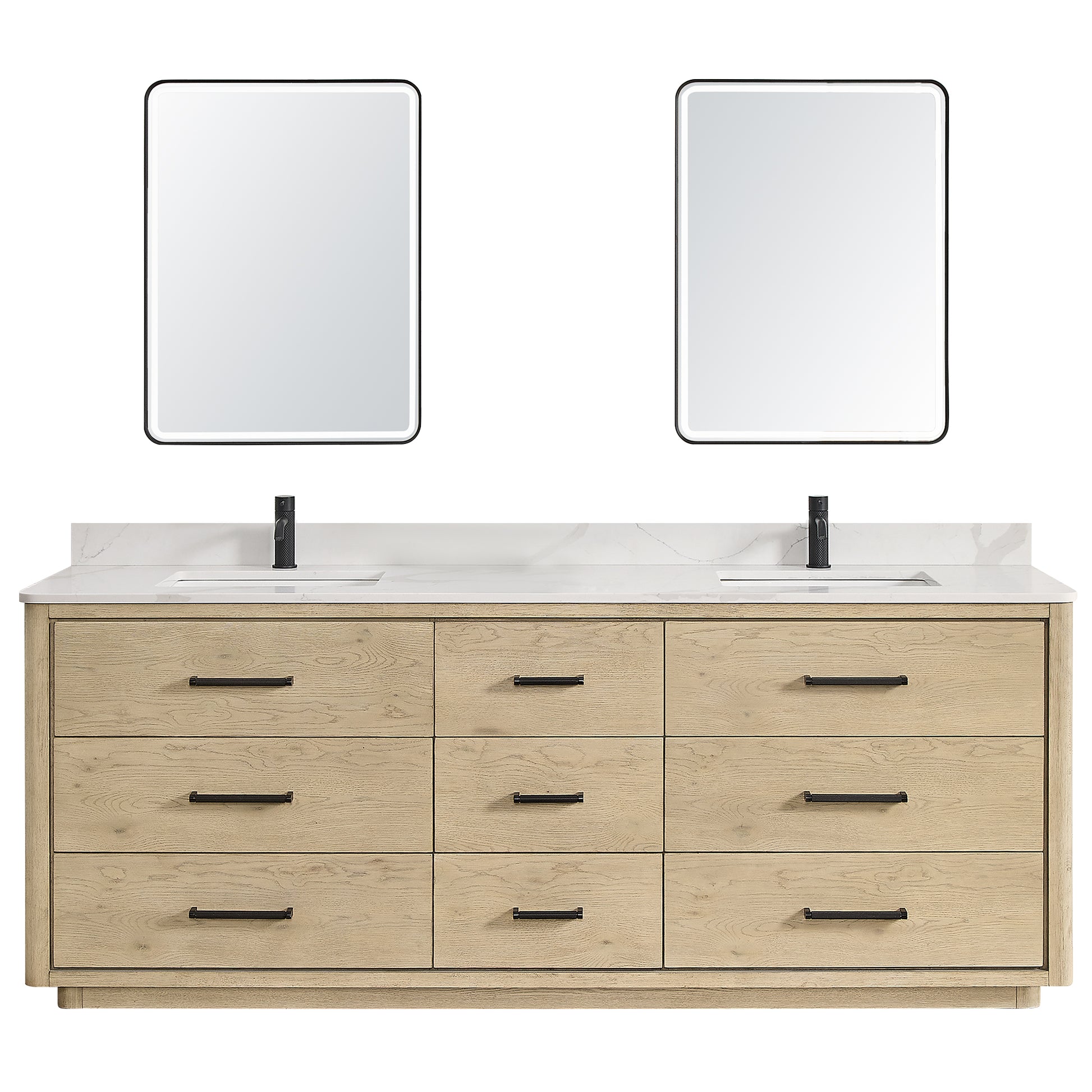 Vinnova, Porto 84" Free-standing Double Bath Vanity in Aged Natural Oak with Fish Maw White Quartz Stone Top and Mirror