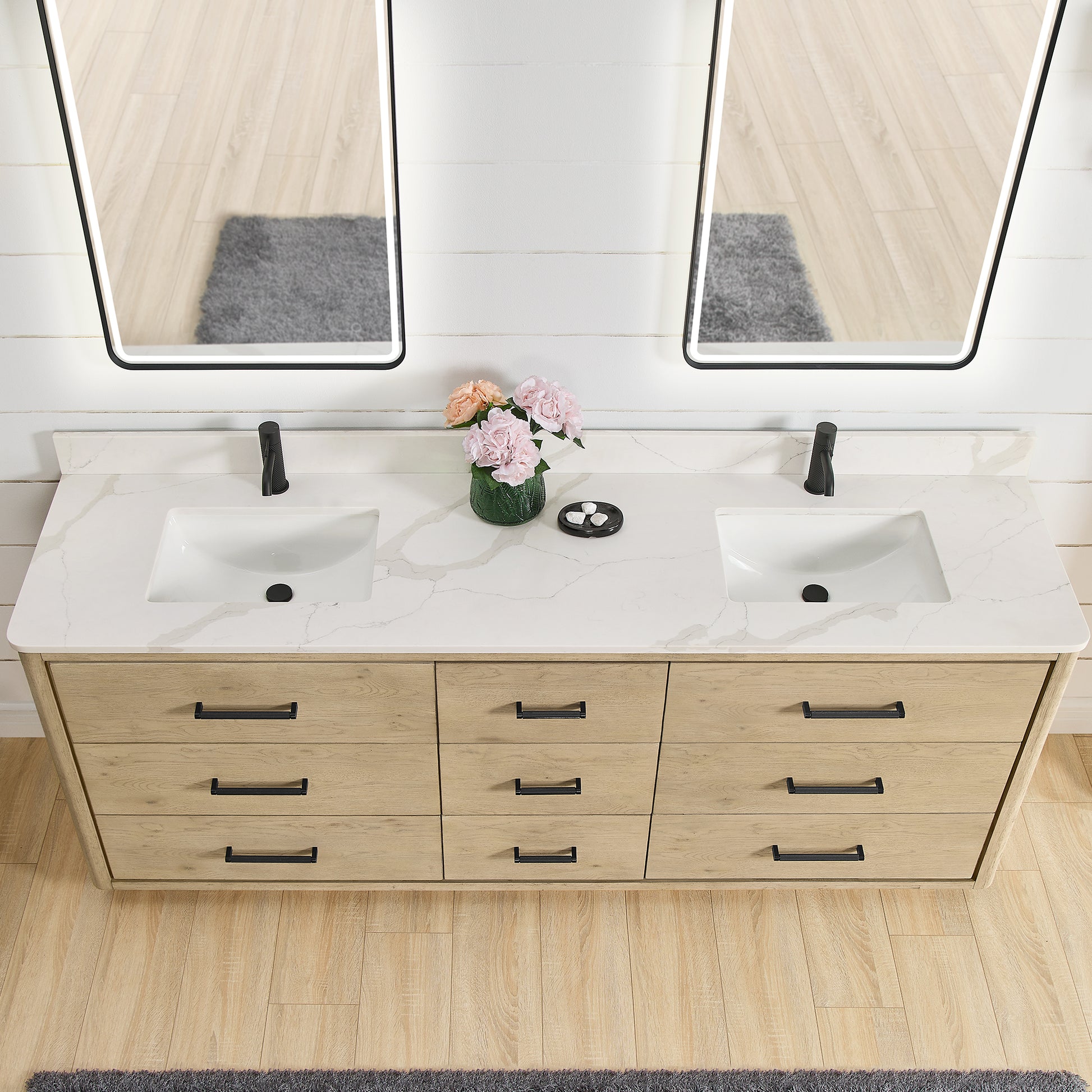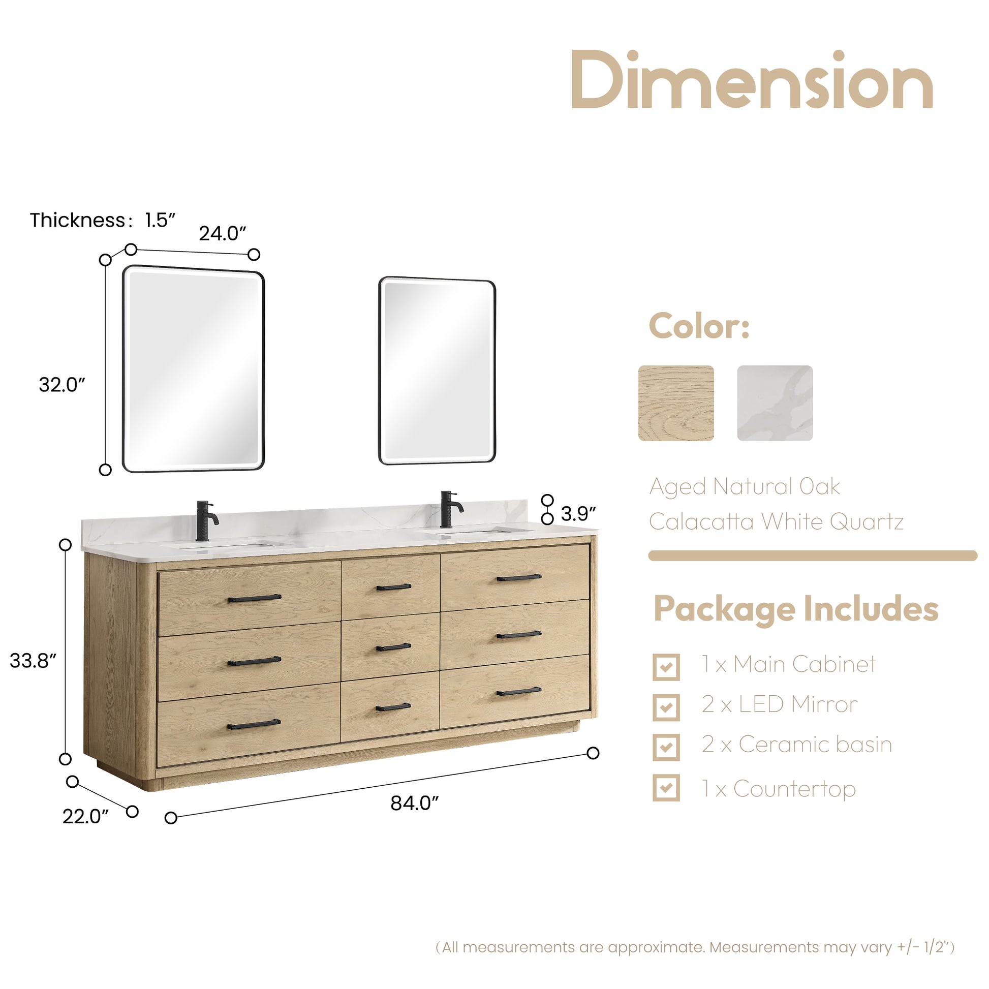 Transform your bathroom into a spa-like retreat with the Porto 84 Free-standing Double Bath Vanity in Aged Natural Oak with Fish Maw White Quartz Stone Top and Mirror.
