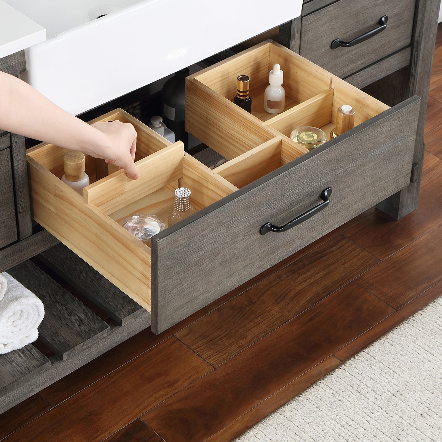 Don't miss out on the elegance and functionality of the Villareal 60" Single Bath Vanity in Classical Grey with Composite Stone Top in White, White Farmhouse Basin for your bathroom upgrade today.