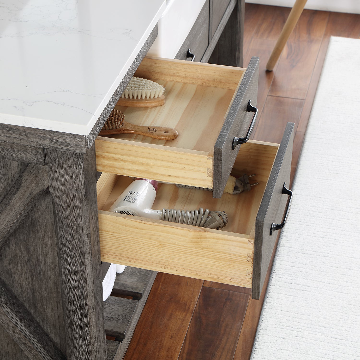Upgrade your bathroom with the elegant Villareal 60" Single Bath Vanity in Classical Grey. This luxurious vanity features a composite stone top in white and a white farmhouse basin for a timeless look that complements any decor.