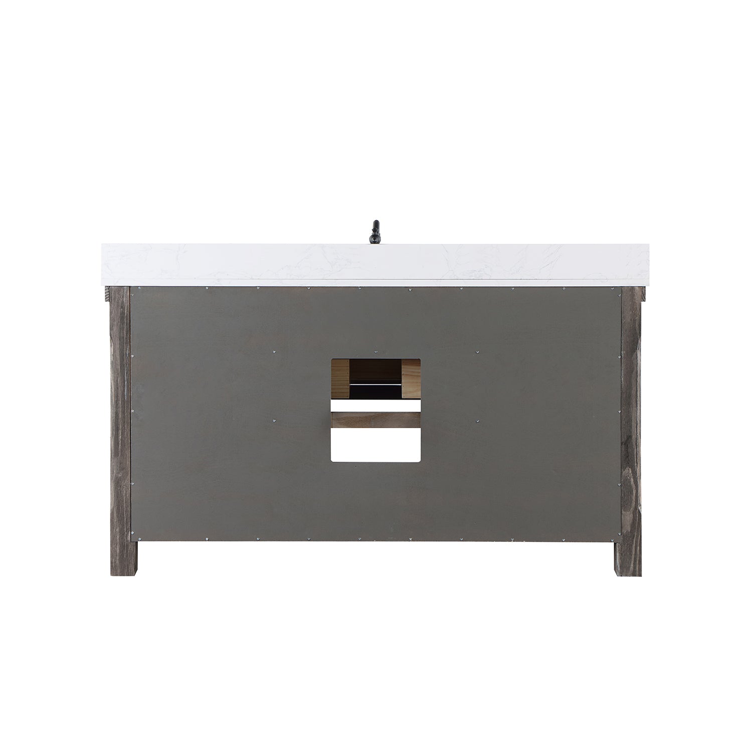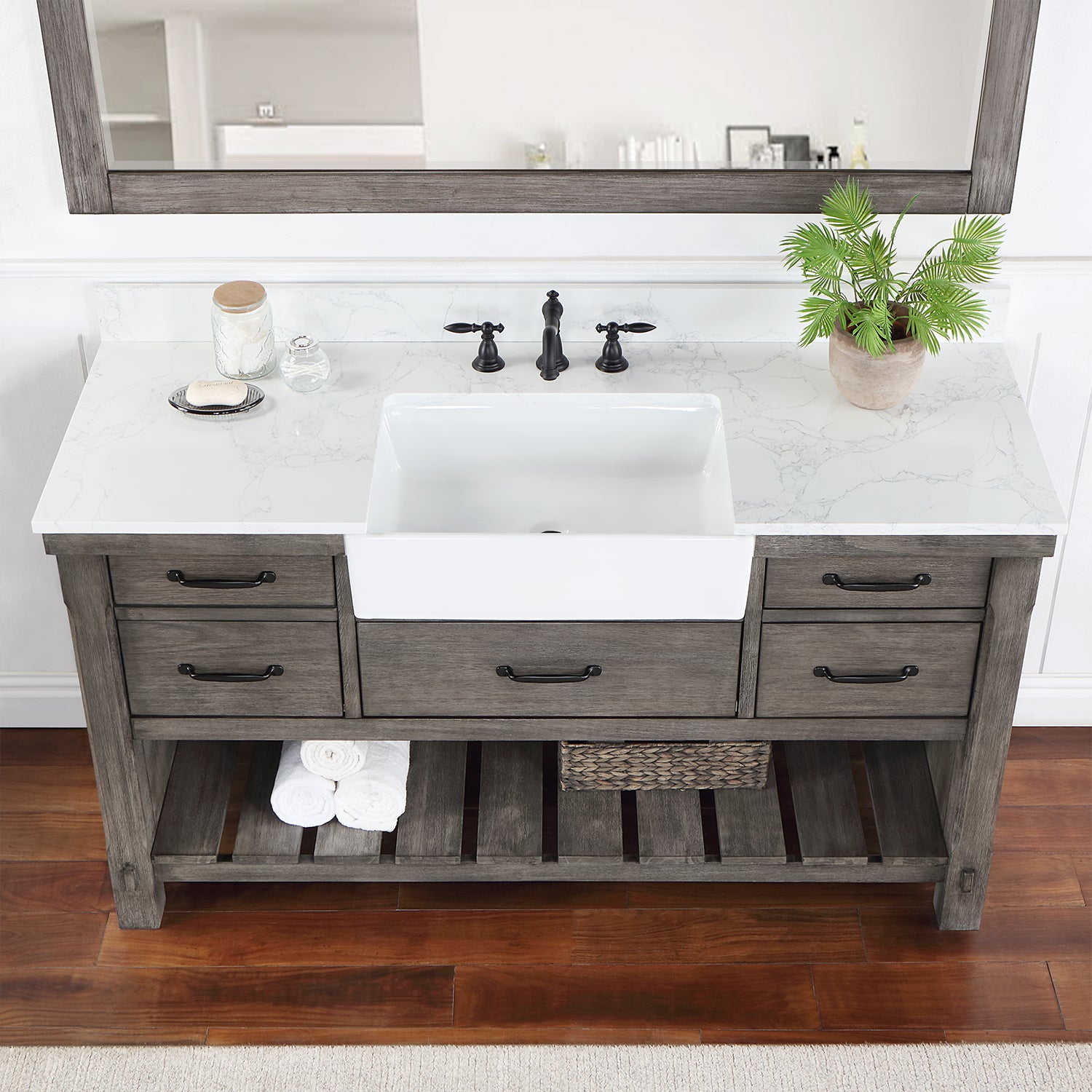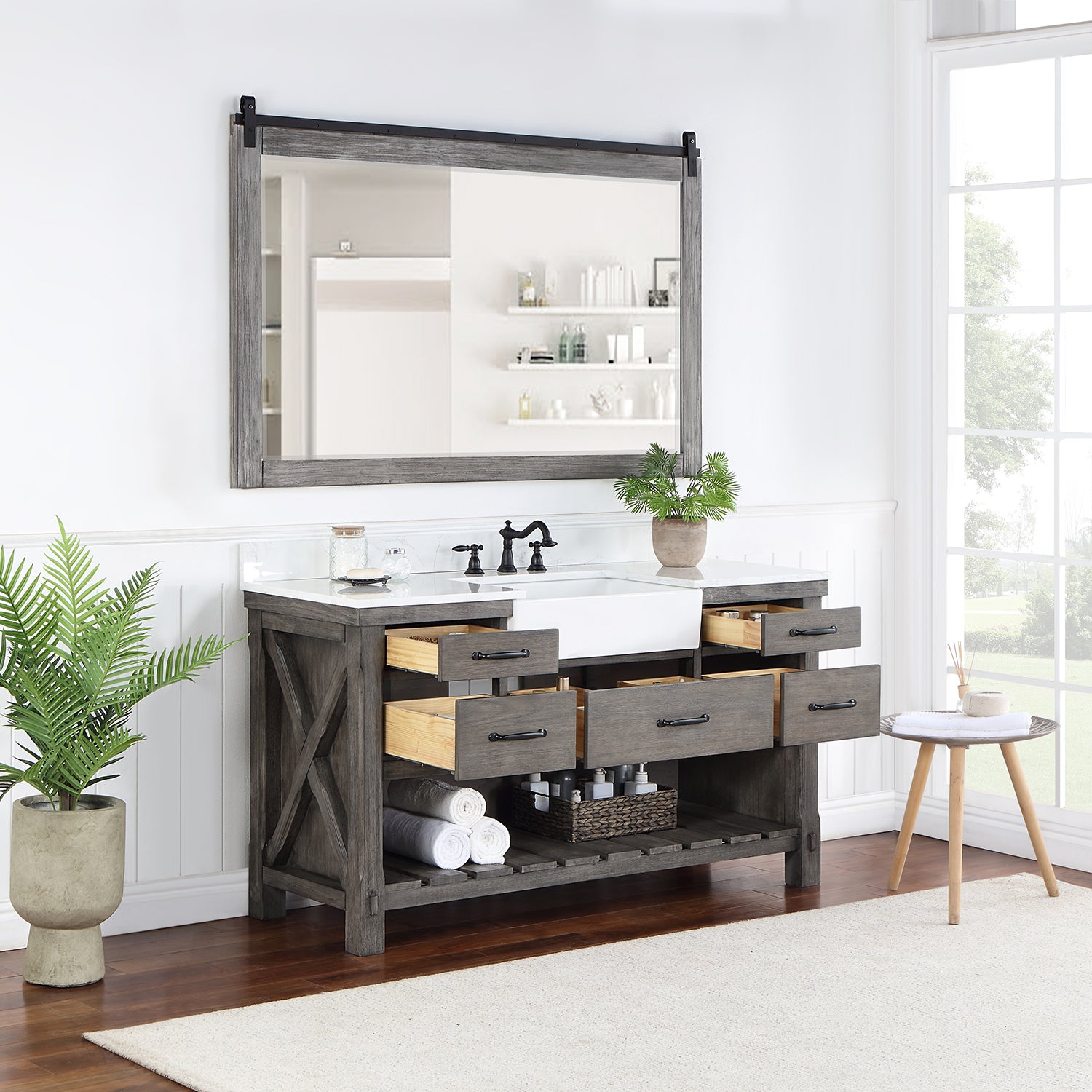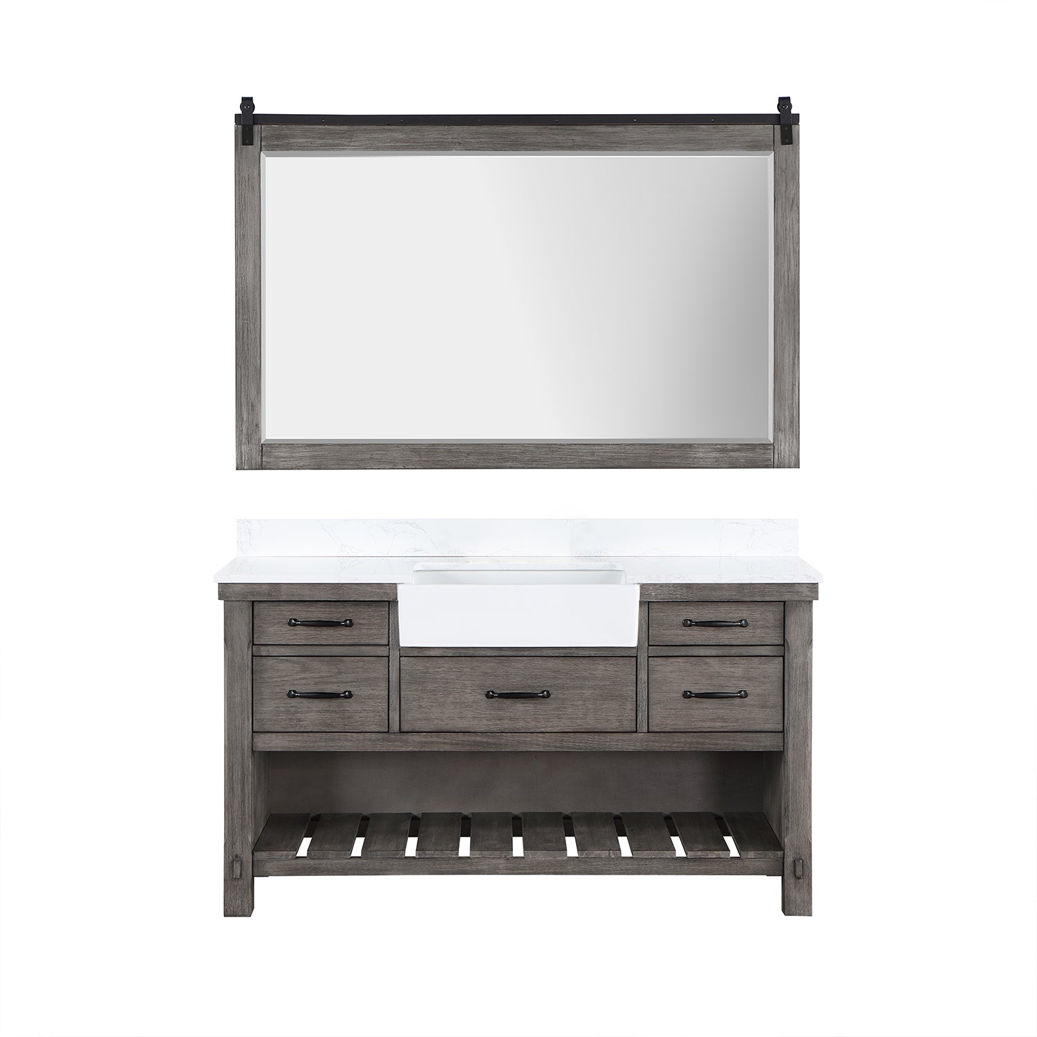 Vinnova, Villareal 60" Single Bath Vanity in Classical Grey with Composite Stone Top in White, White Farmhouse Basin and Mirror