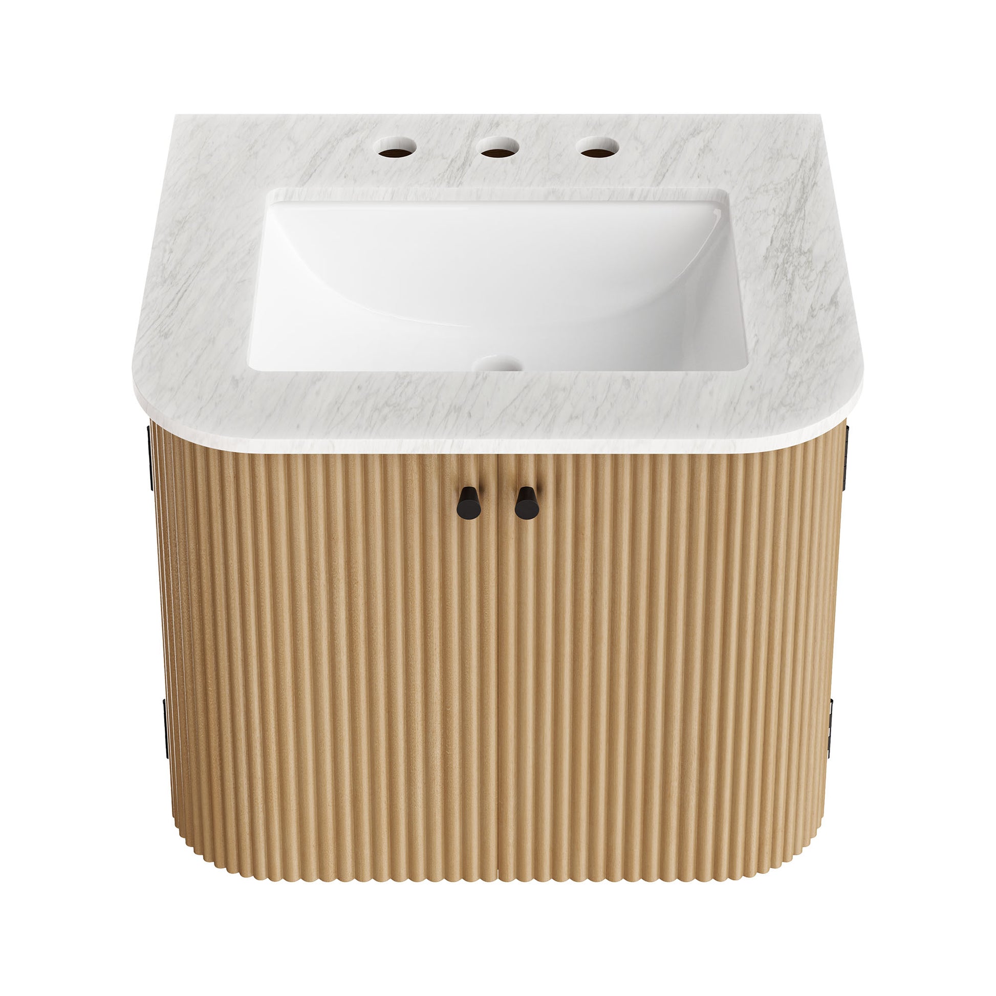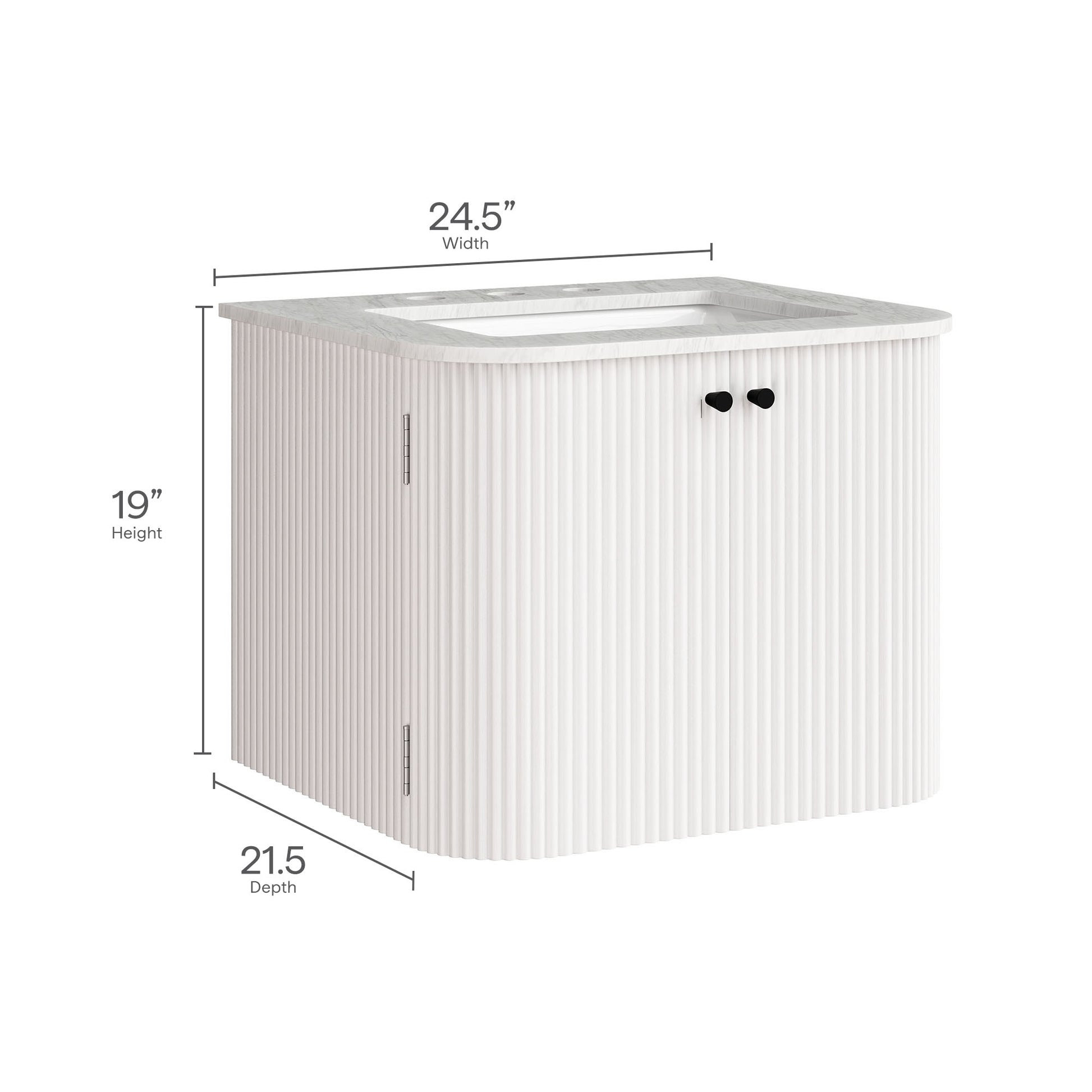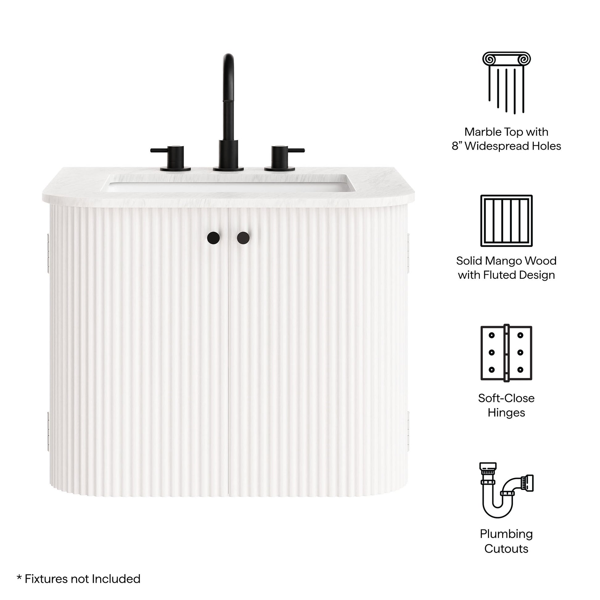 Give your bathroom a modern upgrade with the Zia 24" Wall Mount Vanity. Its floating, wall-mounted design opens up the space, creating a light and airy feel. The solid wood base features a textured fluted pattern, with deep vertical grooves that add both visual interest and a touch of depth. The marble sink top, complete with a curved basin and three 8" widespread faucet holes, gives you plenty of options for a faucet that suits your style. Inside, two soft-close hinged doors reveal adjustable shelves for convenient storage, and cutouts for plumbing ensure a seamless installation. The Zia Modern Bathroom Vanity with Sink effortlessly blends modern design with everyday function, bringing timeless beauty and chic practicality to your bathroom. Assembly is required and fixtures are not included. Weight Capacity: 132 lbs.24" Wall Mounted Vanity Solid Mango Wood Base with Fluted Pattern Marble Sink 8" Widespread Faucet Holes Soft-Close Hinges Plumbing Cutouts Fixtures Not Included