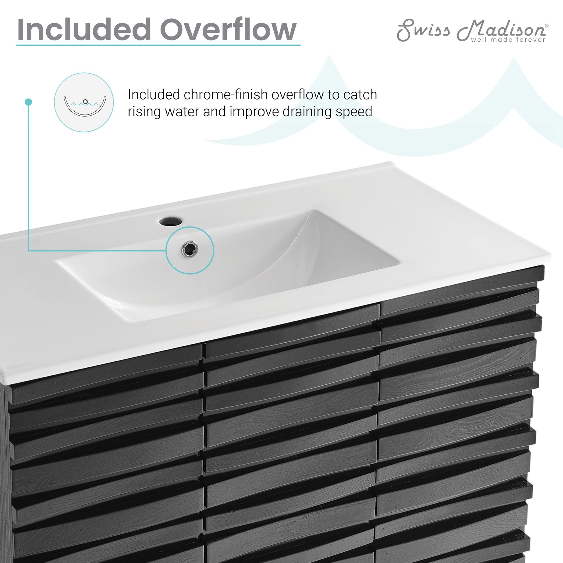 Elevate your bathroom with the Swiss Madison Cascade 36 Bathroom Vanity in Black. Immerse yourself in its sleek and modern design, featuring fluid lines and captivating forms that create a tranquil atmosphere. Crafted with meticulous attention to detail, this exquisite vanity will transform your space into a stylish sanctuary of functionality. Embrace luxury and sophistication with the Cascade collection, designed to reflect your unique taste. Add a touch of elegance to your bathroom with this stunning black vanity.