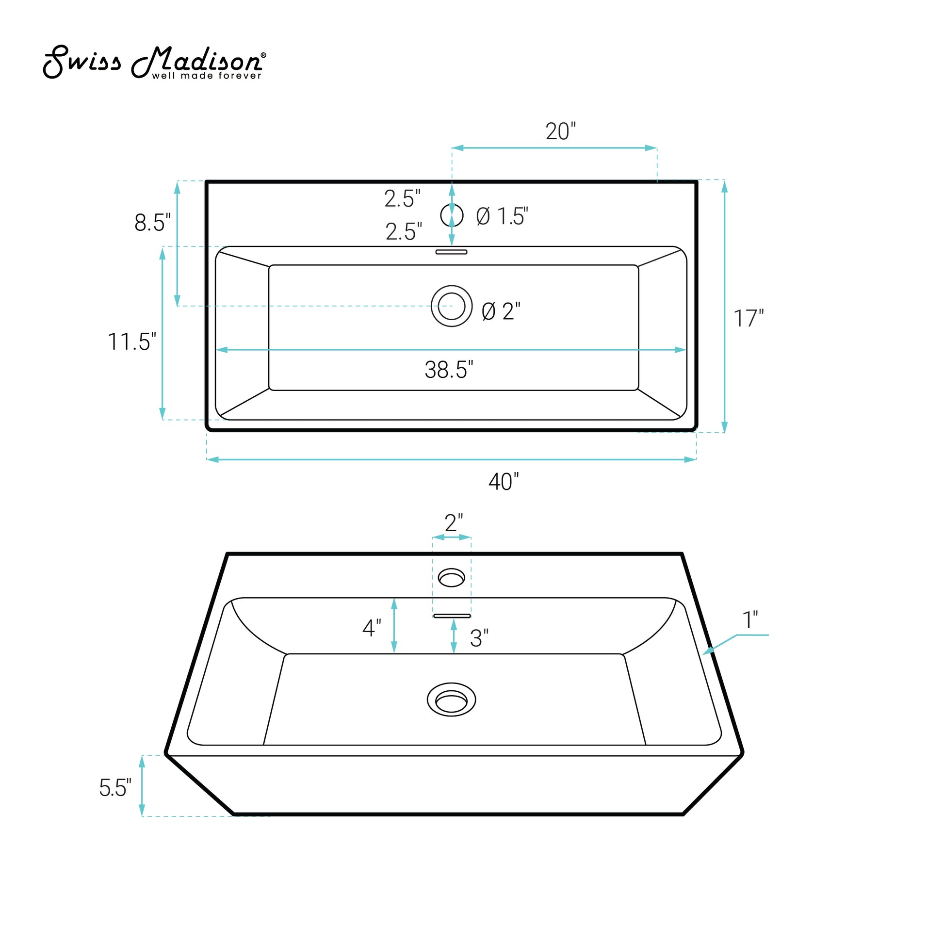 Swiss Madison, Claire 40" Rectangle Wall-Mount Bathroom Sink in Matte Black — Elevate the ambiance of your bathroom with the Swiss Madison, Claire 40 Rectangle Wall-Mount Bathroom Sink in Matte Black. This stunning sink from the Claire collection exudes radiant elegance with its ethereal design. Embrace contemporary simplicity and innovative aesthetics with this space-efficient and sleek sink. Add a touch of sophistication to your bathroom with this matte black finish sink.
