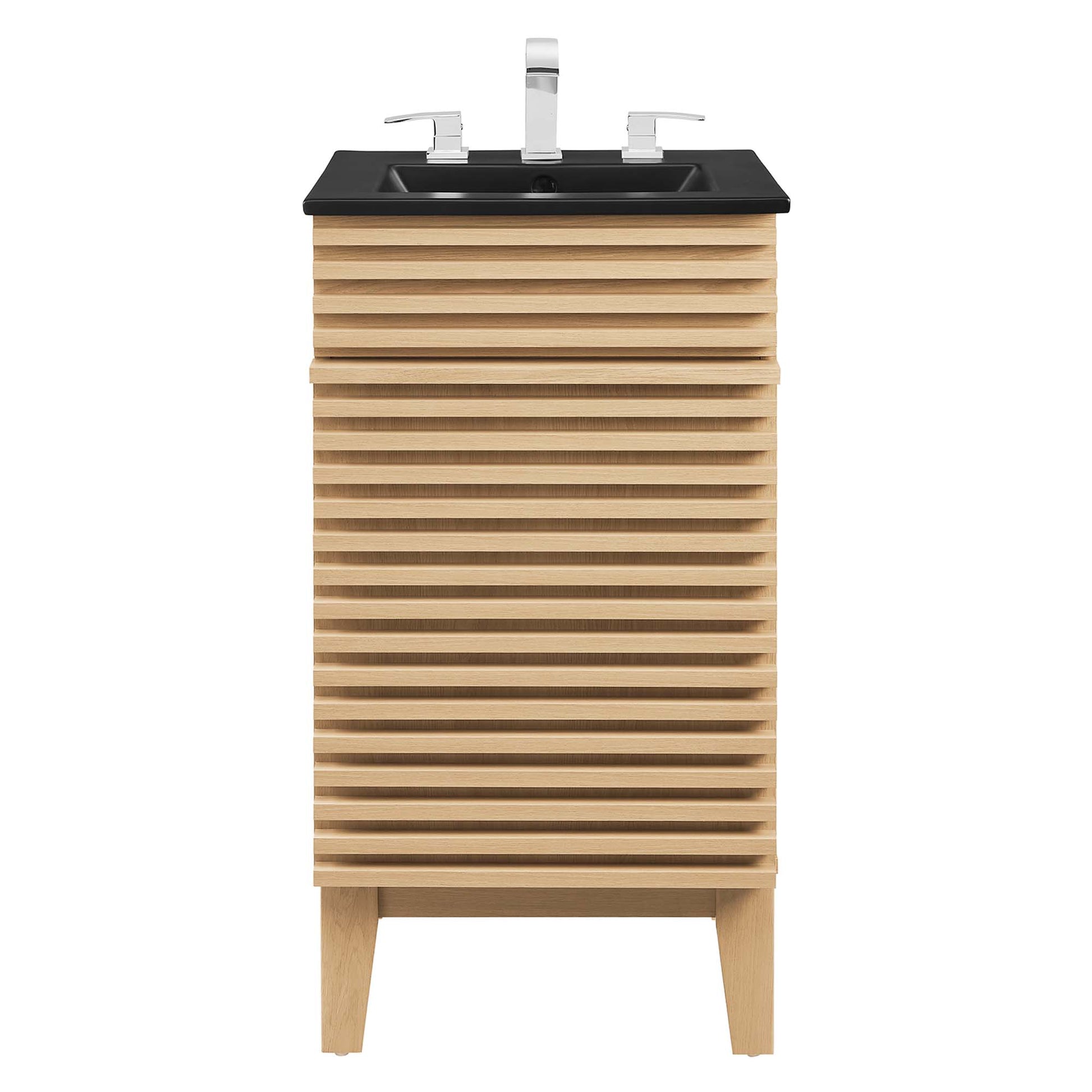 Tap into mid-century aesthetics with the Render Vanity. Render Bathroom Vanity features a durable particleboard frame with smooth laminate, four tapered wood legs, and adjustable storage shelf behind a soft-close hinged door. A curved ceramic basin and integrated countertop with three faucet holes create sleek lines and crisp design for an edgy style designed to meet your needs. Boasting a mid-century modern style this vanity features a solid construction with a pleasing look and practical functionality. 8" widespread faucet holes. Assembly required and fixtures not included.Mid-Century Modern Style Adjustable Storage Shelf Soft-Close Door 8" Centerset Holes Integrated Countertop Particleboard and Laminate Construction Assembly Required