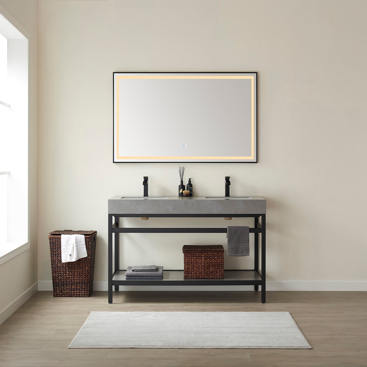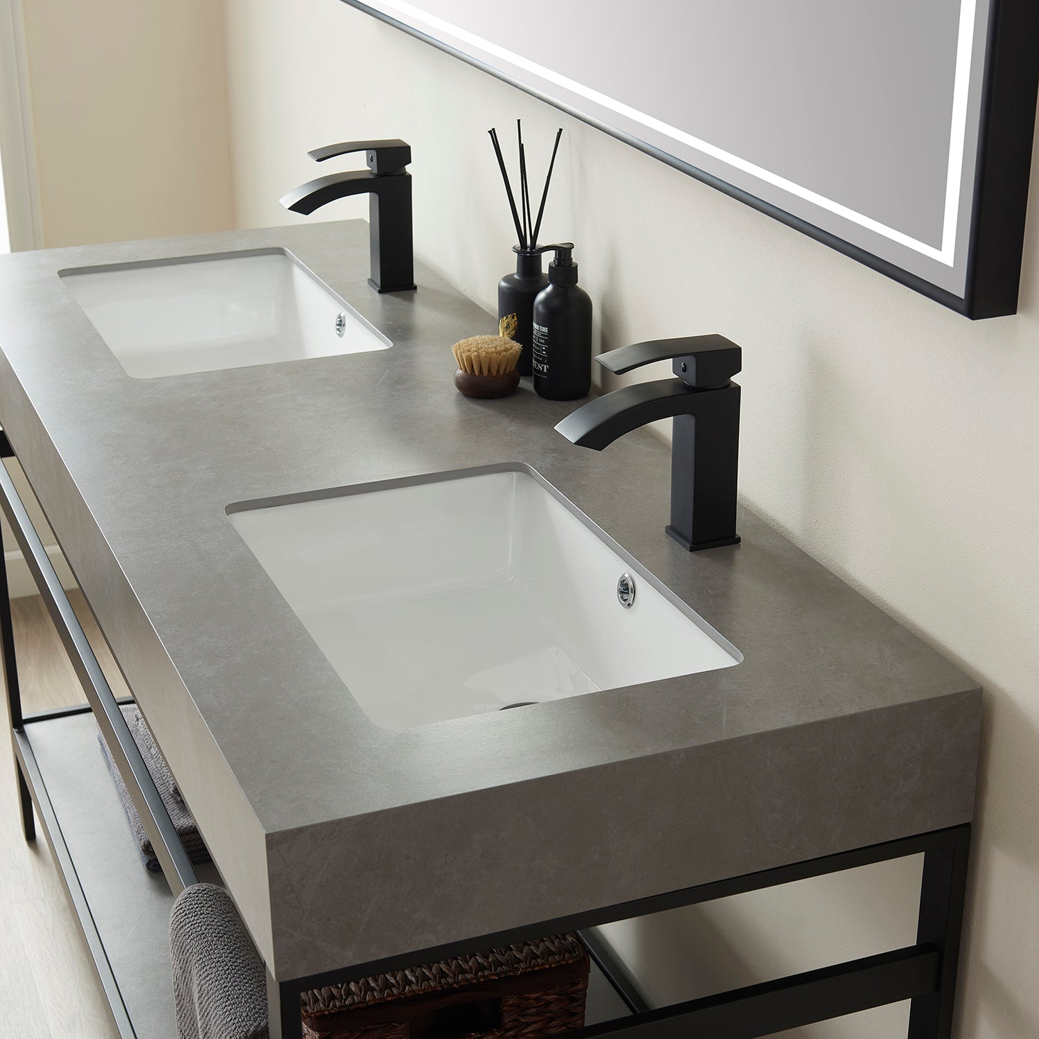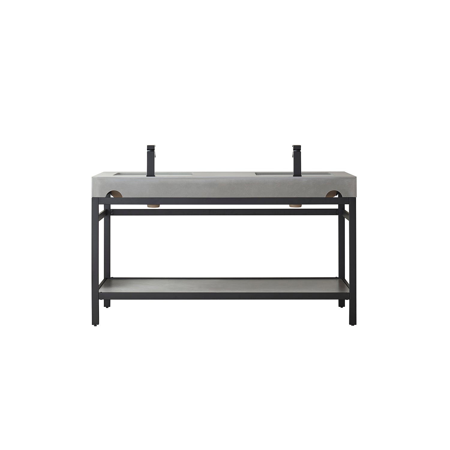 Elevate your bathroom decor with the modern and sleek Funes 60M Double Sink Bath Vanity in Matt Black Metal Support. This set includes a luxurious Grey Sintered Stone Top and Mirror, providing a sophisticated touch to your space.