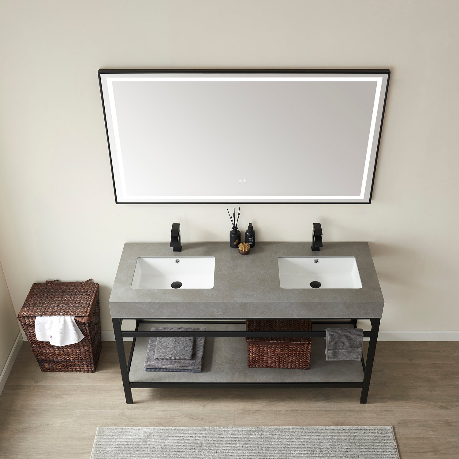 Upgrade your bathroom with the stunning Funes 60M Double Sink Bath Vanity in Matt Black Metal Support with Grey Sintered Stone Top and Mirror today!