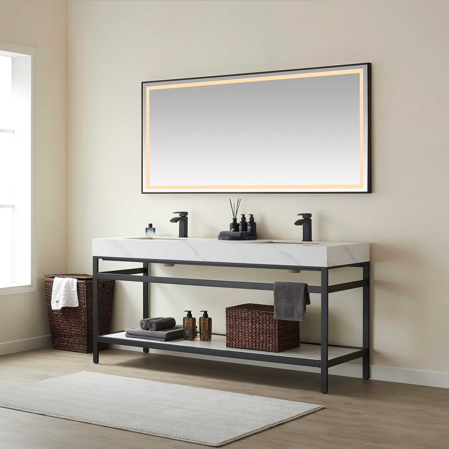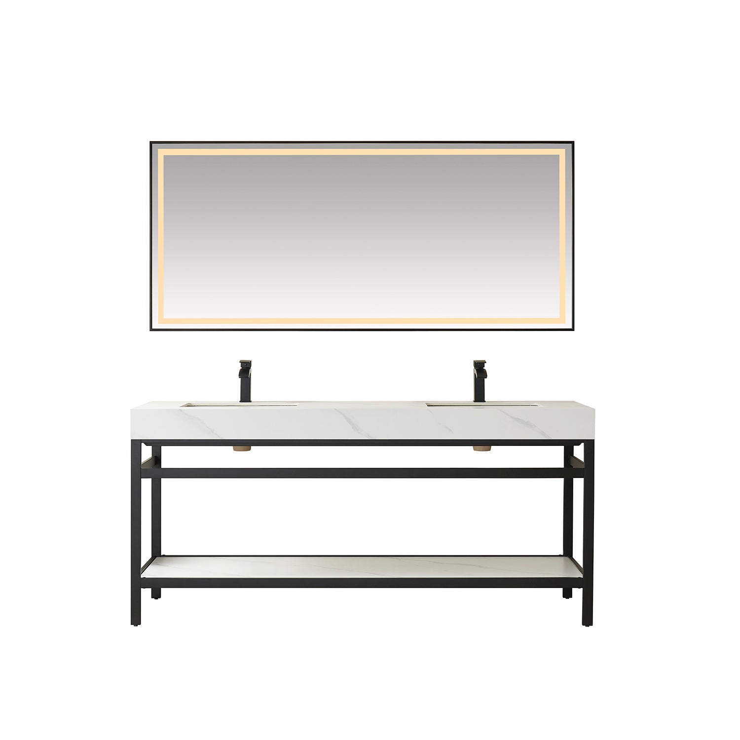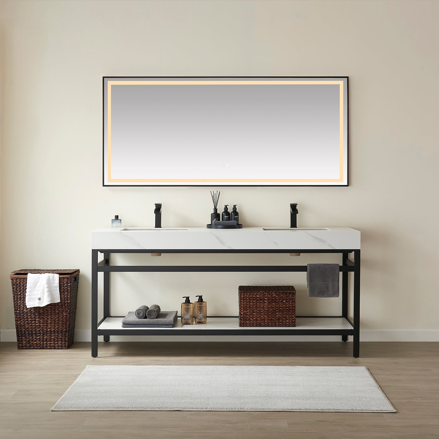 Vinnova, Funes 72" Double Sink Bath Vanity in Matt Black Metal Support with White Sintered Stone Top and Mirror