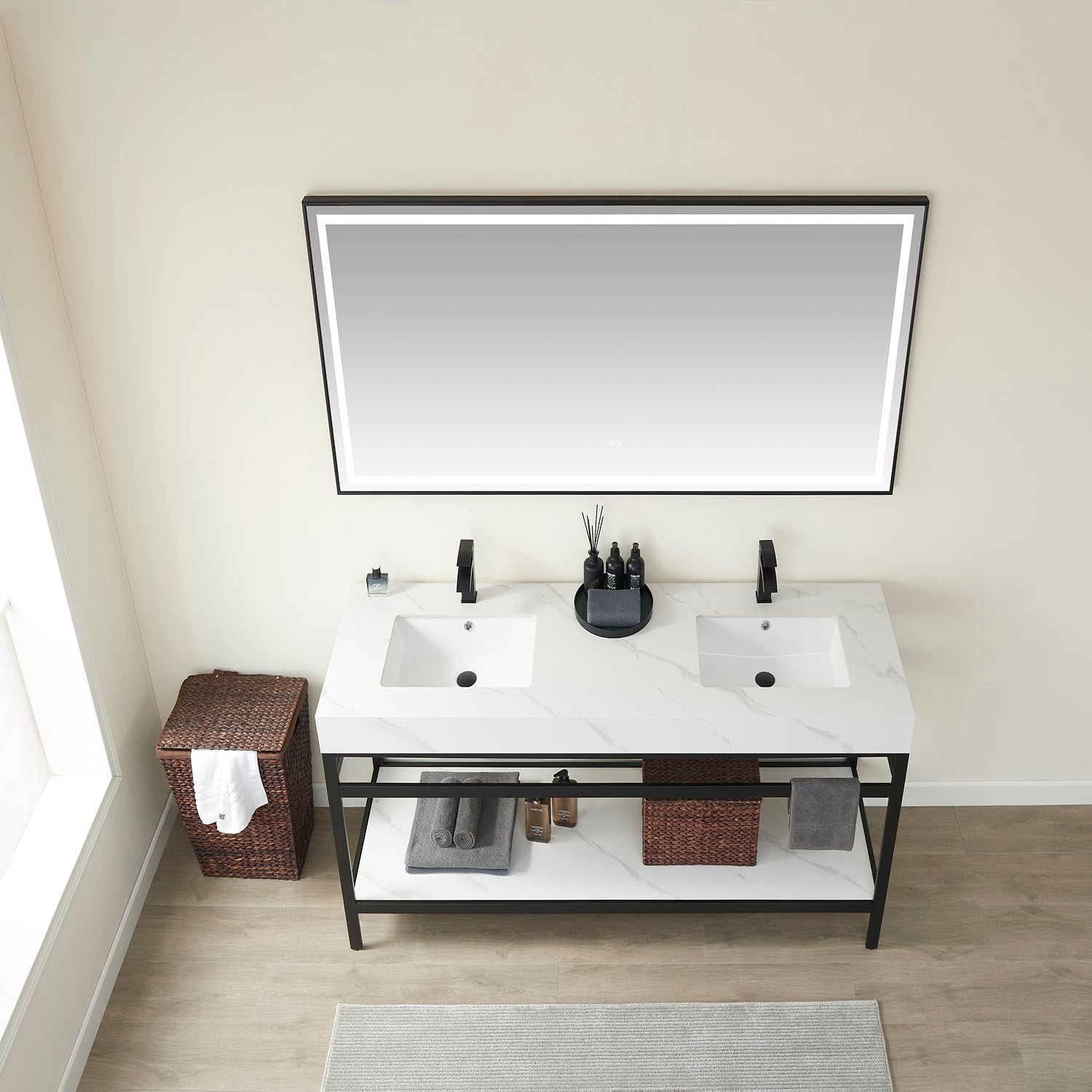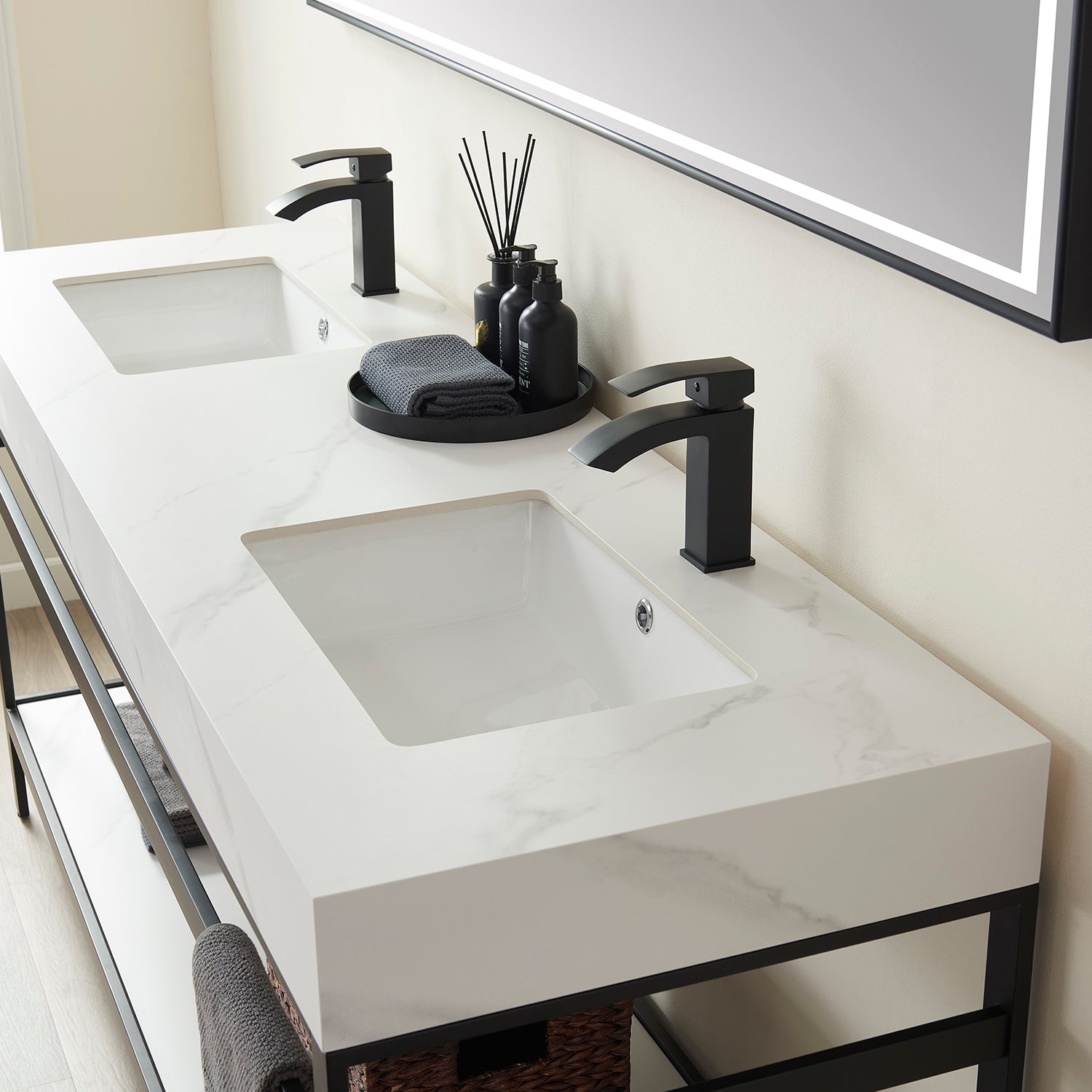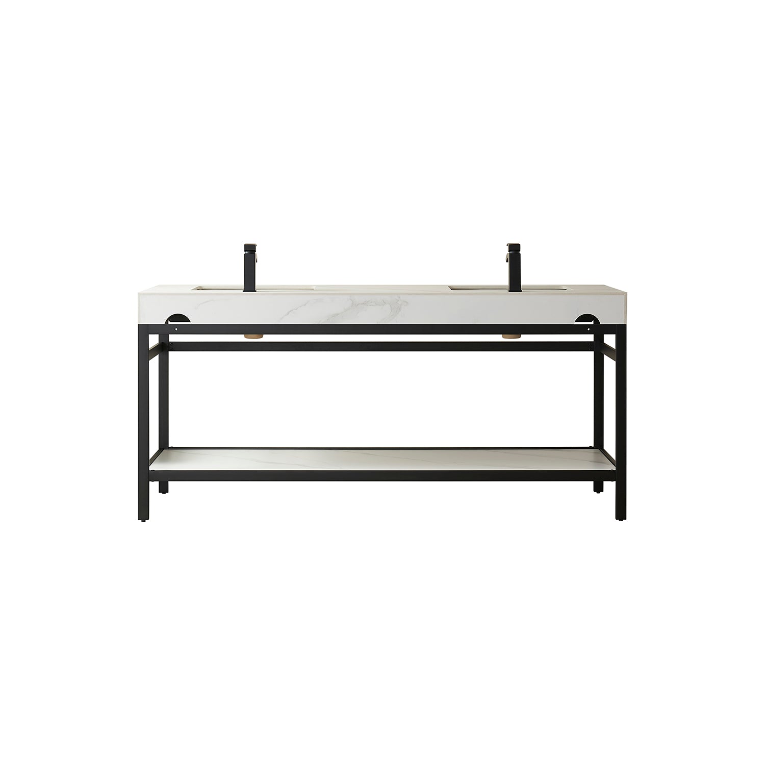 Vinnova, Funes 72" Double Sink Bath Vanity in Matt Black Metal Support with White Sintered Stone Top and Mirror