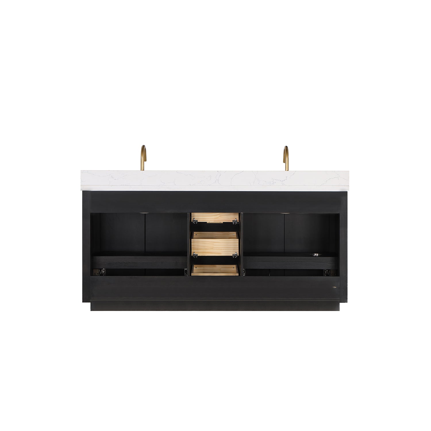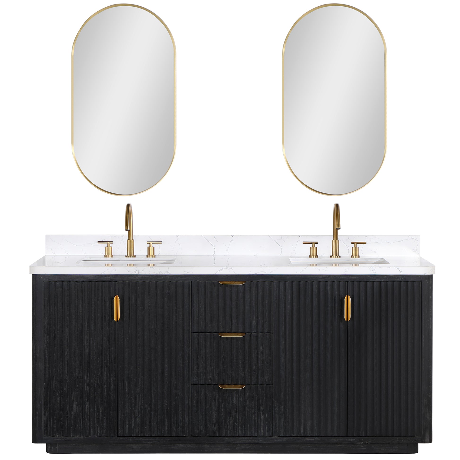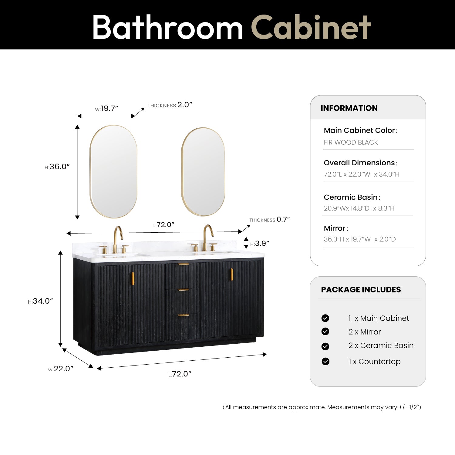 Introducing the luxurious Cádiz 72in. Free-standing Double Bathroom Vanity in Fir Wood Black with Composite top in Lightning White and Mirror.