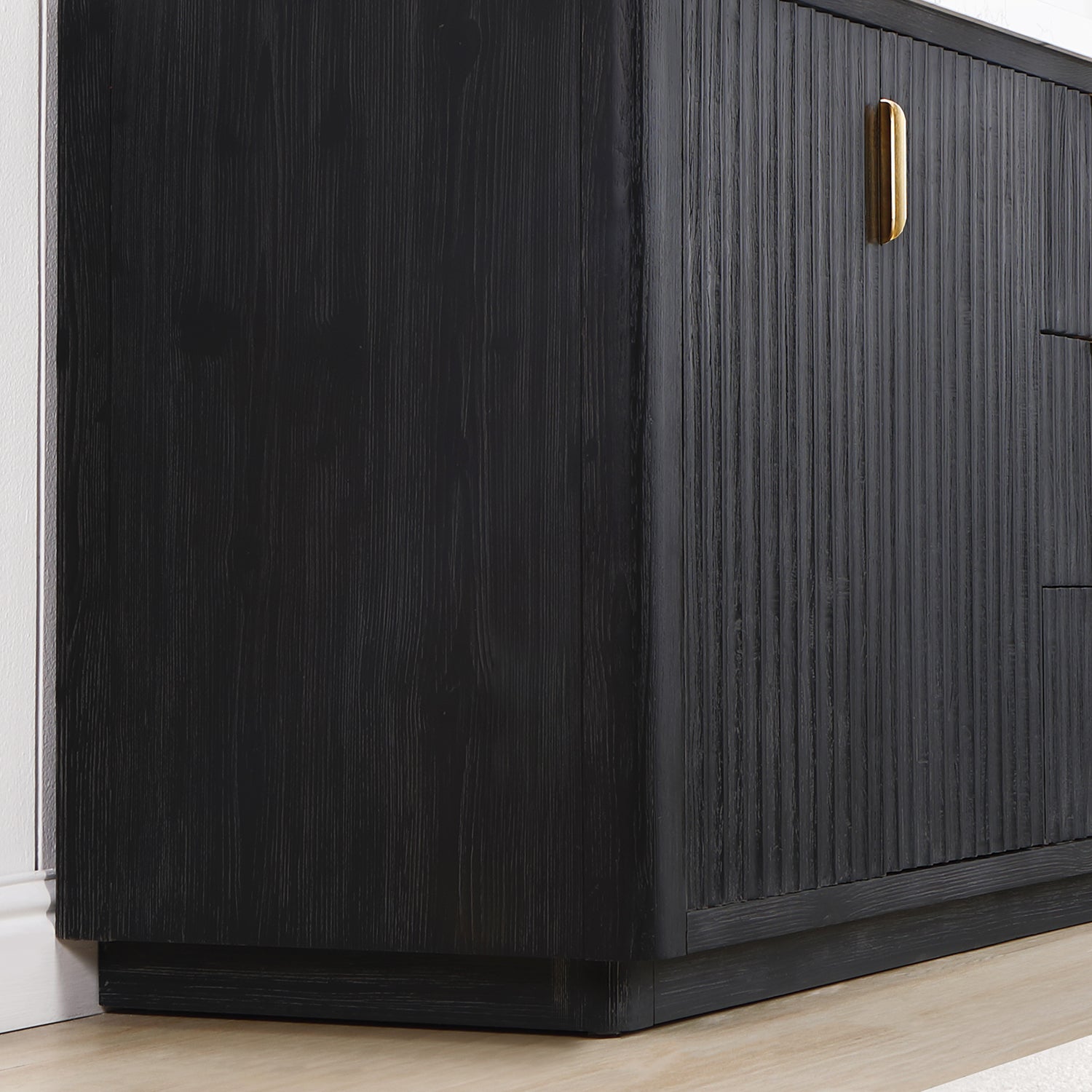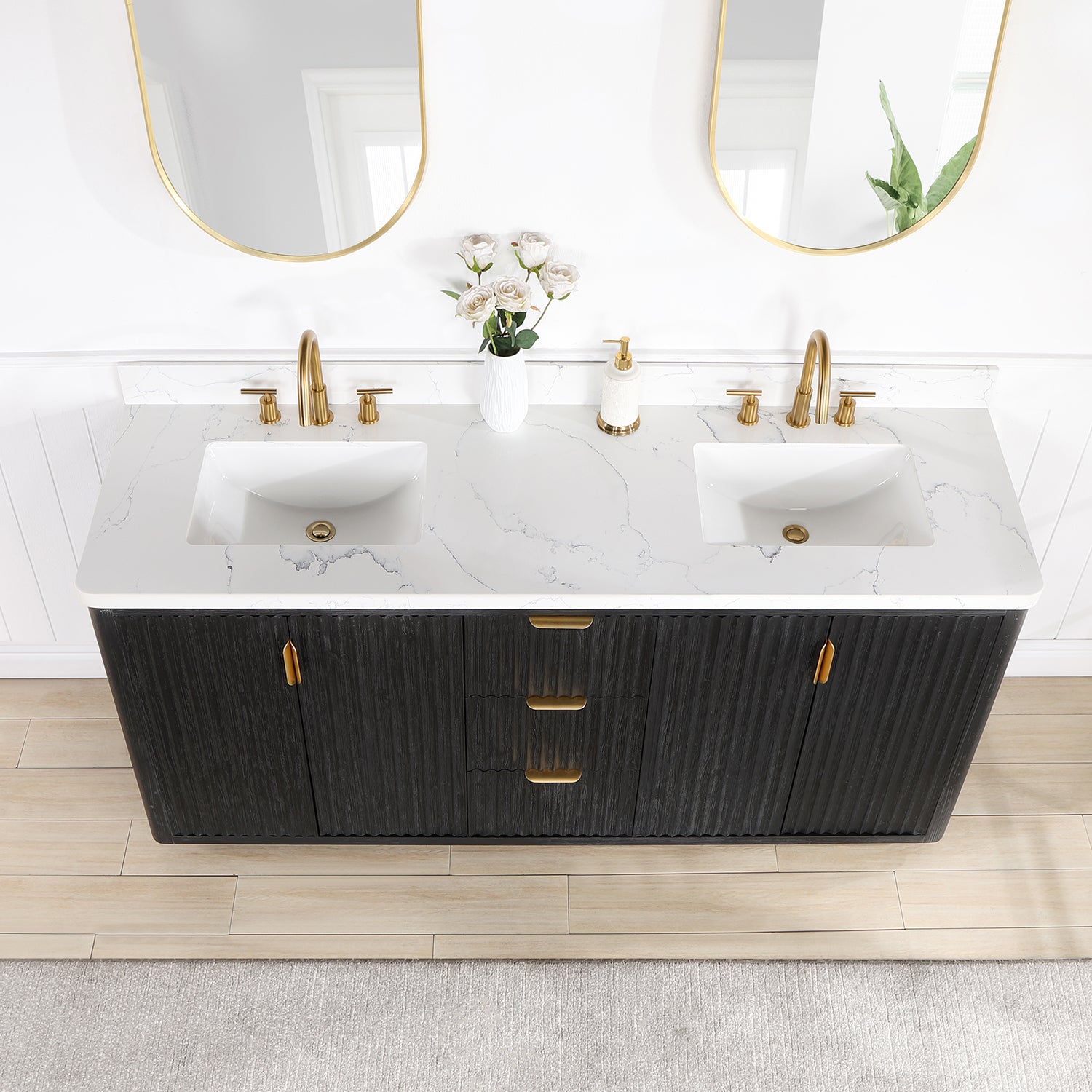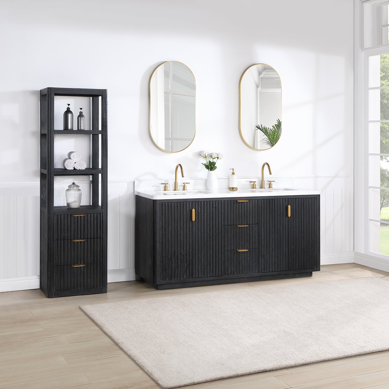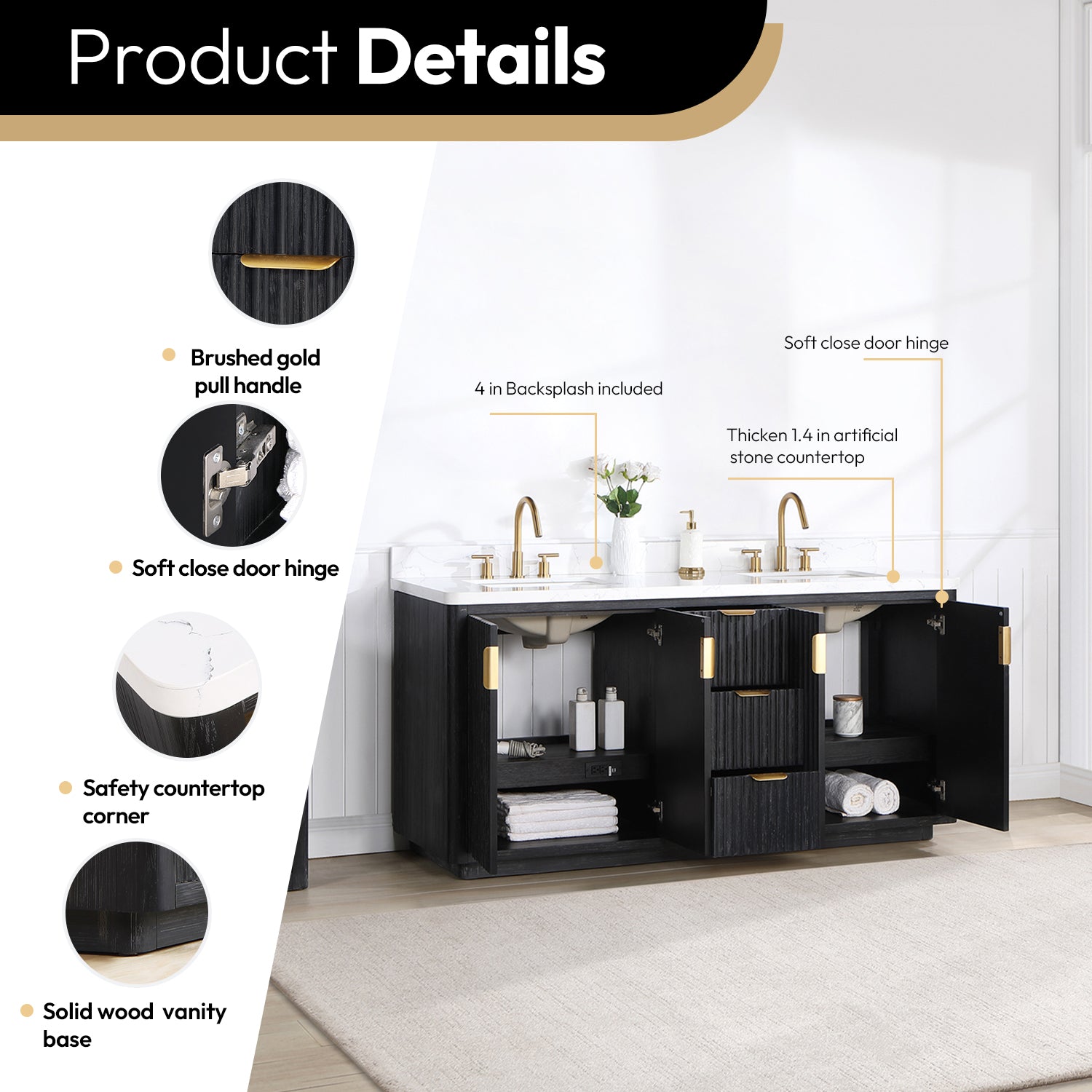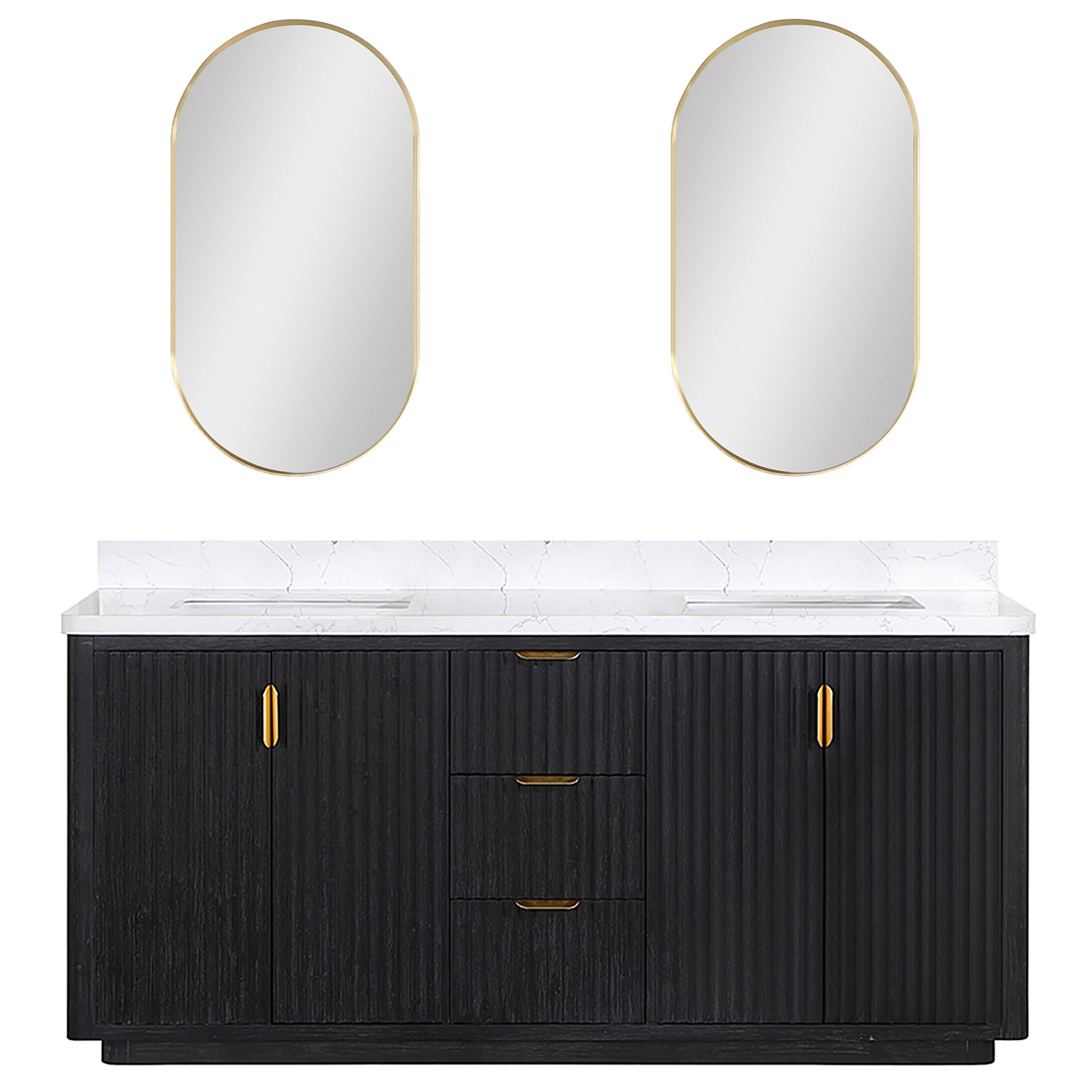 Elevate your bathroom with this stunning double vanity set, featuring a sleek fir wood black finish and a striking lightning white composite top. Complete the look with the included mirror for a cohesive and stylish bathroom design.
