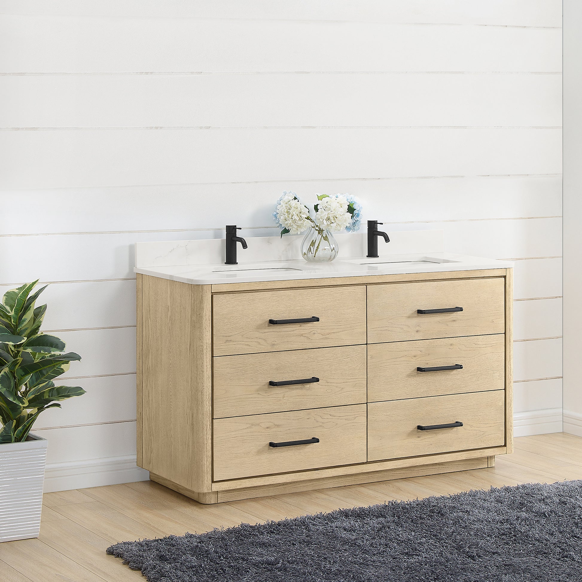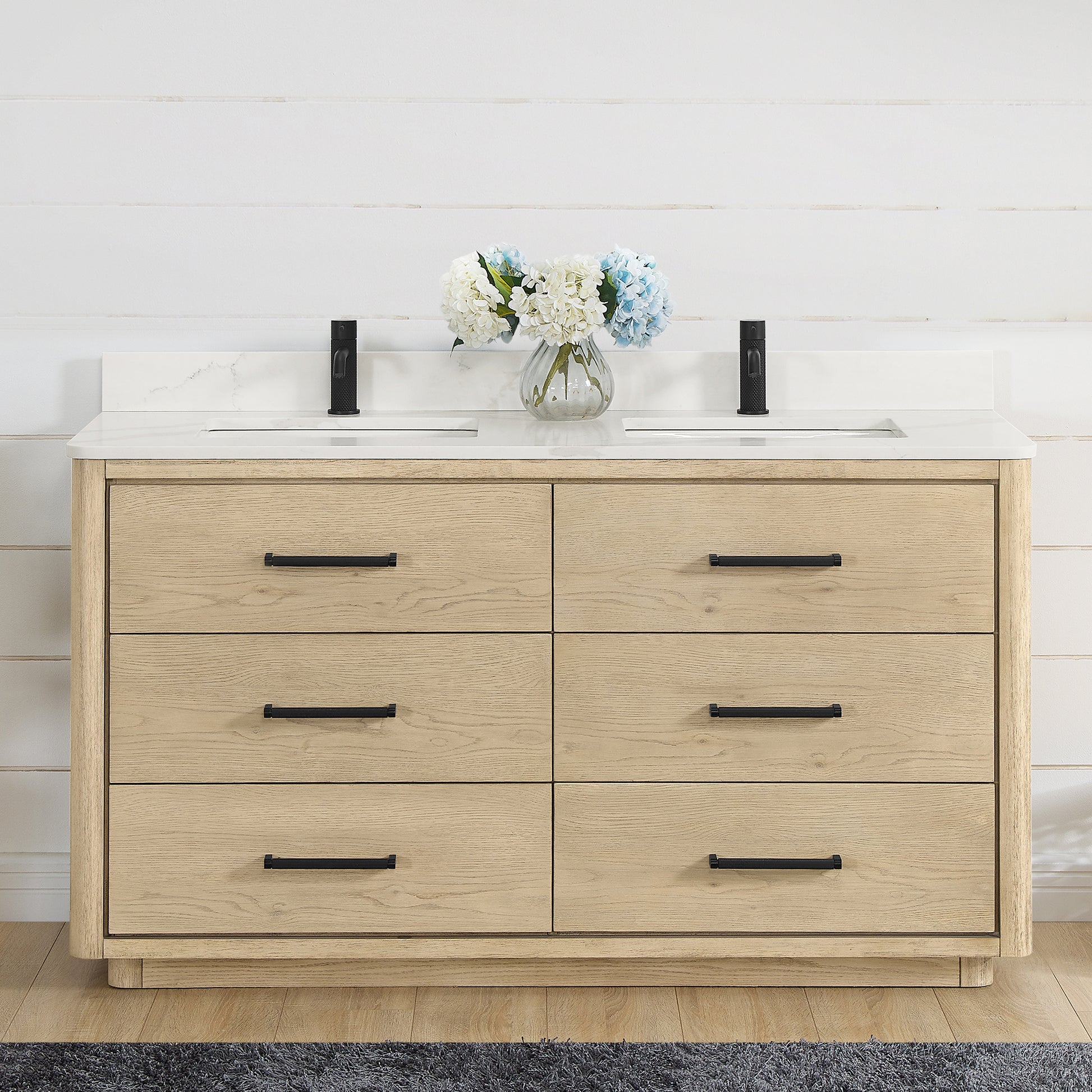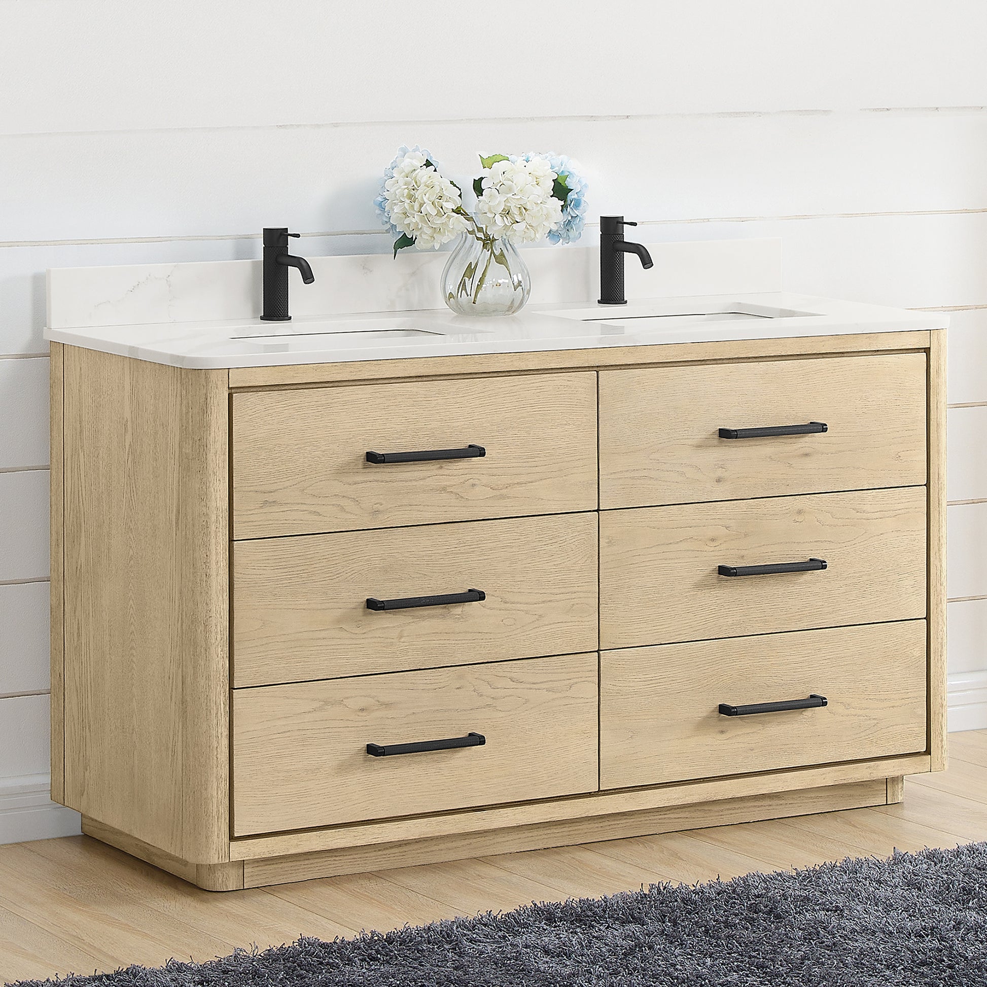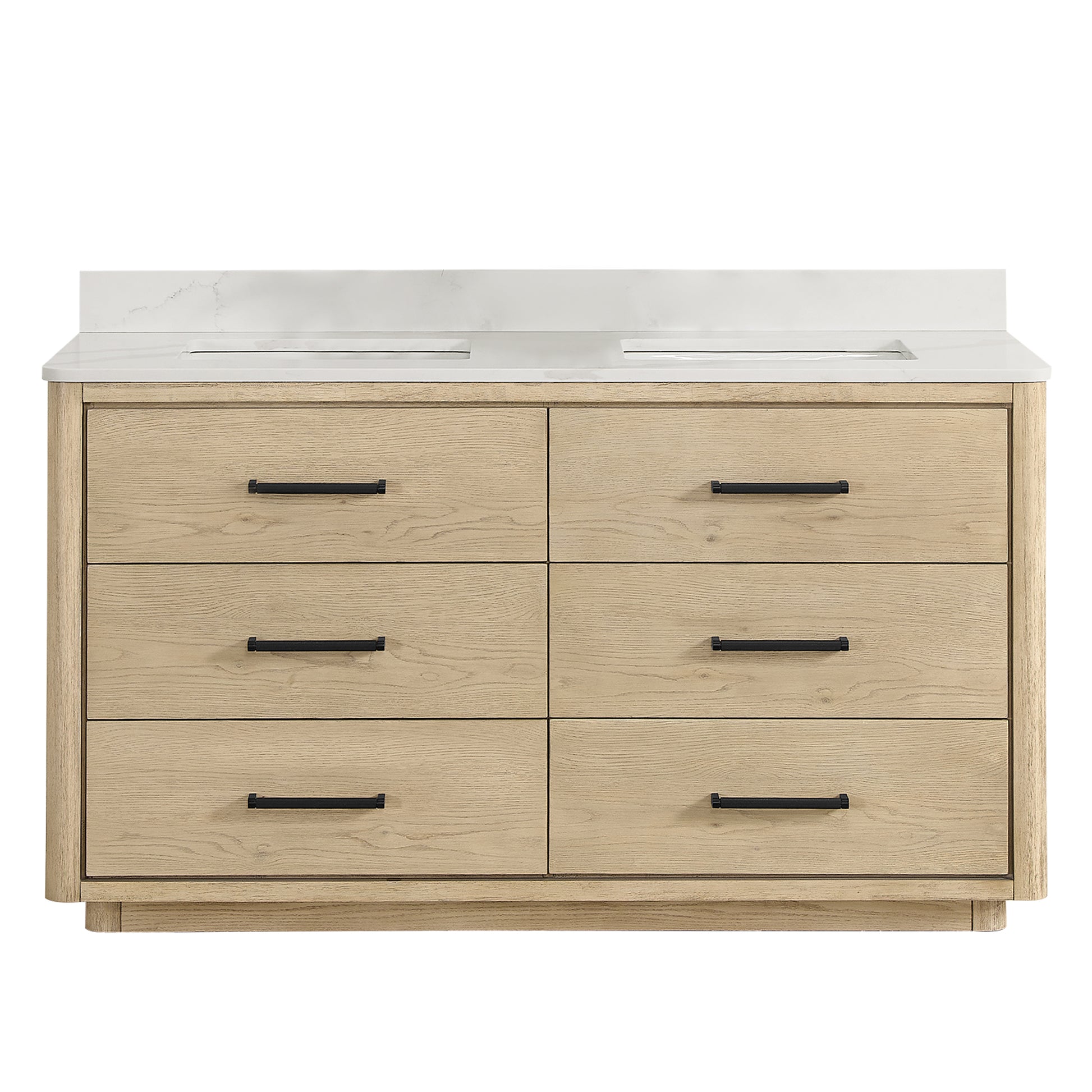 Vinnova, Porto 60M" Free-standing Double Bath Vanity in Aged Natural Oak with Fish Maw White Quartz Stone Top