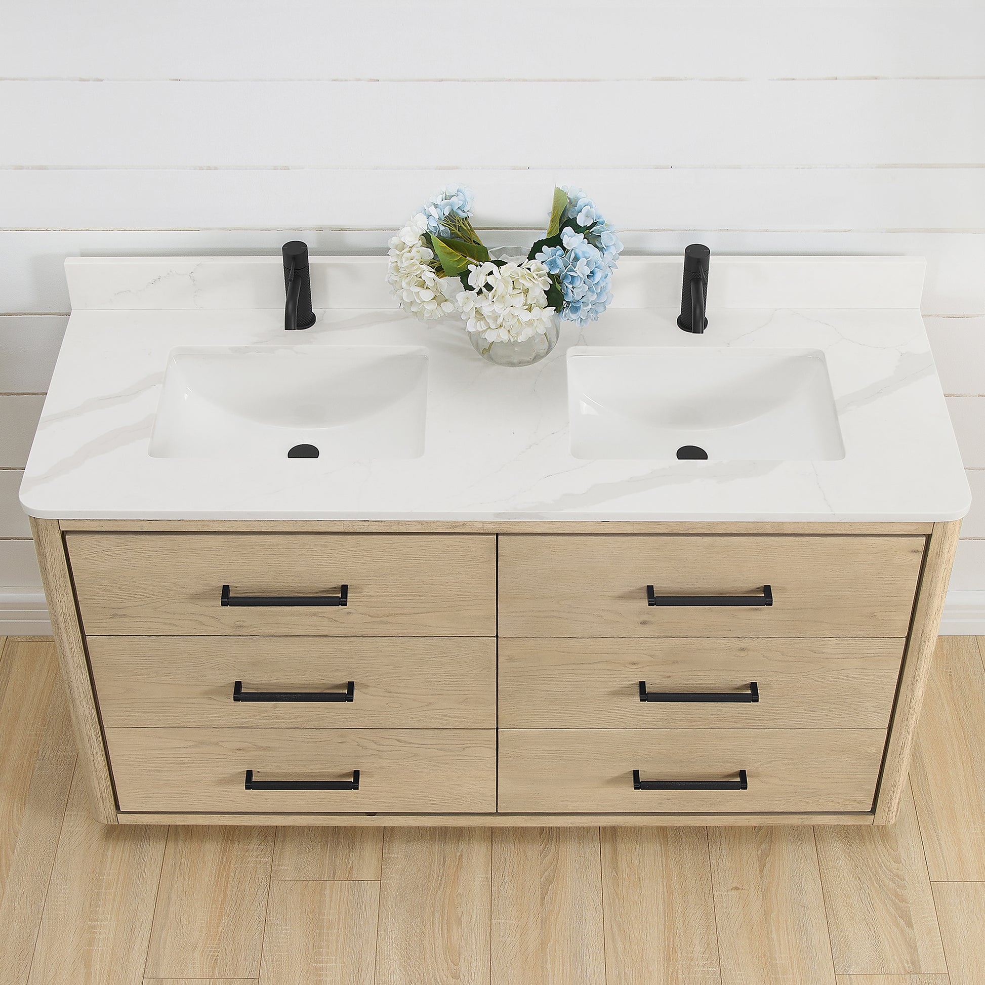 Upgrade your bathroom with the luxurious Porto 60M Free-standing Double Bath Vanity in Aged Natural Oak with Fish Maw White Quartz Stone Top. This elegantly designed vanity brings a touch of sophistication and style to any bathroom space.