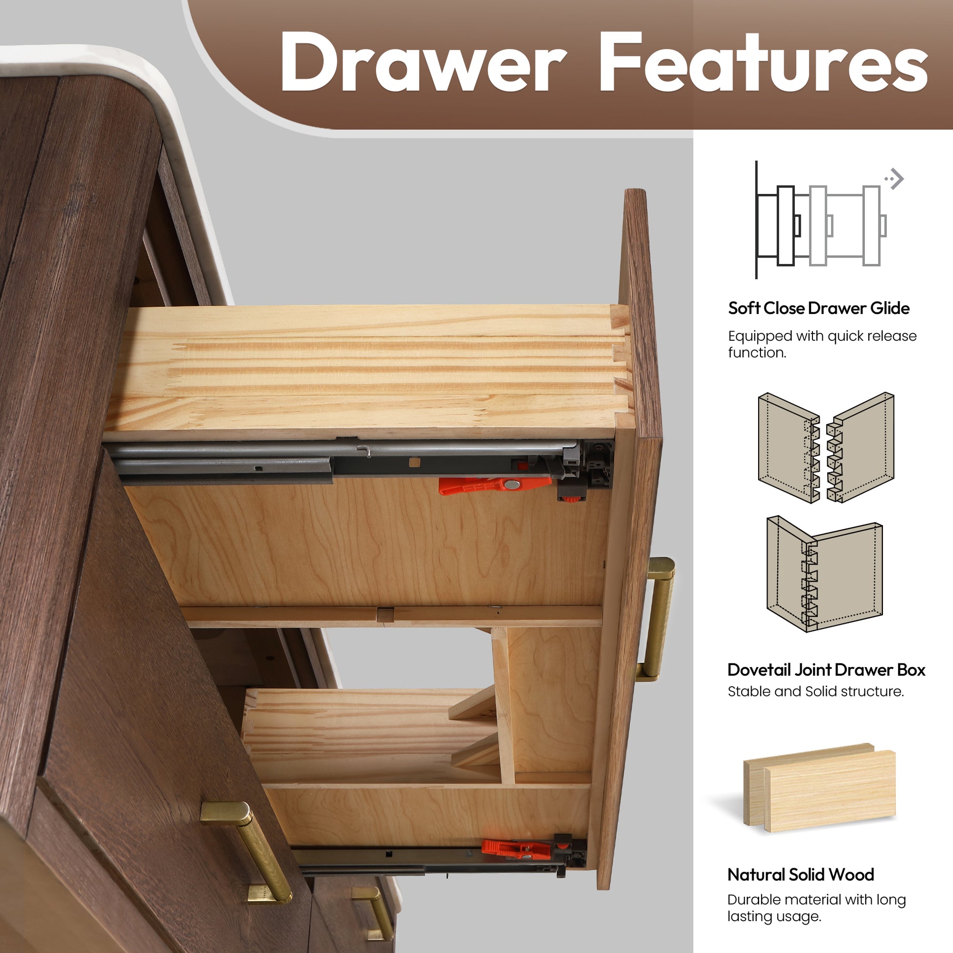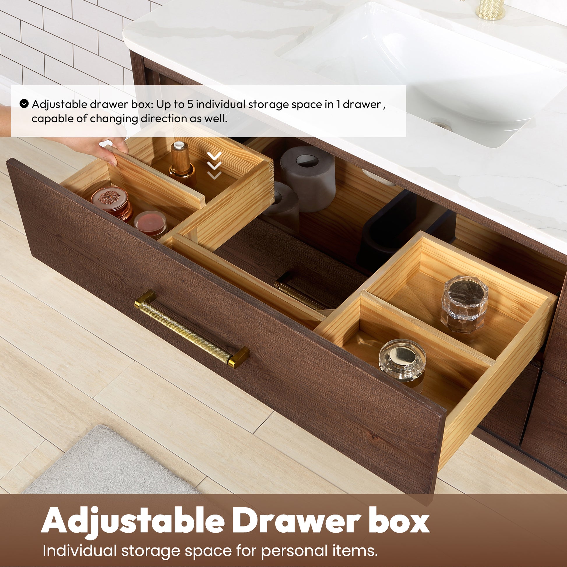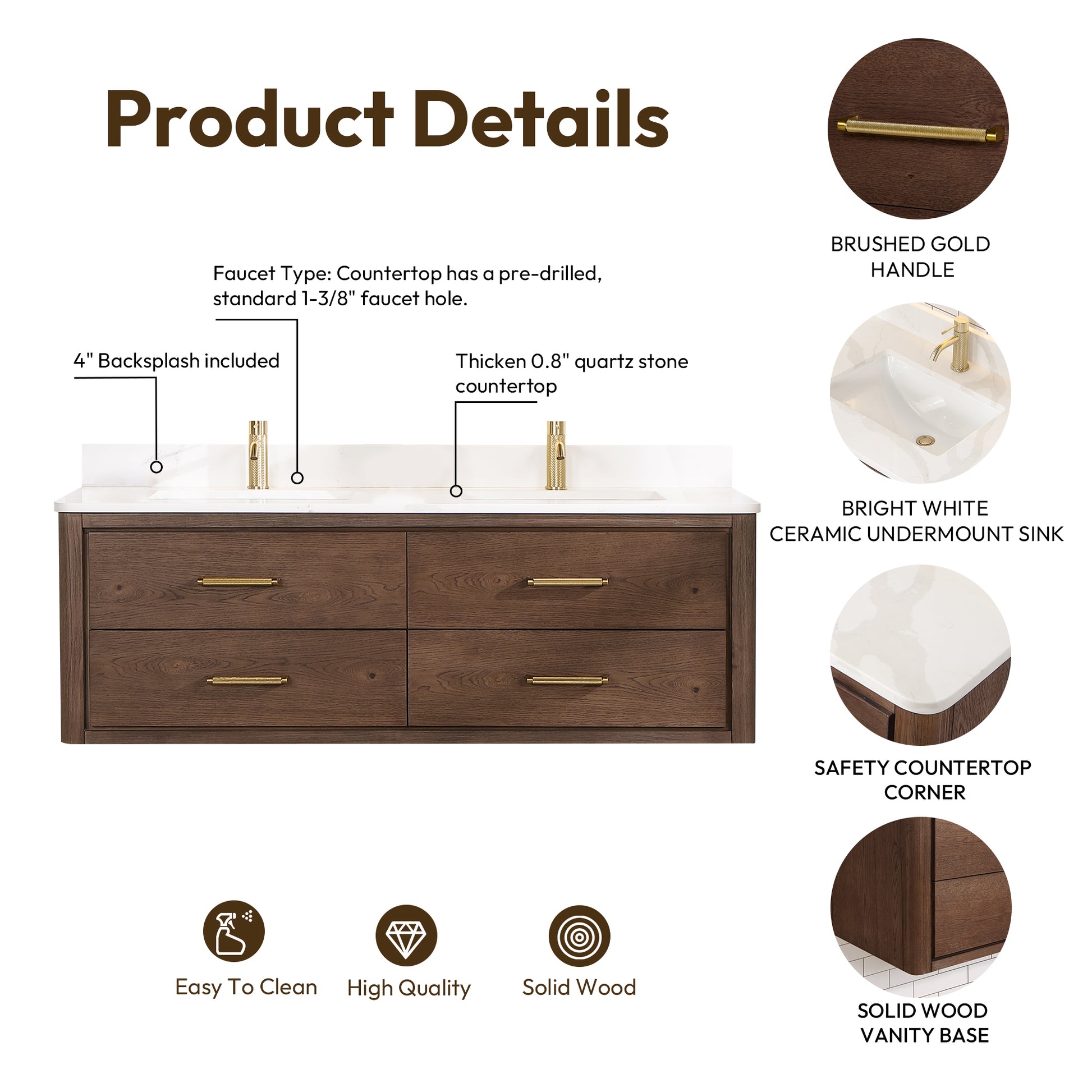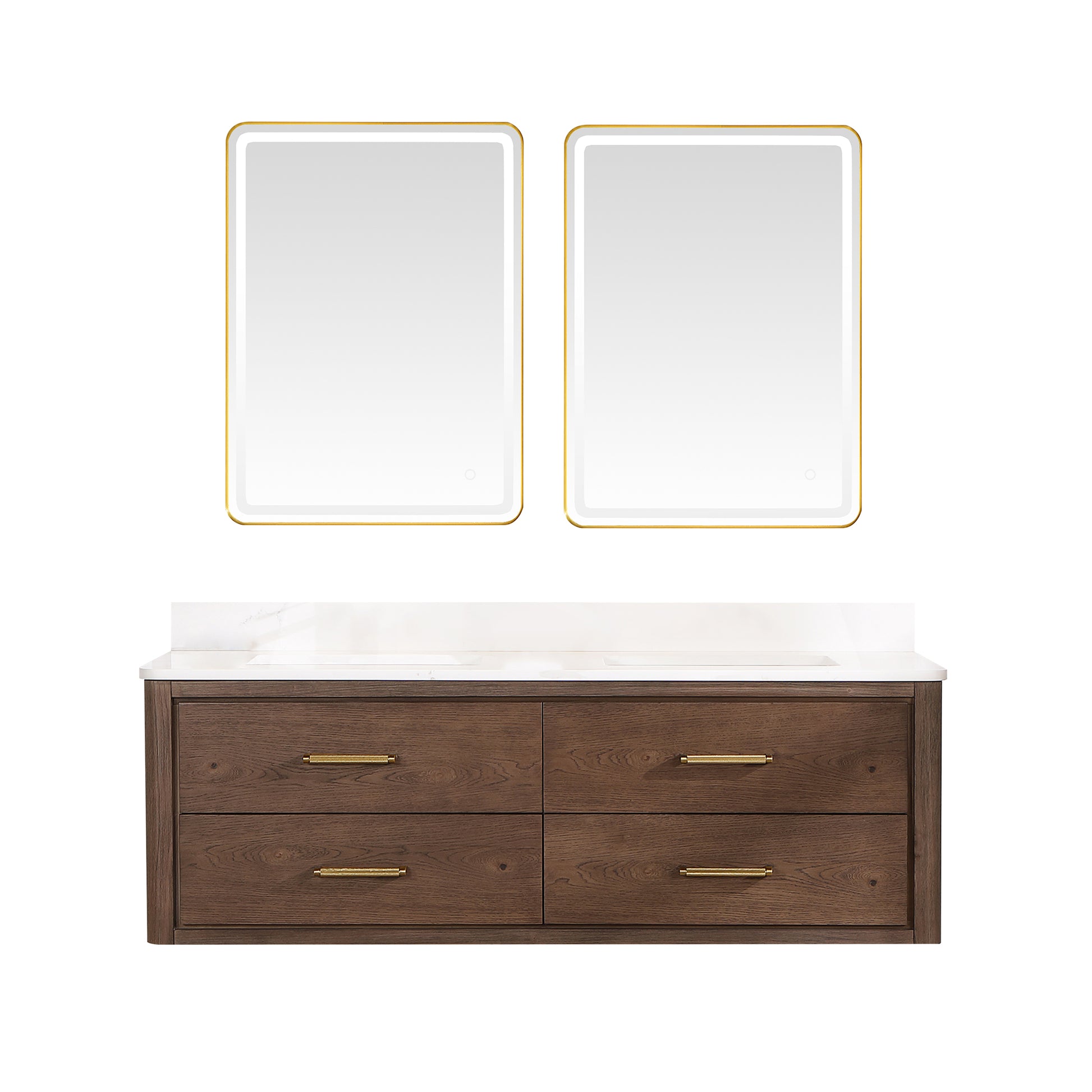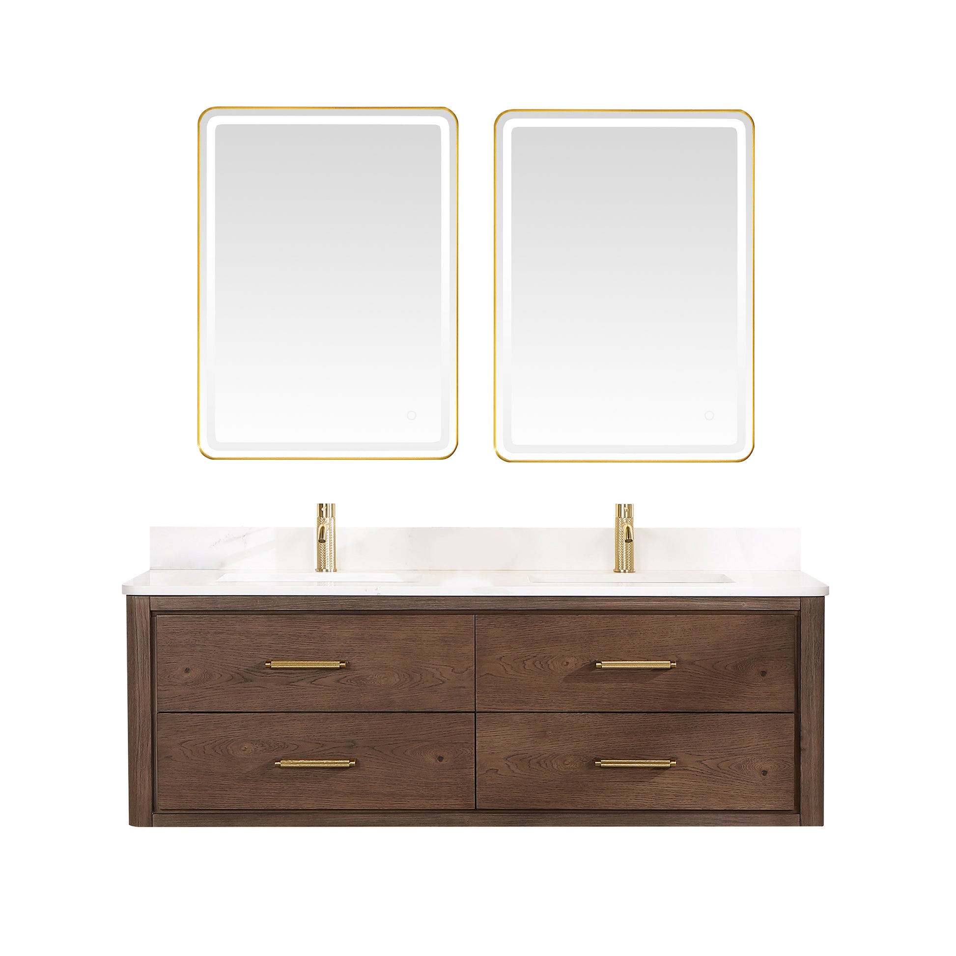 Elevate your bathroom with the Cristo 60M Floating Double Bath Vanity in Aged Dark Brown Oak with Fish Maw White Quartz Stone Top and Mirror. This stunning piece combines modern design with timeless elegance, making it the perfect addition to any bathroom.