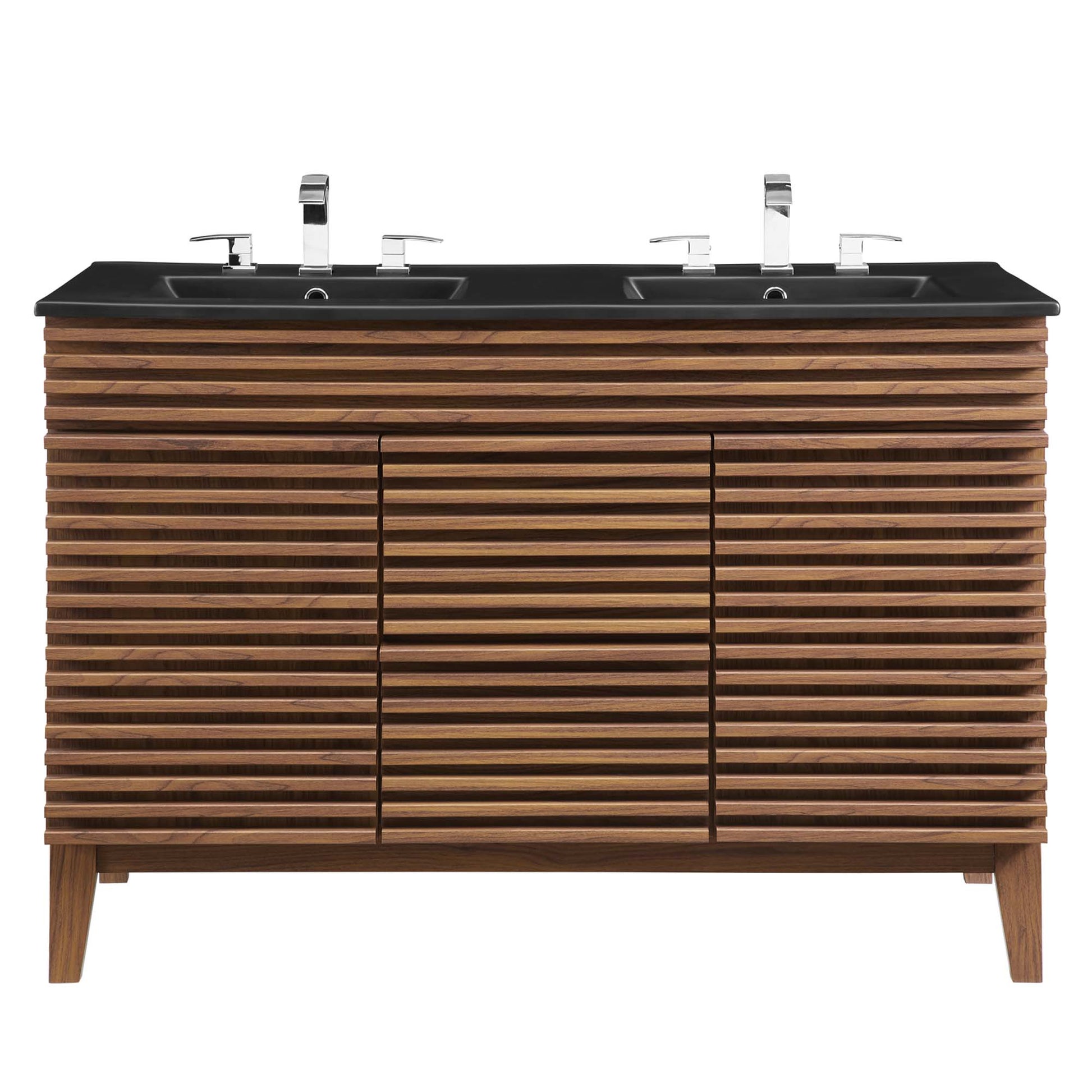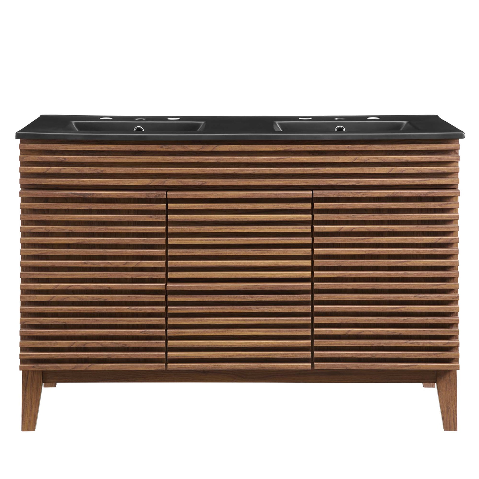 Tap into mid-century aesthetics with the Render Vanity. The Render 48" Bathroom Vanity features a durable MDF and particleboard frame with smooth walnut grain laminate, four tapered wood legs, and ample under sink storage space in full-extension drawers and behind soft-close hinged doors. Crafted with ceramic, a double sink with an integrated countertop, 8" widespread, and rectangular sink basins continue the sleek look of this retro modern vanity. Clean lines and crisp design align for an edgy style designed to meet your needs. Boasting a mid-century modern style this vanity features a solid construction with a pleasing look and practical functionality. This double sink has 8" between basins and 24" between basin sink holes. Assembly required and fixtures not included.Mid-Century Modern Vanity Tapered Wood Legs Walnut Grain Vanity MDF and Particleboard Full-Extension Drawers Ceramic Double Sink Basin Fixtures Not Included