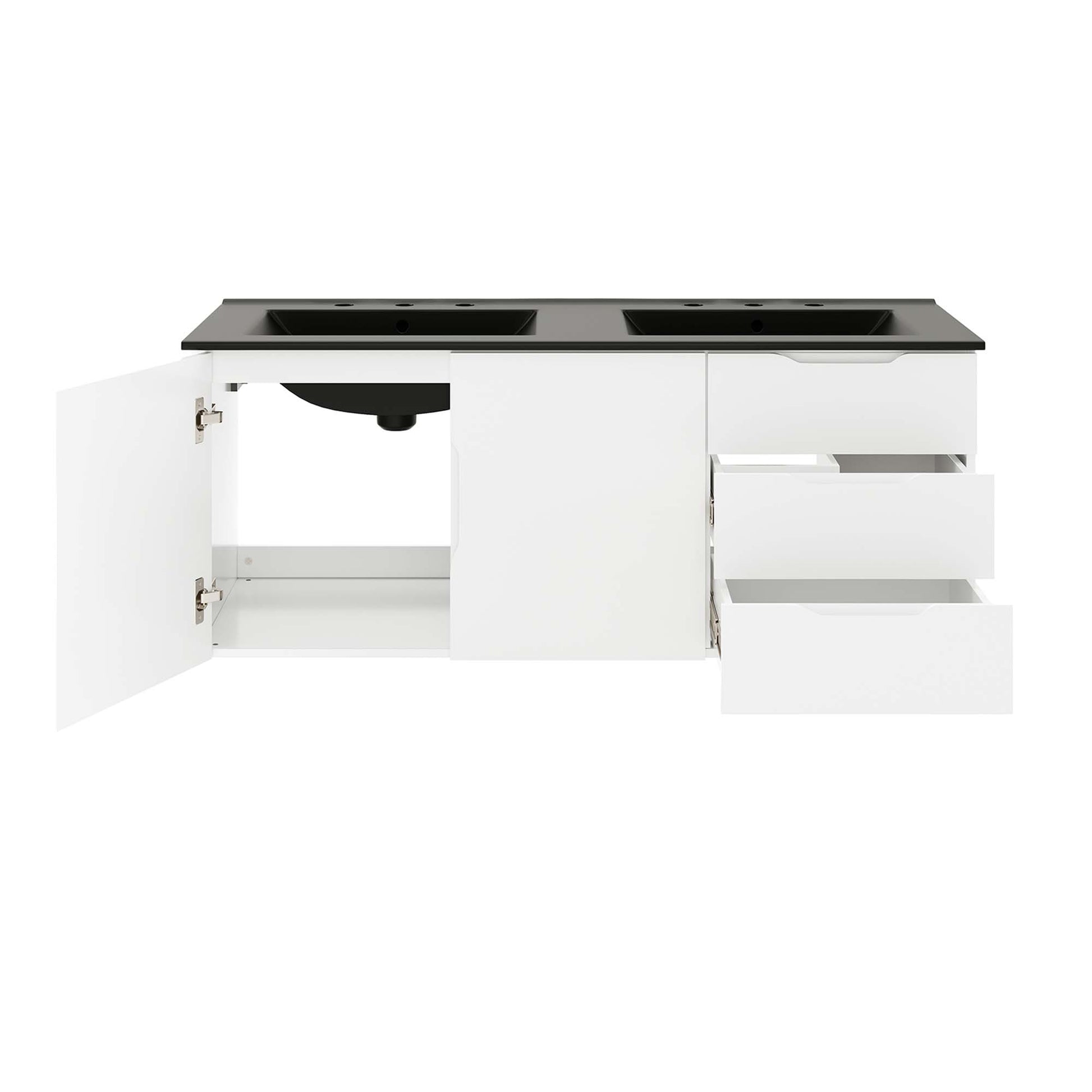 Energize your bathroom space with the modern design of the Vitality 48" Wall-Mount Bathroom Vanity. Boasting a sleek, clean-lined silhouette, this vanity is durably crafted with particleboard and MDF with a melamine finish. This vanity features a wall-mount design and is complete with ample storage space for all your bathroom essentials with two spacious drawers and an under-sink storage area behind two soft-close doors. This vanity is complete with a double sink ceramic basin with 8-inch widespread holes and an integrated countertop. This vanity boasts an open back to accommodate plumbing. This double sink has 8" between basins and 24" between basin sink holes. Fixtures not included. Assembly required.Modern Bathroom Vanity Soft-Close Doors MDF and Particleboard Construction Wall-Mount Design Ceramic Double Sink With Integrated Countertop 8" Centerset Faucet Holes Assembly Required