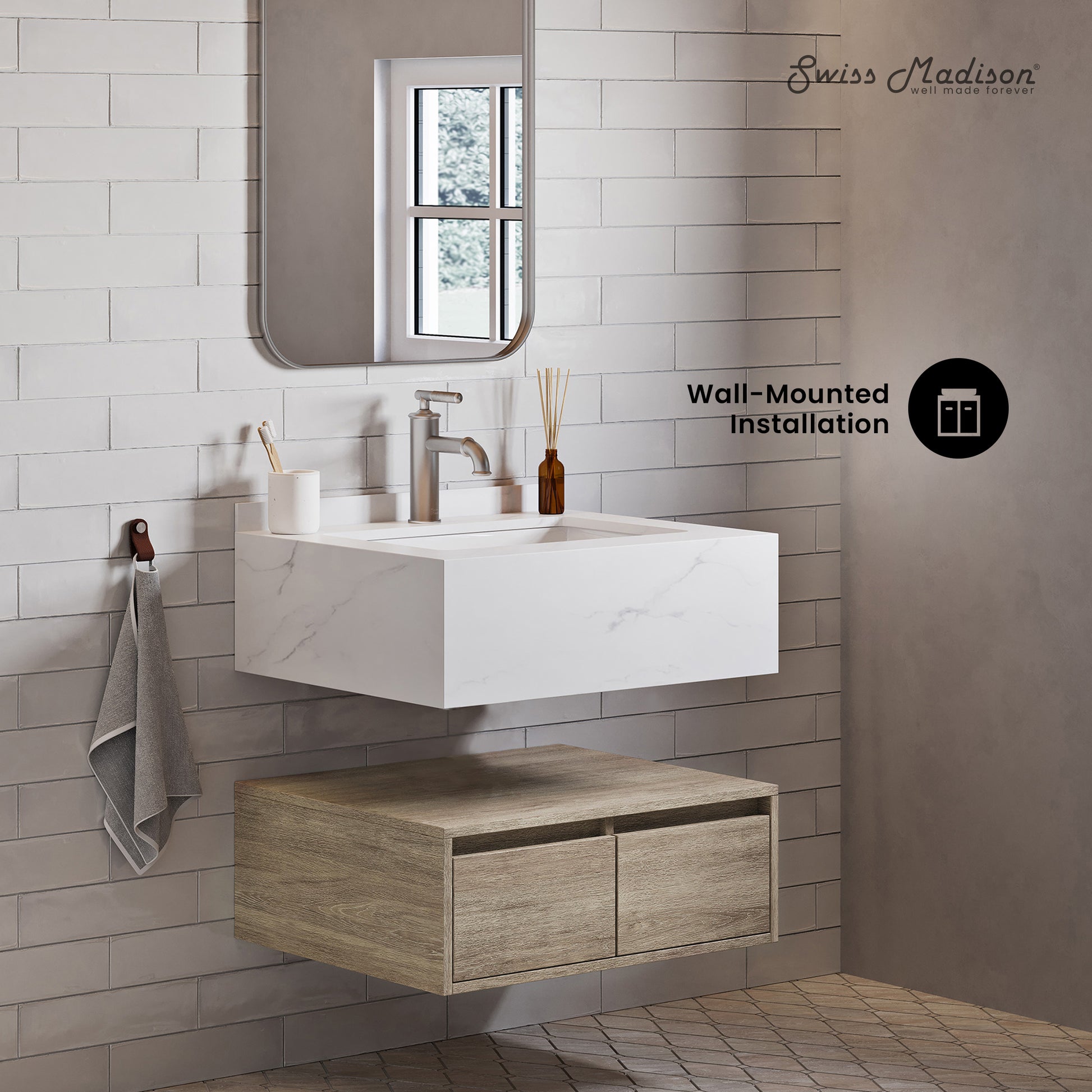 Swiss Madison Avancer 24" Wall-Mounted Vanity | Weathered Oak with Sink Top