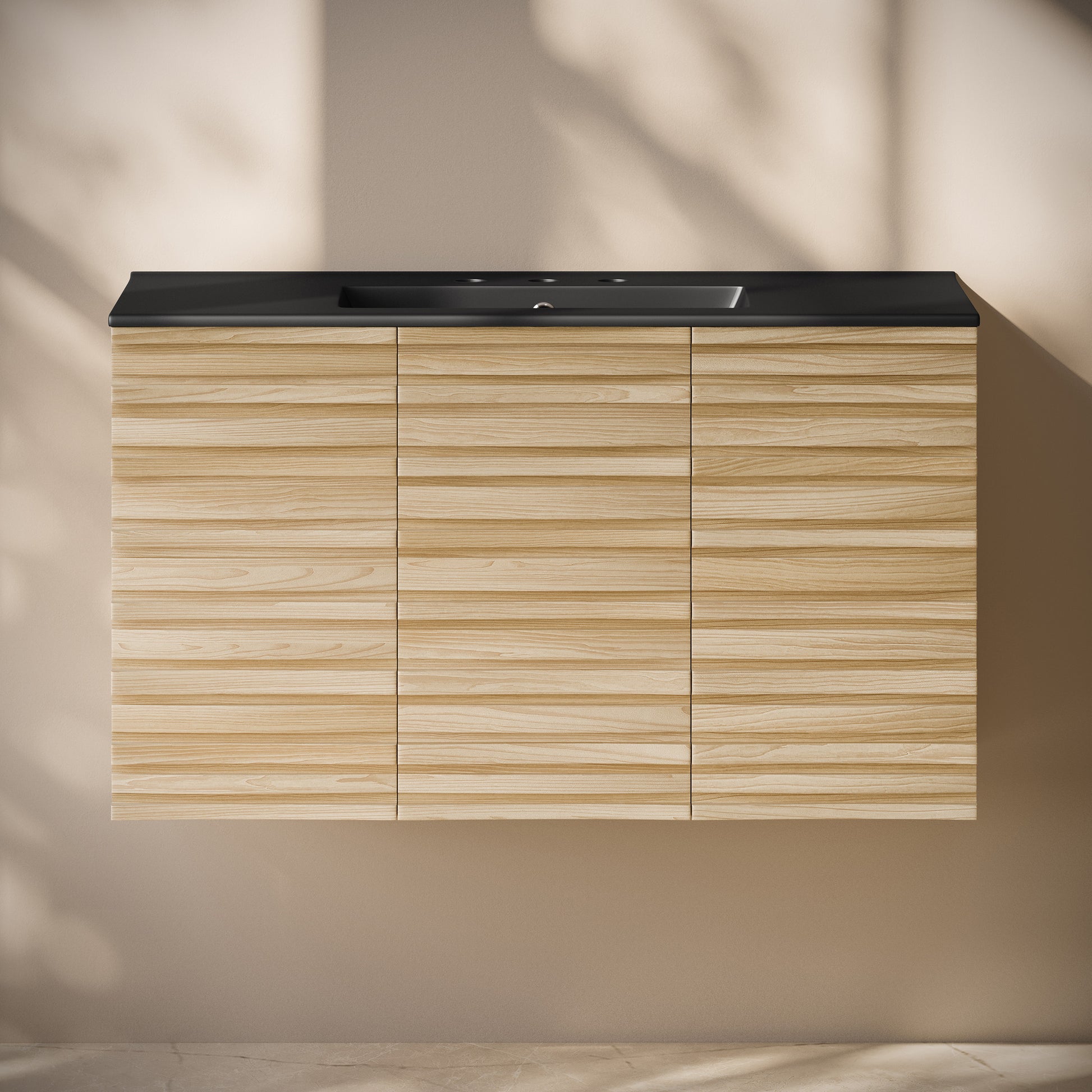 Swiss Madison Cascade 36" Wall-Mounted Vanity: Natural Oak with Black 3-Hole Widespread Sink Top