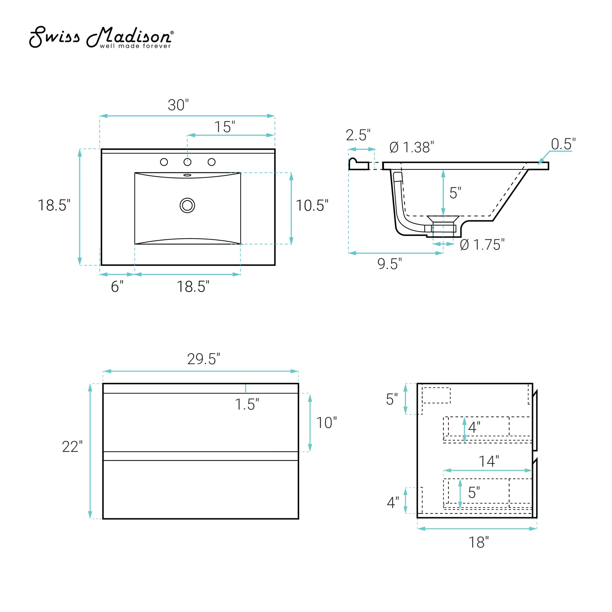 The Swiss Madison Liberte Wall-Mounted Bathroom Vanity measures 30 inches in width. Specific depth and height dimensions are not provided in the product details, allowing for flexible integration into various bathroom layouts.