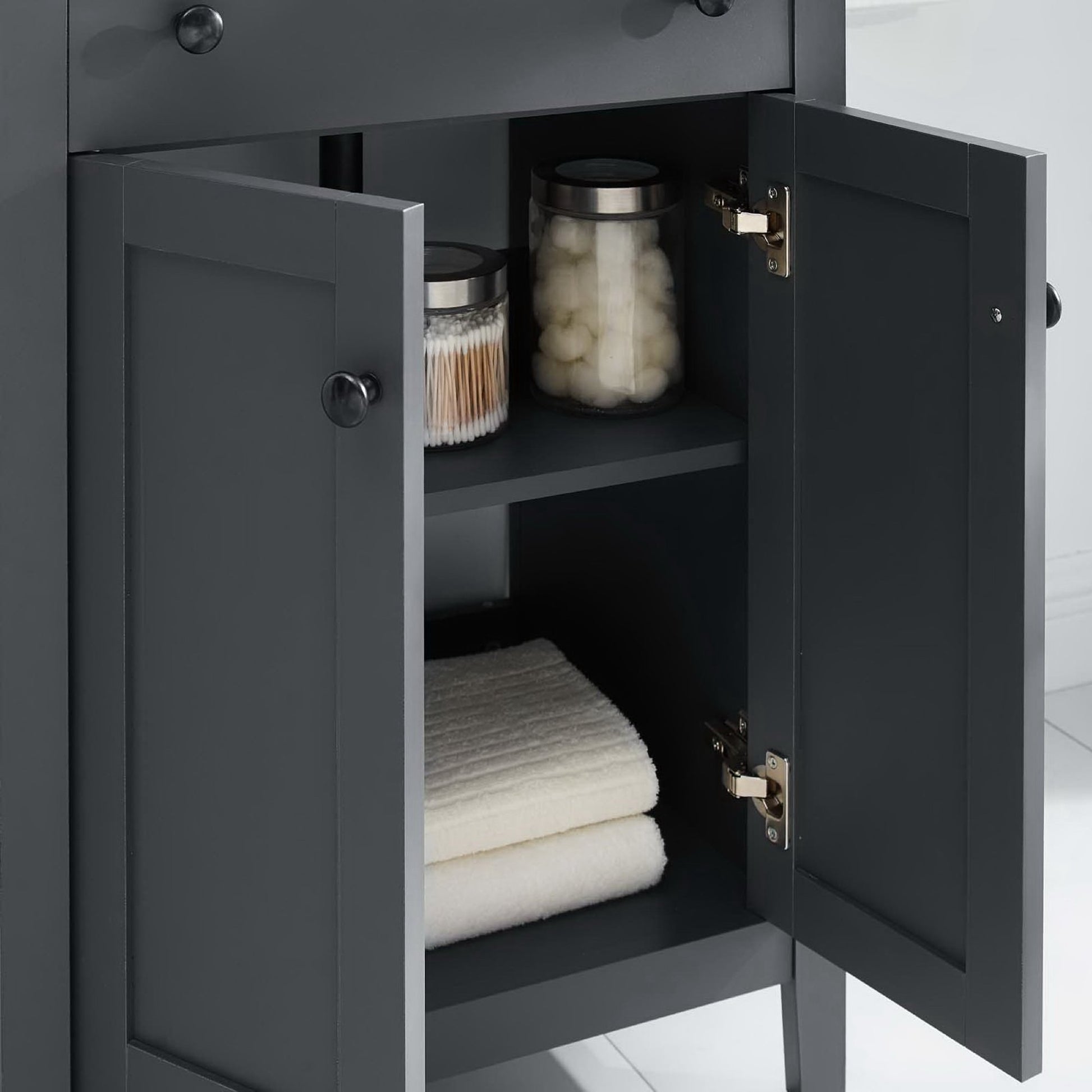 Embrace the subtle sleekness of the Nantucket Bathroom Vanity. Nantucket features crisp lines and a stately design that seamlessly updates your bathroom decor. Solidly constructed from wood and MDF particleboard, the Nantucket Vanity sits on four tapered legs and provides hidden dual storage shelves with soft-close doors. Featuring a curved basin and 8-inch widespread faucet holes, the Nantucket Bathroom Vanity aligns style with function for a modern bathroom. Nantucket comes with non-marking foot caps to protect flooring. Assembly required, fixtures not included.Modern Bathroom Vanity Soft-Close Doors Non-Marking Foot Caps 8" Centerset Faucet Holes Integrated Ceramic Top Assembly Required