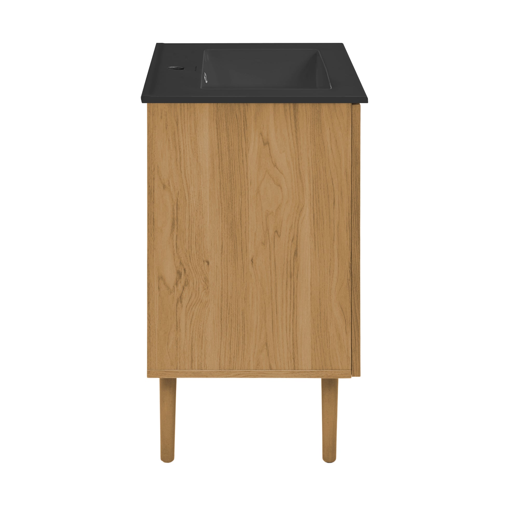 The Bron vanity blends classic sophistication with contemporary design, featuring warm golden oak cabinetry complemented by a modern matte black sink top for a balanced, elevated aesthetic.