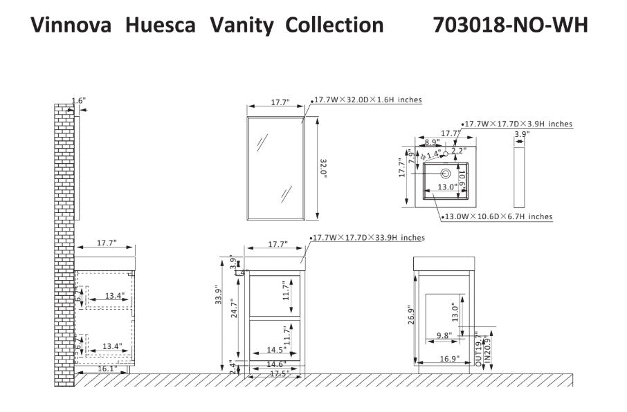 Vinnova, Huesca 18" Single Sink Bath Vanity in North American Oak with White Composite Integral Square Sink Top and Mirror