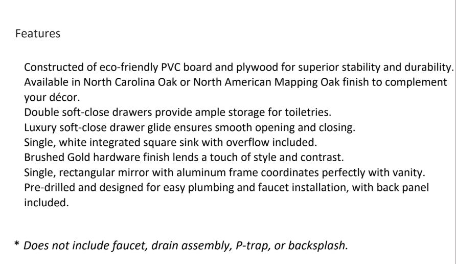 • Matching Mirror Included: Achieve a perfectly coordinated bathroom aesthetic effortlessly, as this vanity comes complete with a mirror designed to complement its sophisticated style.