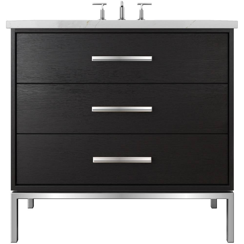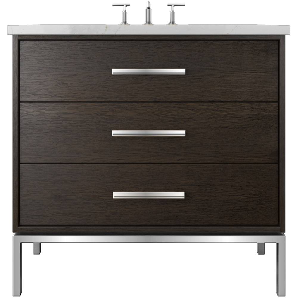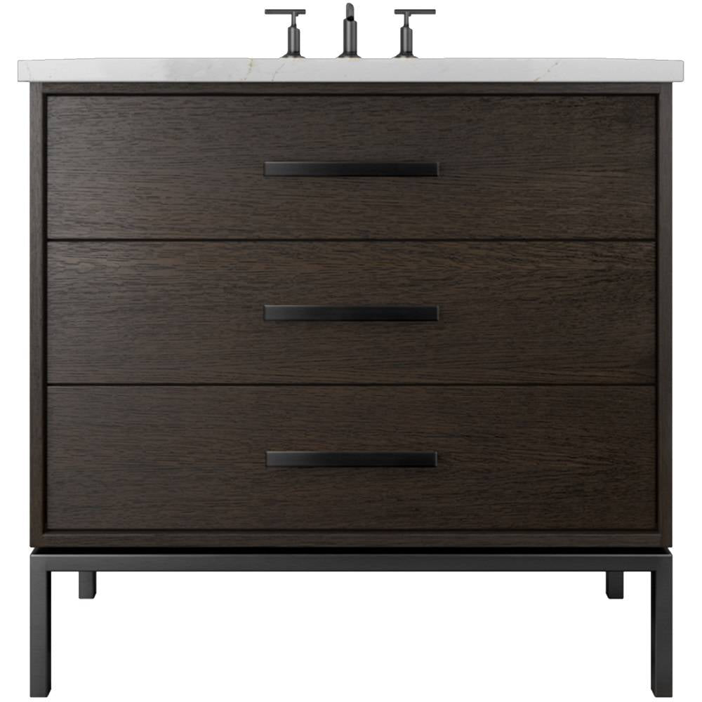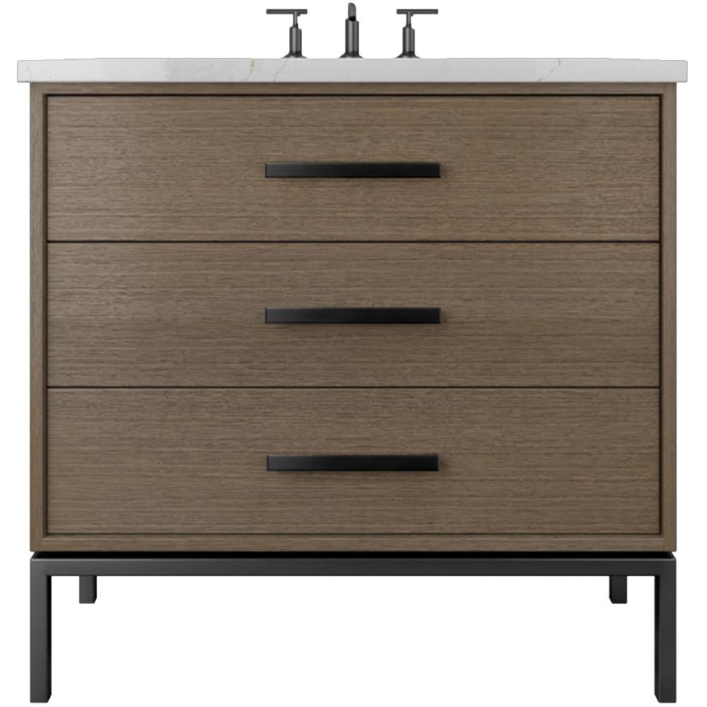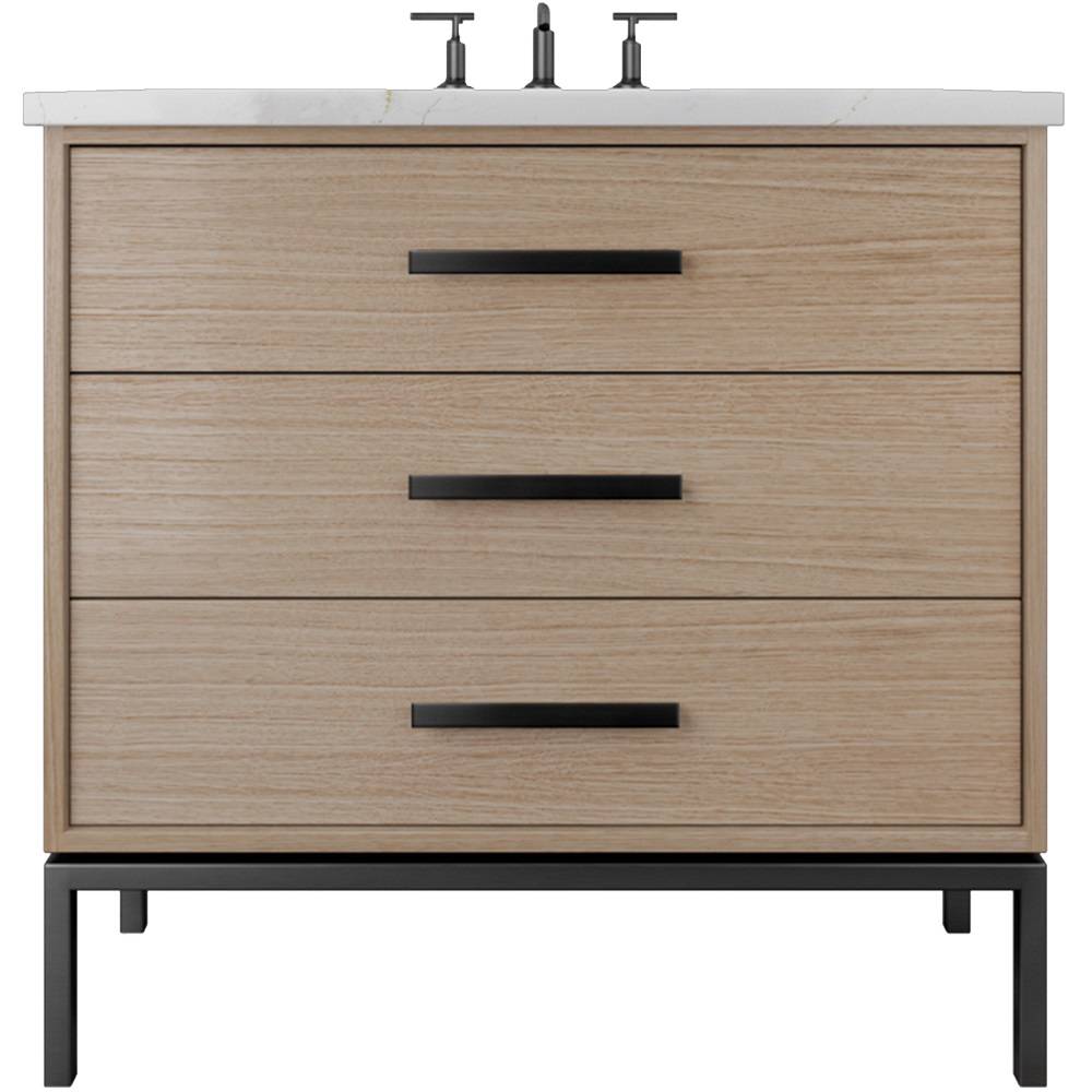 Neo Modern design inspired, oak wood single bath vanity. Featuring 2 functional drawers, designed to clear plumbing, done in a rift cut white oak veneer with a metal base, available in 3 sizes and multiple wood and metal finish combinations.