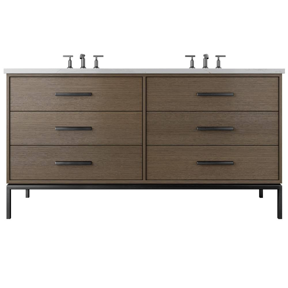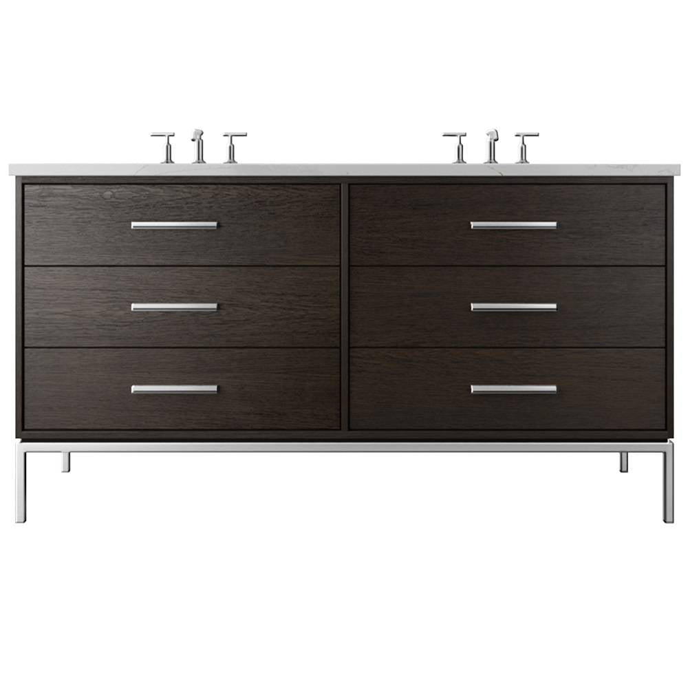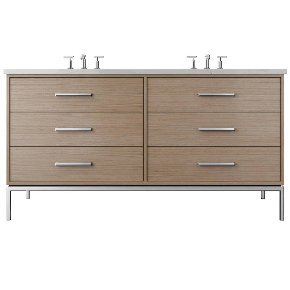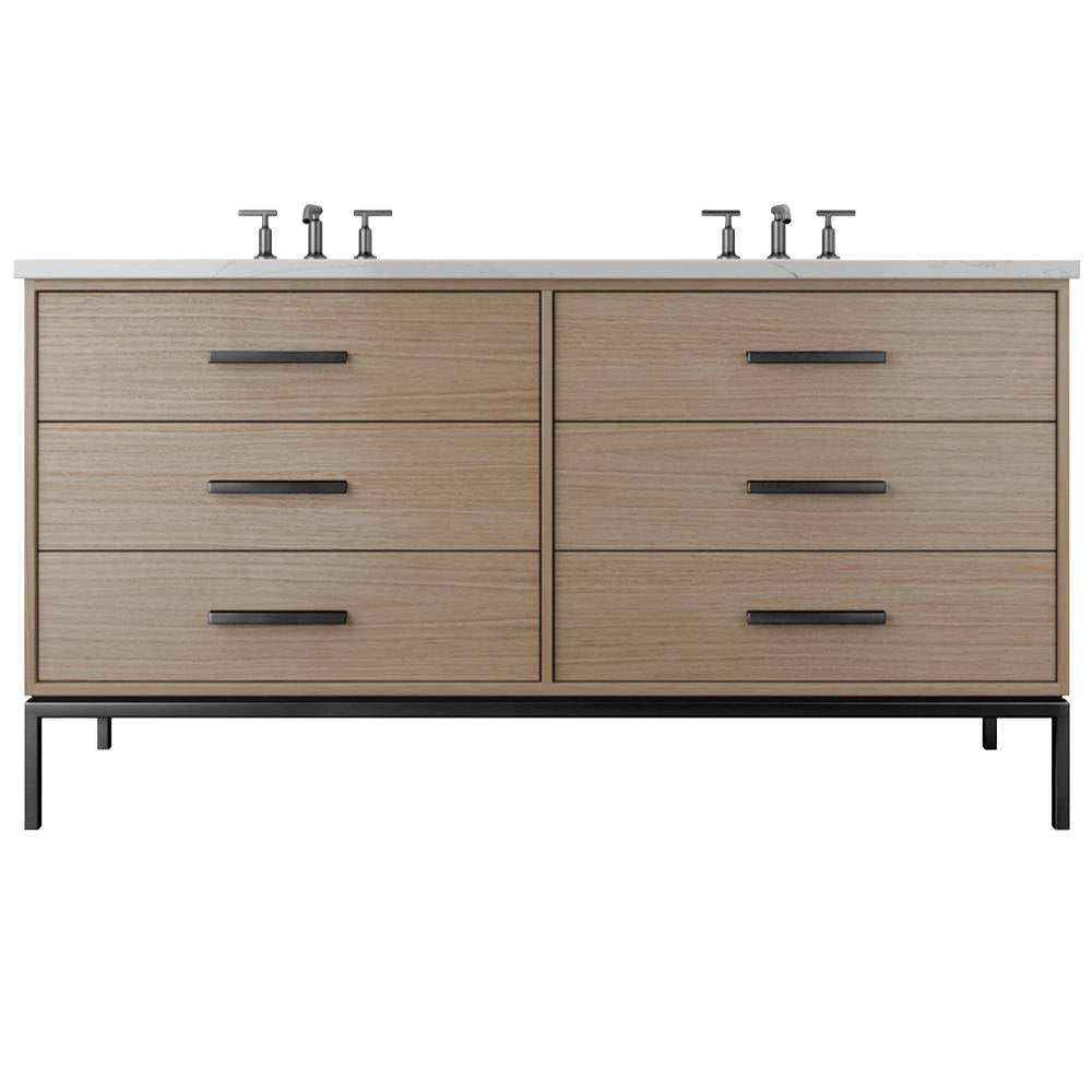 Neo Modern design inspired, oak wood double bath vanity. Featuring 4 functional drawers, designed to clear plumbing , done in a rift cut white oak veneer with a metal base, available in 2 sizes and multiple wood and metal finish combinations.