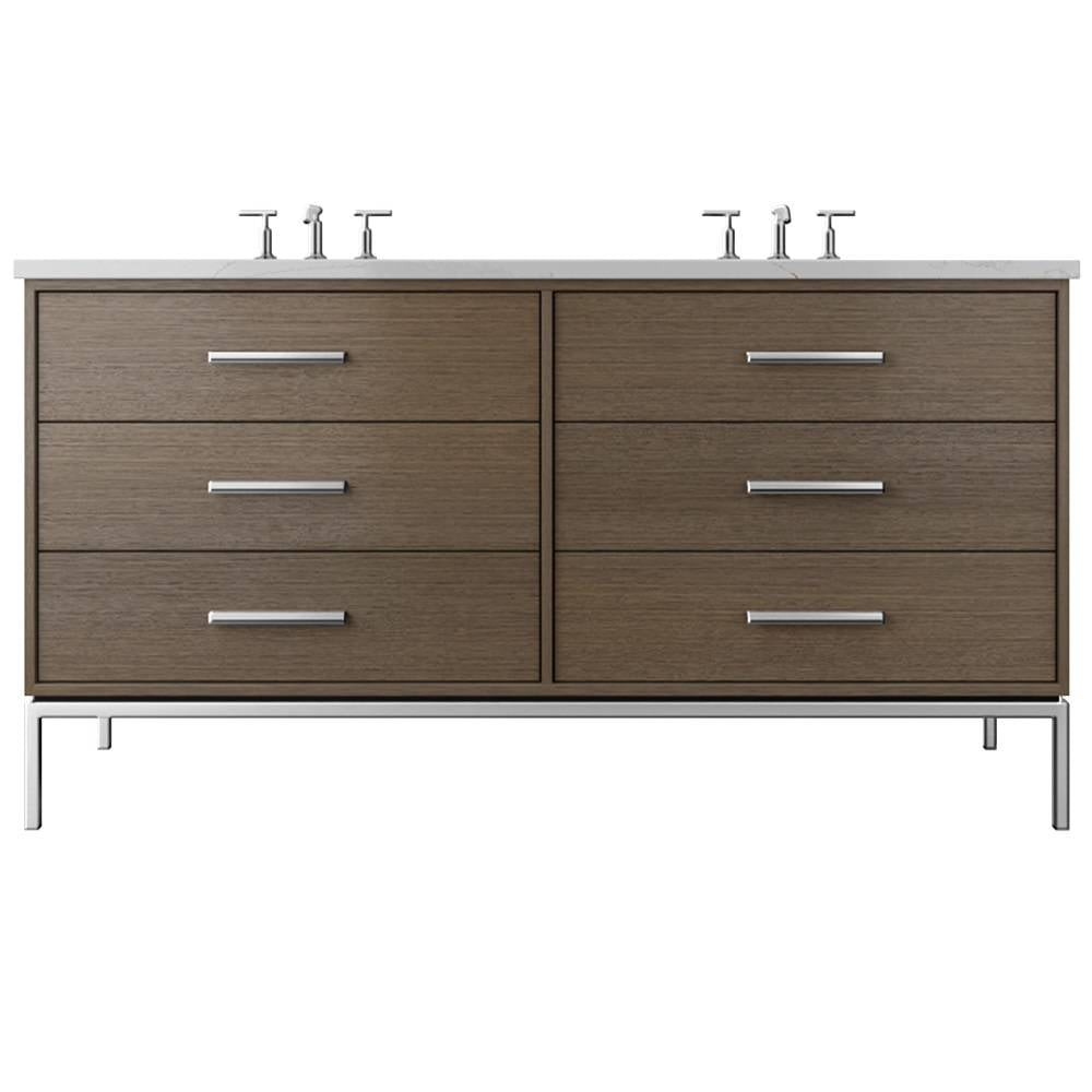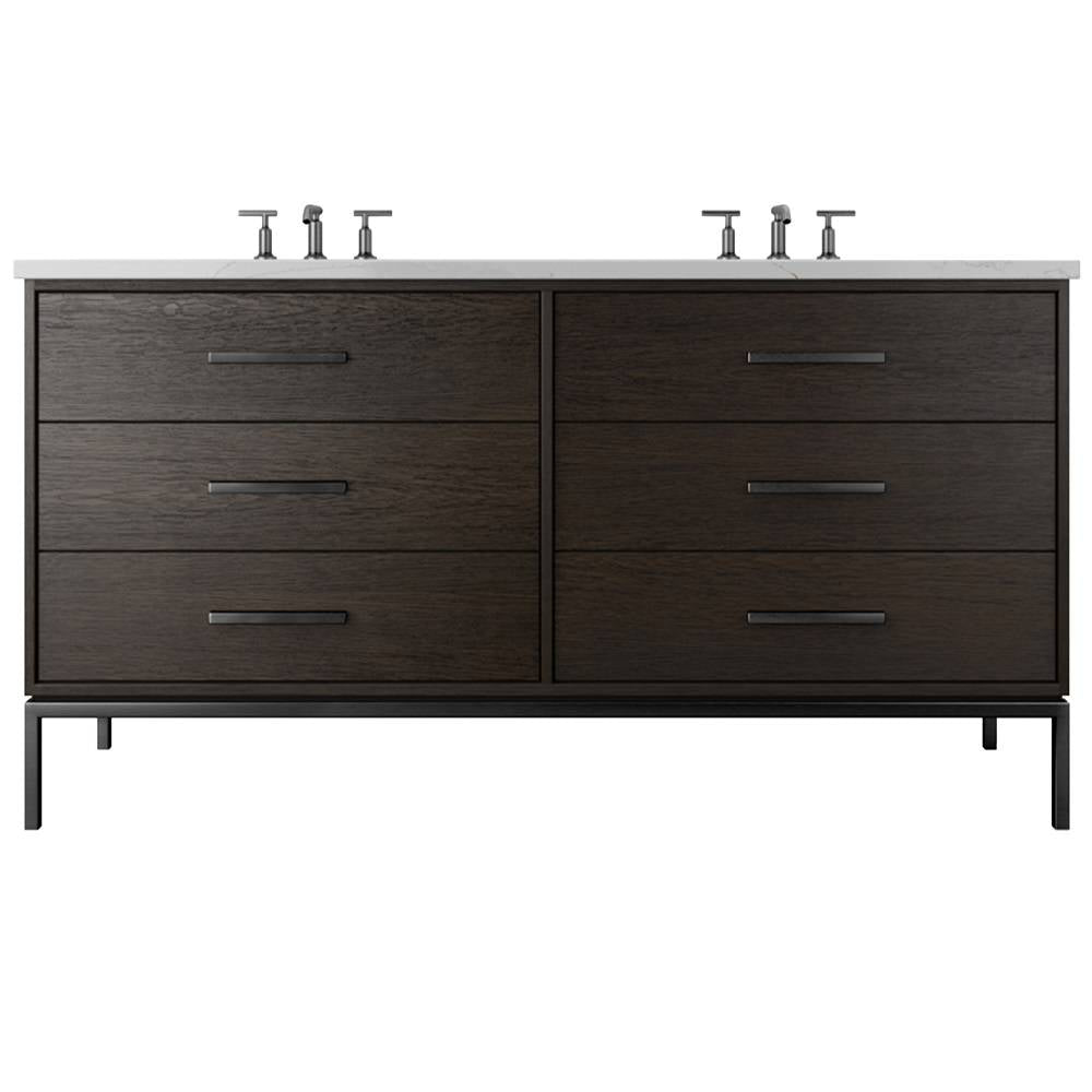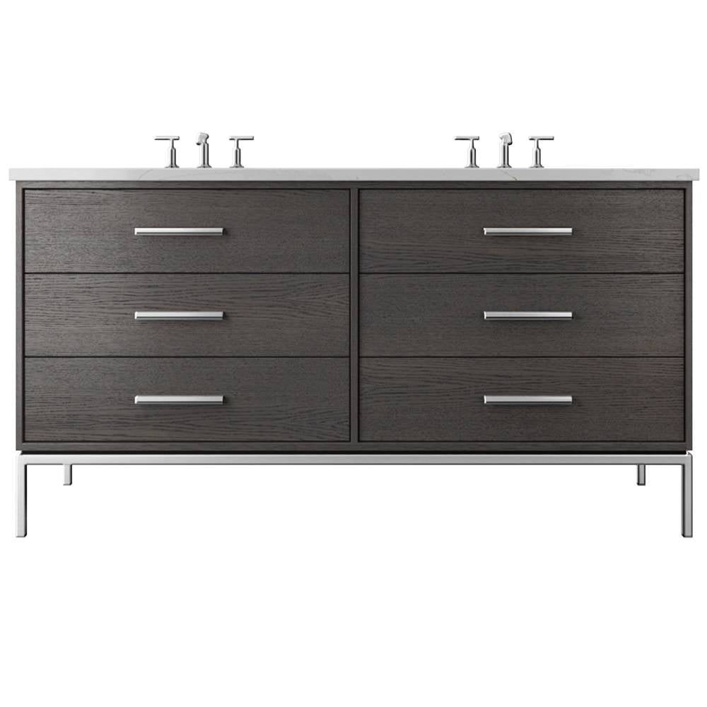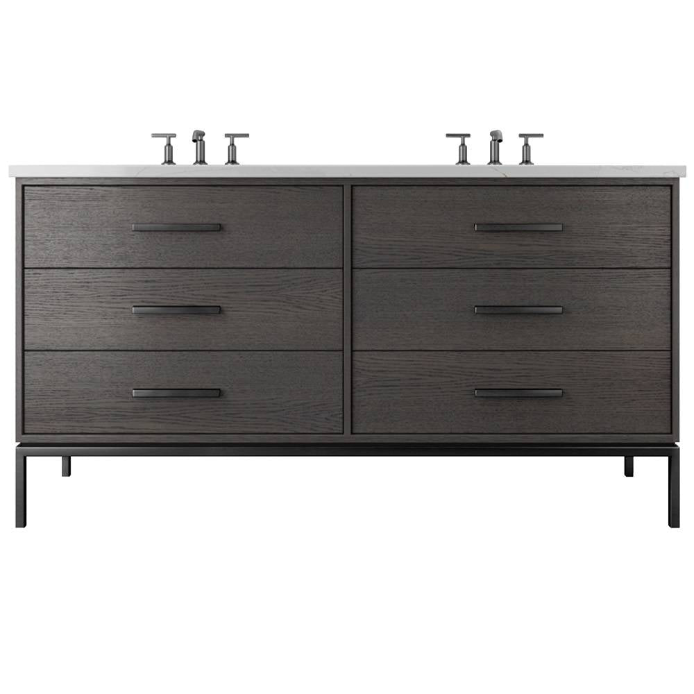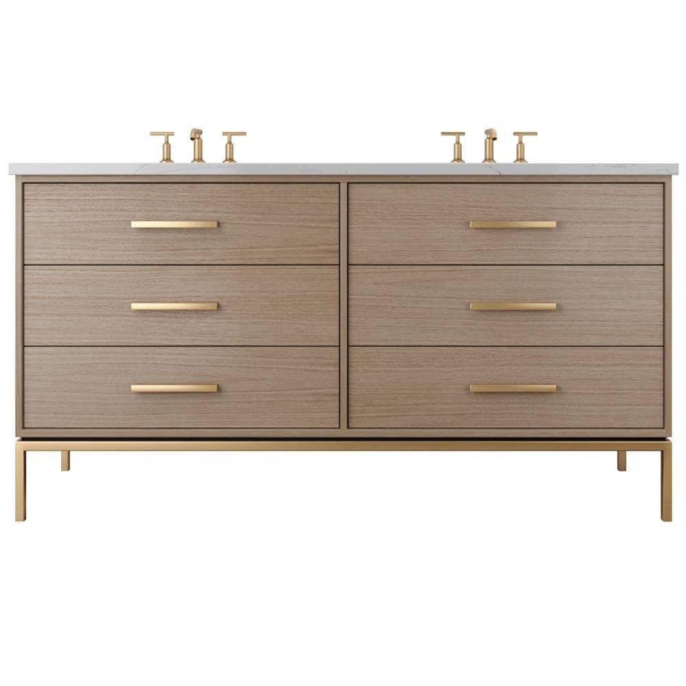 Neo Modern design inspired, oak wood double bath vanity. Featuring 4 functional drawers, designed to clear plumbing , done in a rift cut white oak veneer with a metal base, available in 2 sizes and multiple wood and metal finish combinations.