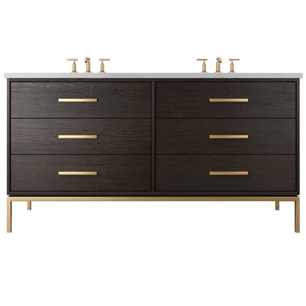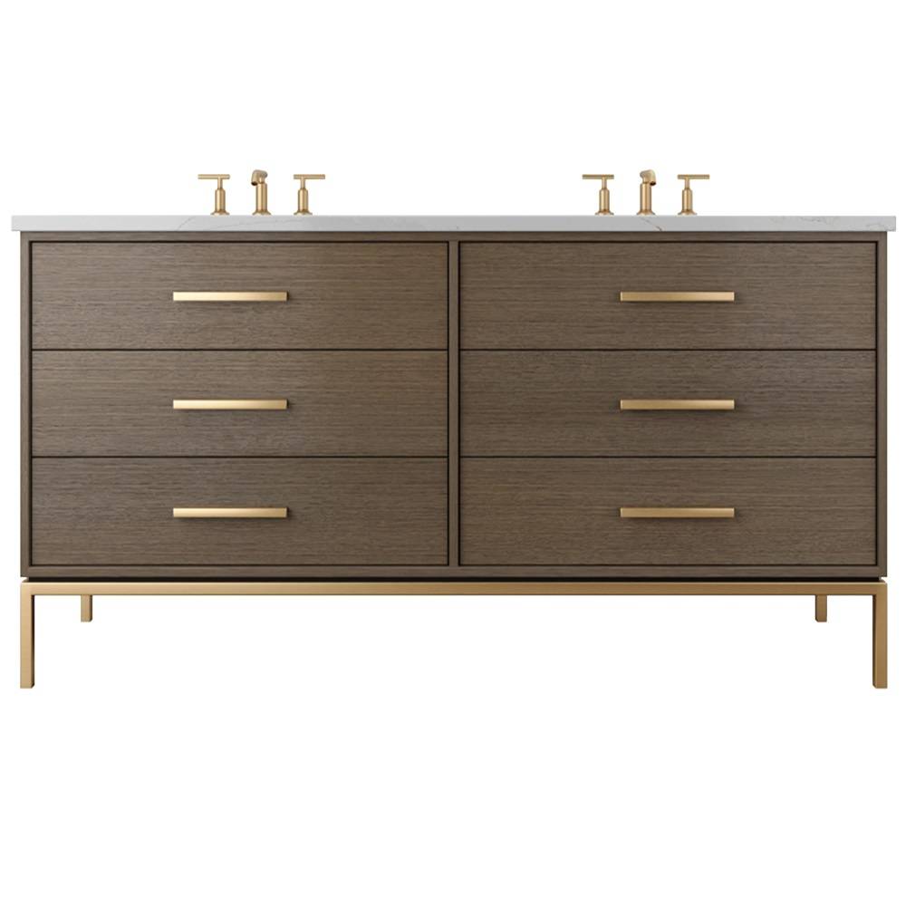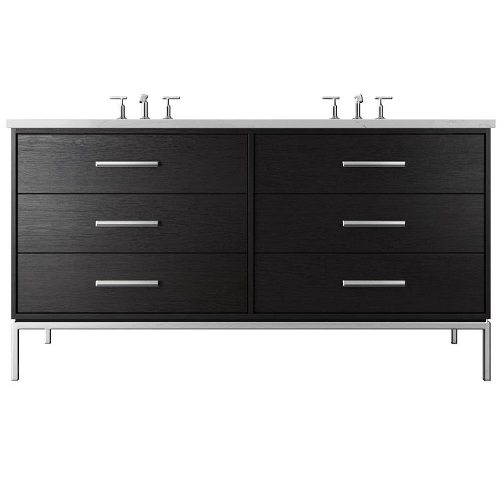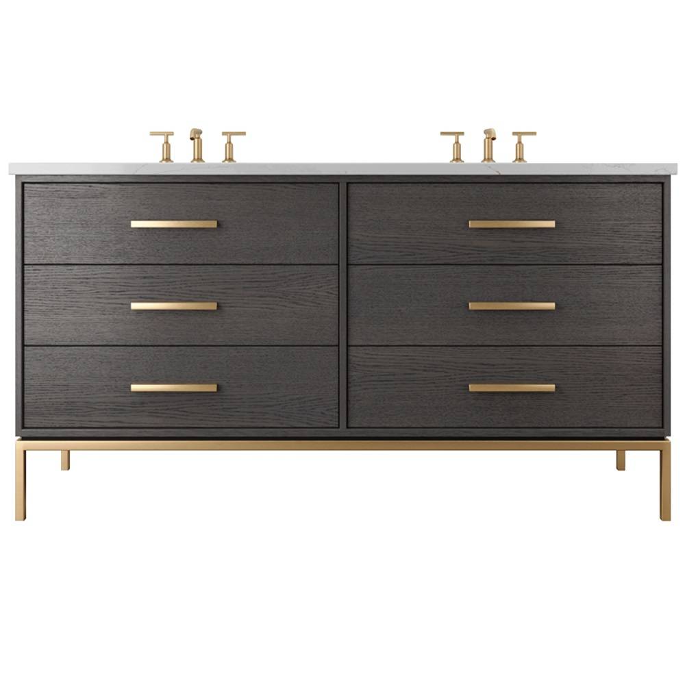 Neo Modern design inspired, oak wood double bath vanity. Featuring 4 functional drawers, designed to clear plumbing , done in a rift cut white oak veneer with a metal base, available in 2 sizes and multiple wood and metal finish combinations.