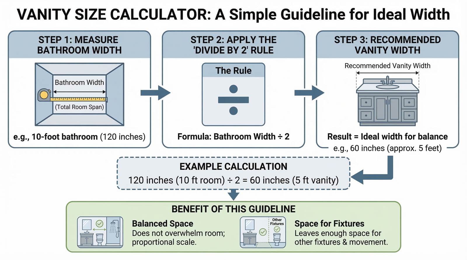 Bathroom width ÷ 2 = Recommended vanity width
