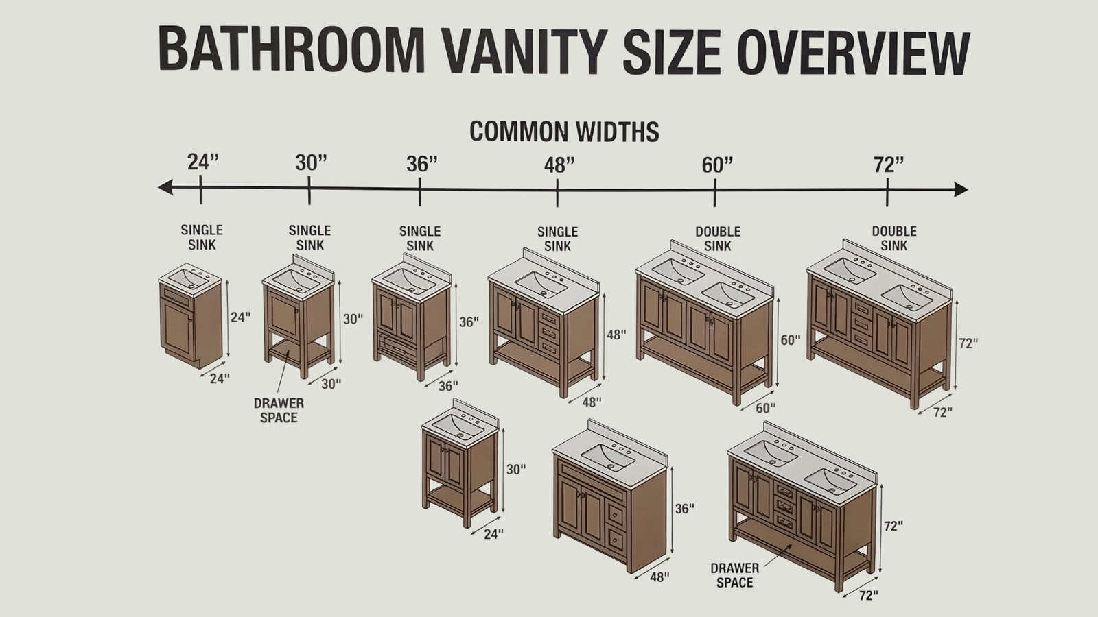 Bathroom vanities are available in several standard widths. Each size is designed to work best in specific bathroom layouts.