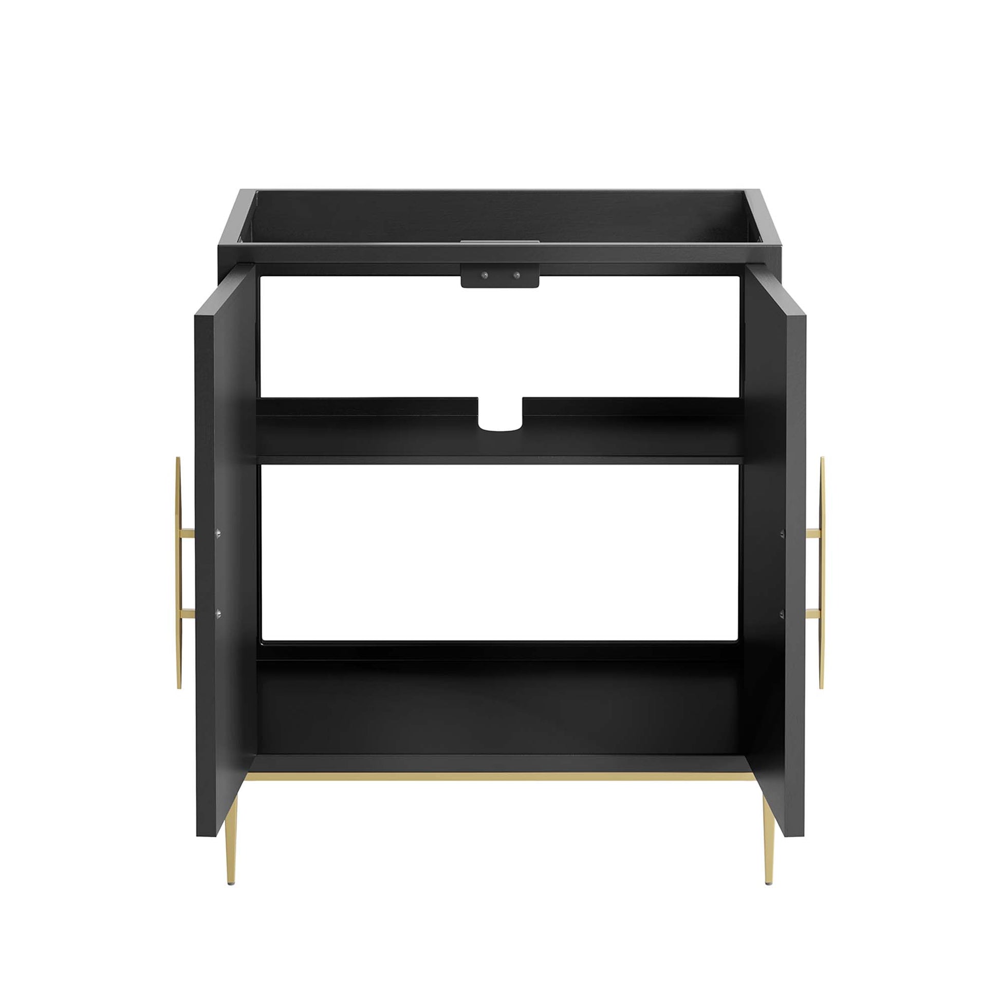 Intricate modernity radiates into your bathroom space with the Awaken 30" Bathroom Vanity Cabinet. Showcasing clean lines arranged in a radial formation, this bathroom vanity is crafted with solid wood and MDF and rests on a gold base with non-marking foot pads to protect flooring. Offering ample storage space for bathroom essentials and more, this vanity cabinet features spacious shelves hidden behind detailed doors with sleek gold hardware. Sink basin and fixtures not included. Assembly required.Modern Bathroom Vanity Cabinet Spacious Storage Solid Wood and MDF Construction Sink Basin Not Included Fixtures Not Included Assembly Required