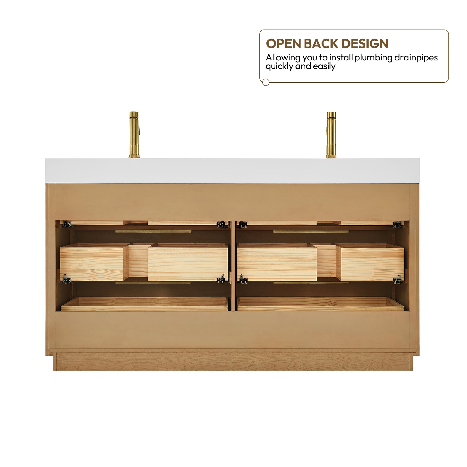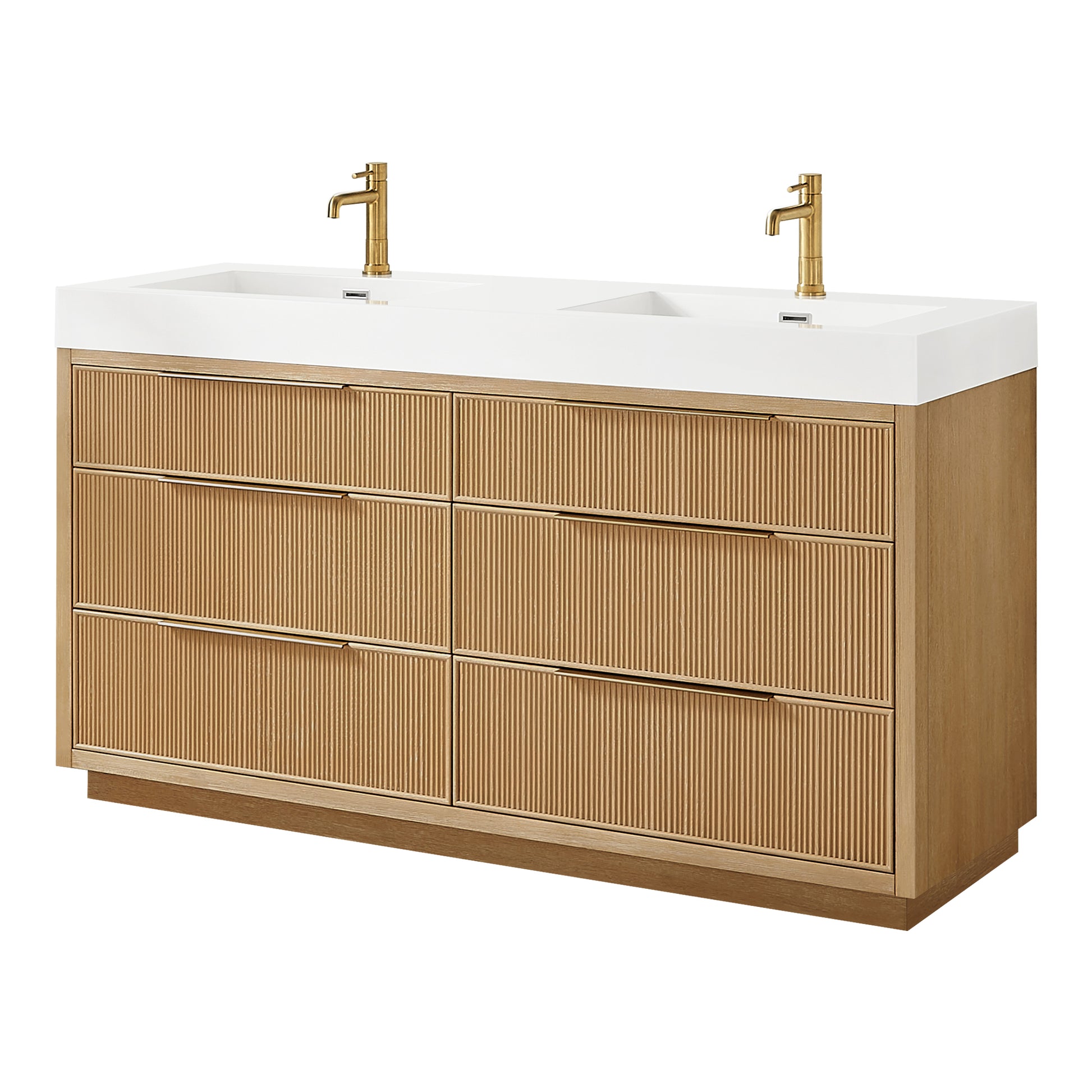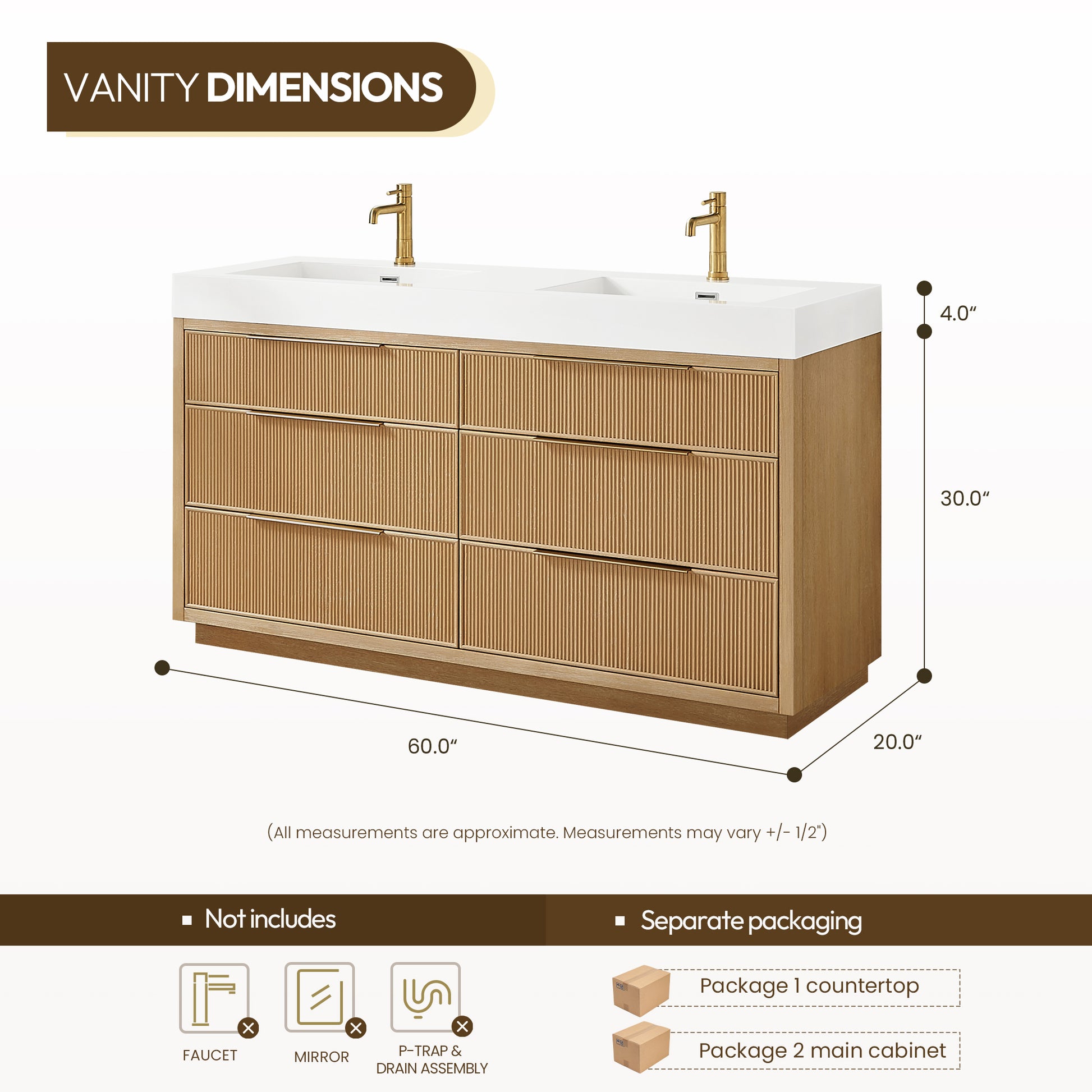 Vinnova, Hohhot 60M" Free-standing Double Bath Vanity in Washed Ash Grey with White Integrated Stone Sink Top
