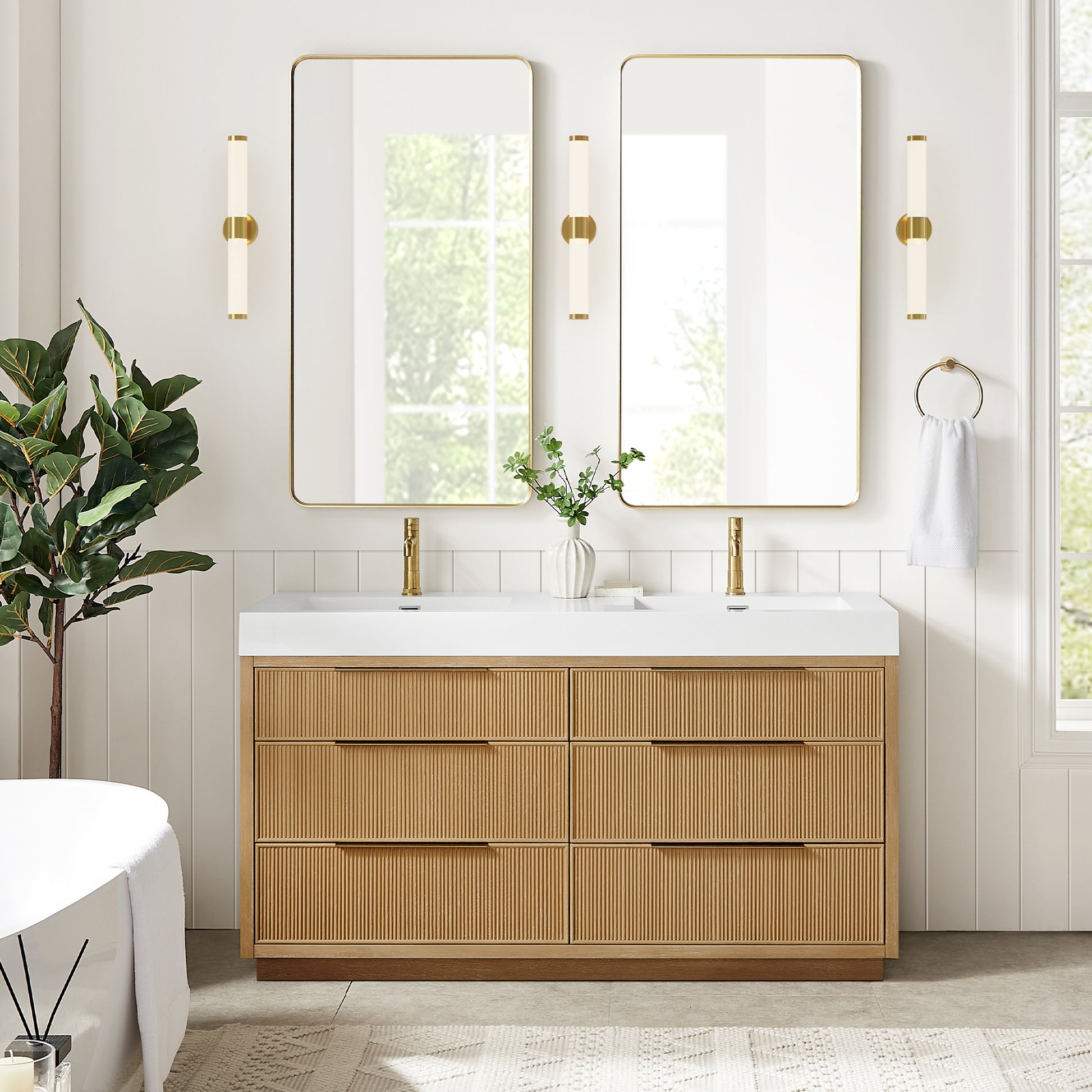 Upgrade your bathroom with the stylish and functional Hohhot 60M Free-standing Double Bath Vanity in Washed Ash Grey with White Integrated Stone Sink Top.