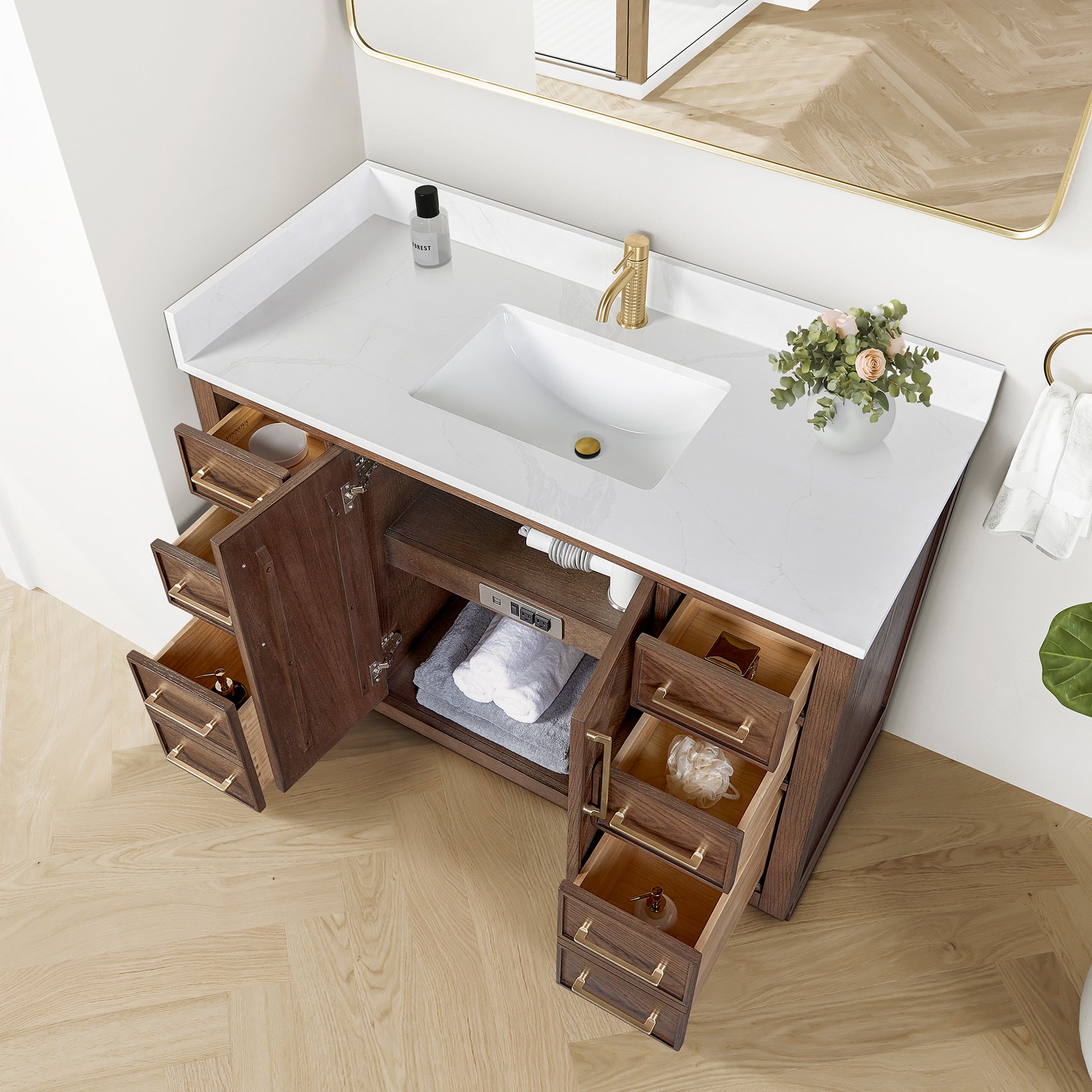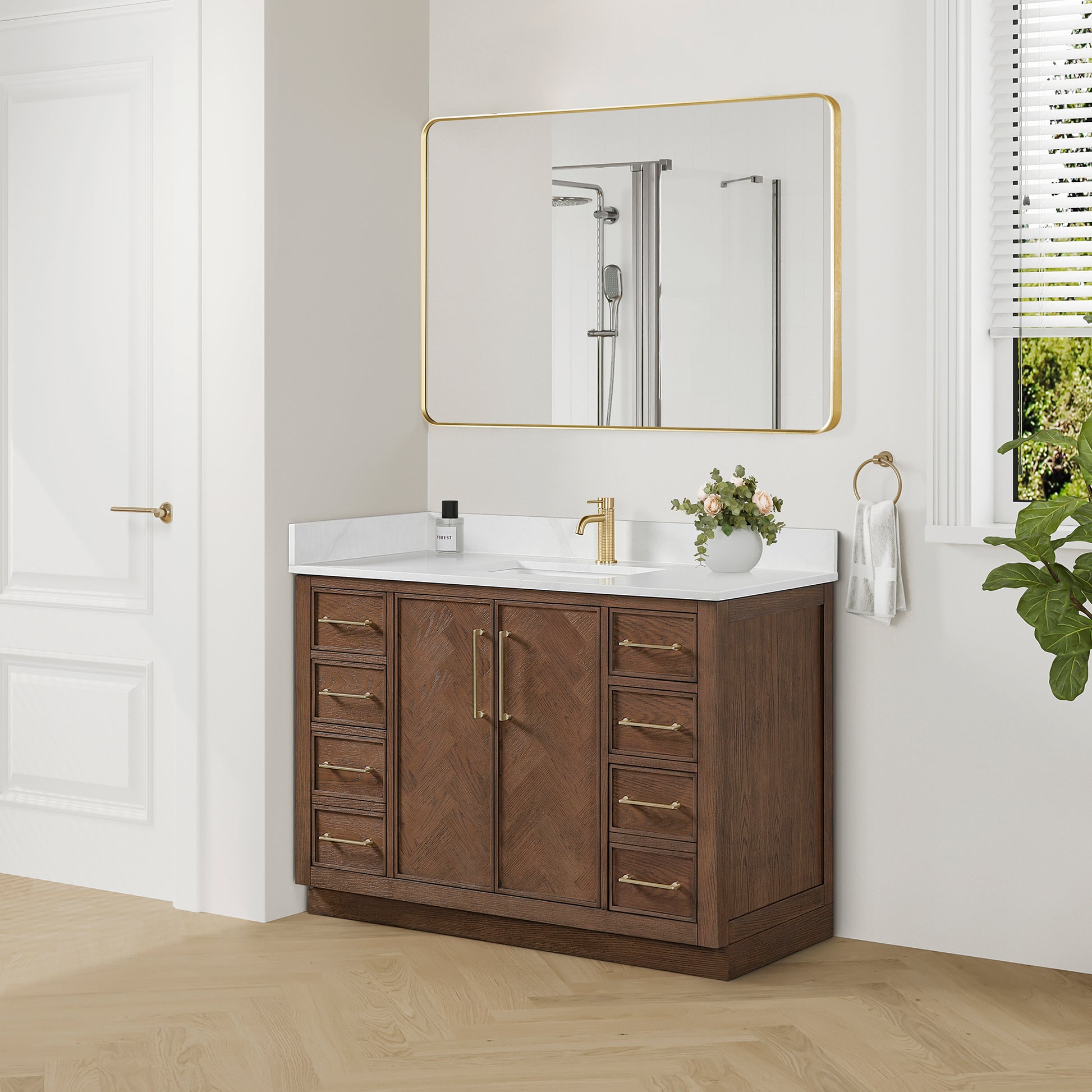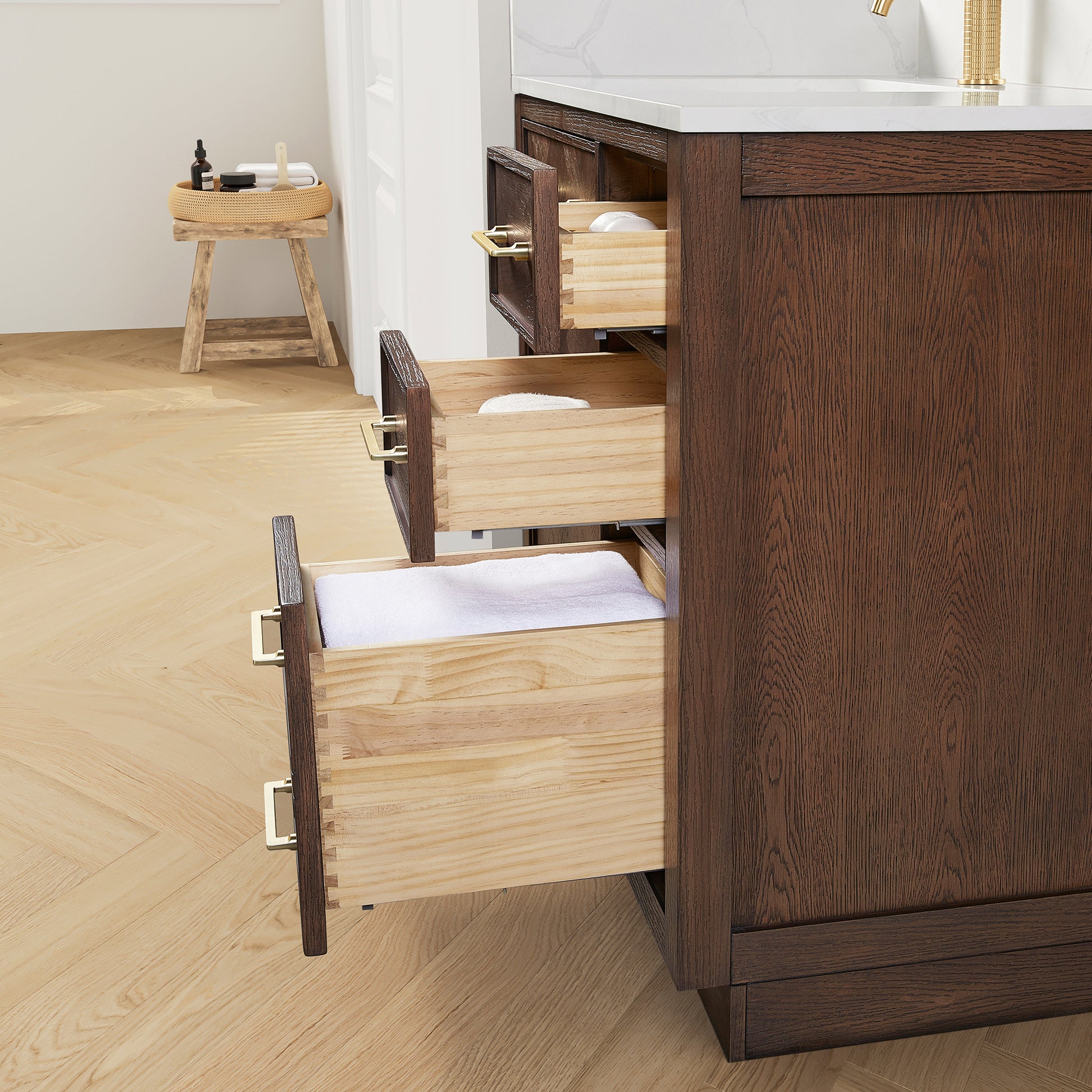 Upgrade your bathroom with the Jakarta 48 Freestanding Single Bath Vanity in Aged Dark Brown Oak with Silk White Quartz Stone Top today.